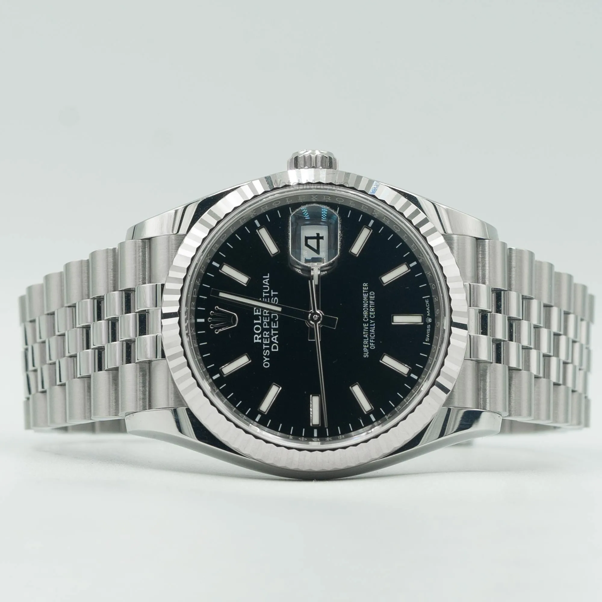 This is a brand-new Rolex Datejust 36mm with a Black Dial. The watch was purchased in 2023 and it comes complete with box and papers. In an unworn condition, this watch is a perfect gifting option or an incredible purchase for yourself. It features a White Gold Fluted Bezel and the Oystersteel case sits on an elegant-looking Jubilee bracelet.
