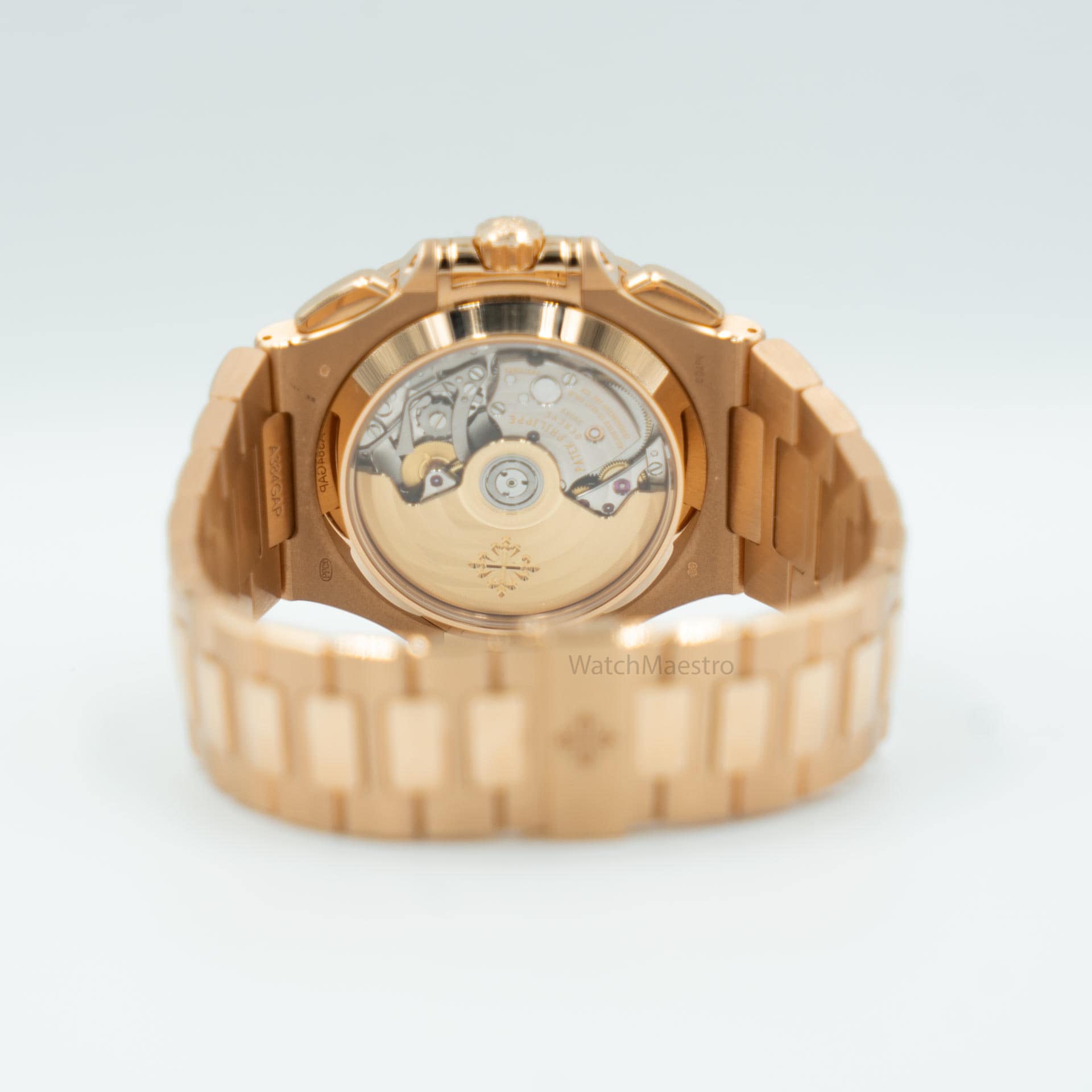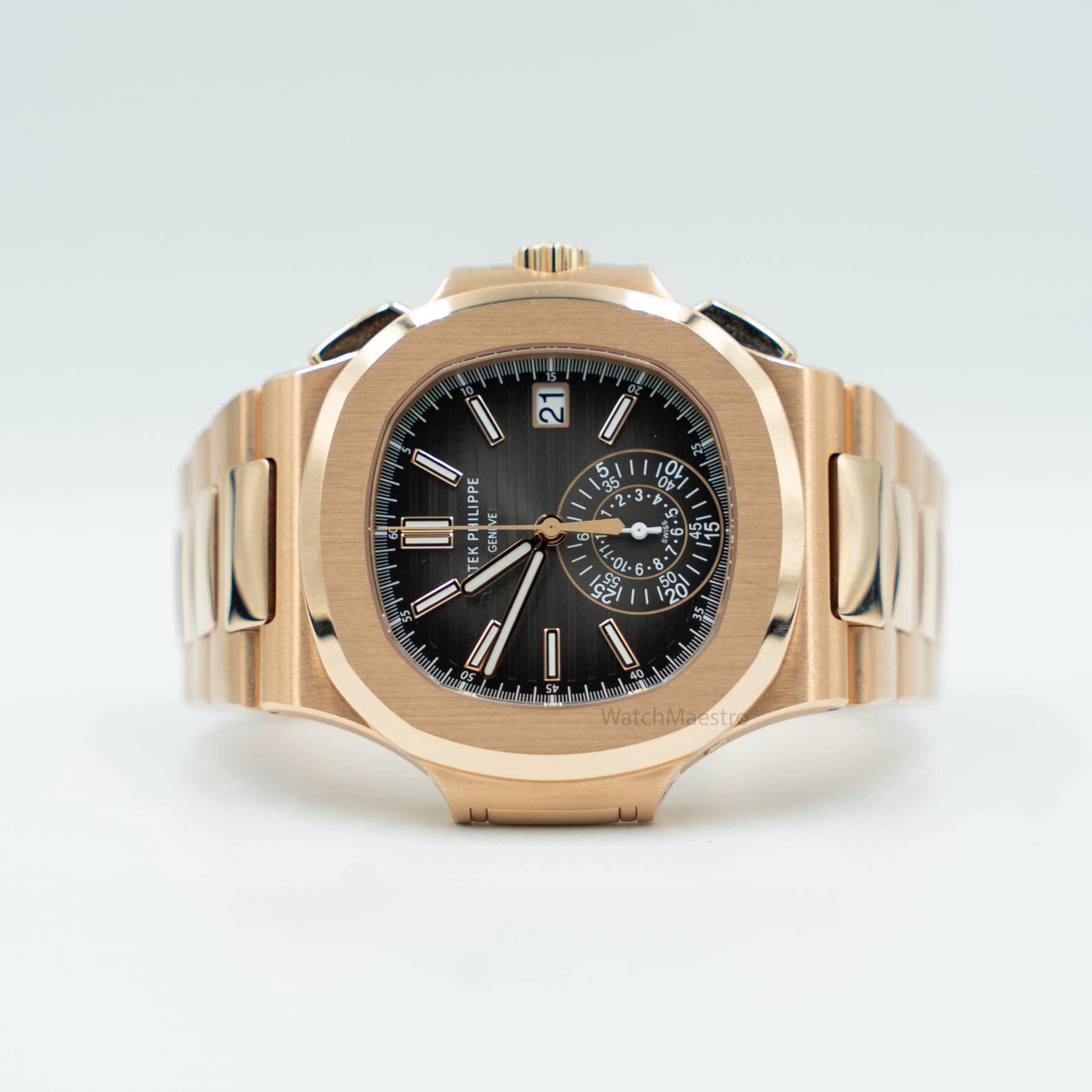 This Patek Philippe 5980/1R-001 is in brand-new condition. The Rose Gold timepiece features a 40.5mm Black Gradient dial. The self-winding wristwatch uses the Caliber CH 28-520 C and offers a power reserve of up to 55 hours. The flyback chronograph watch comes with a 60-minute and 12-hour mono counter.