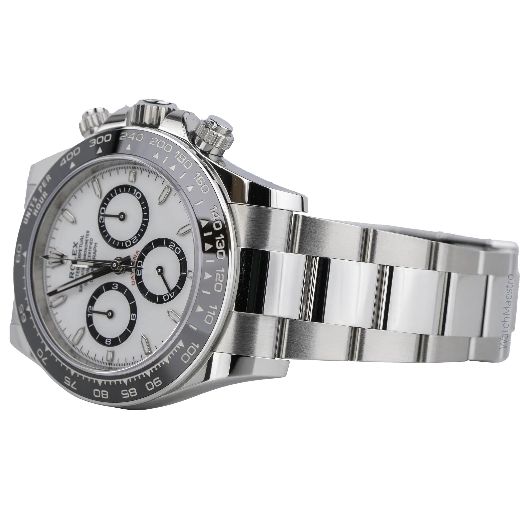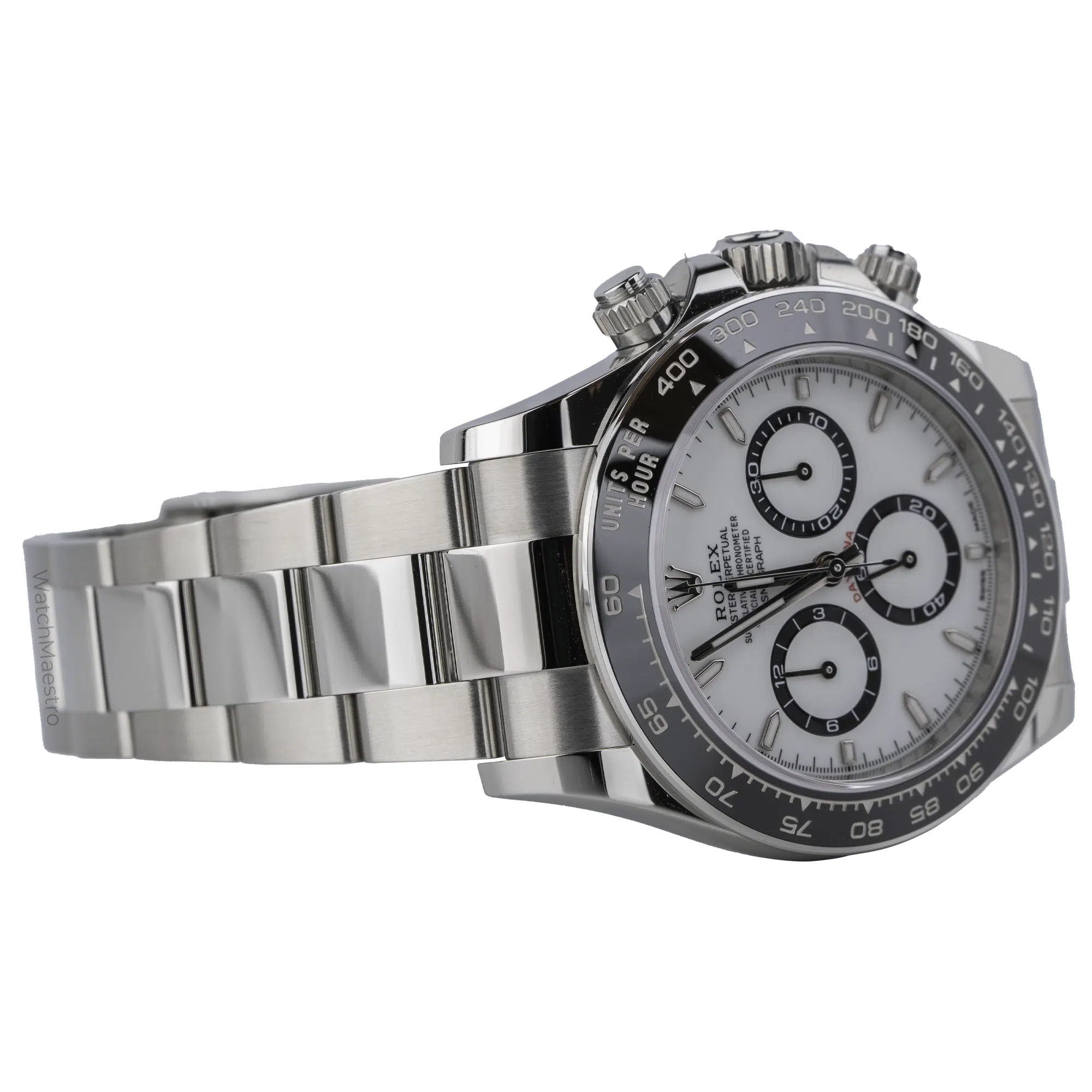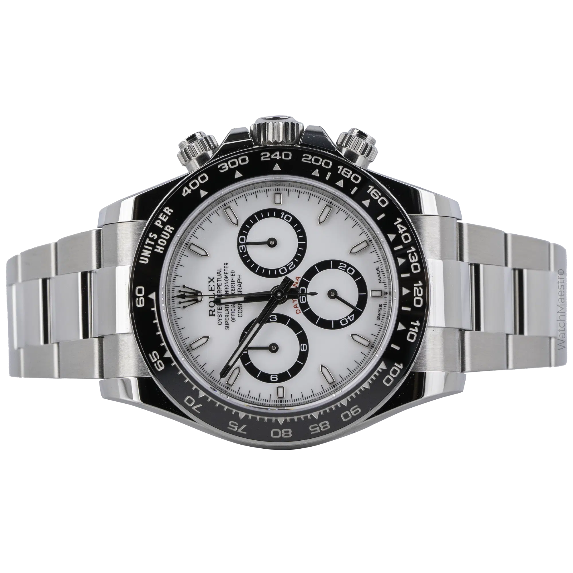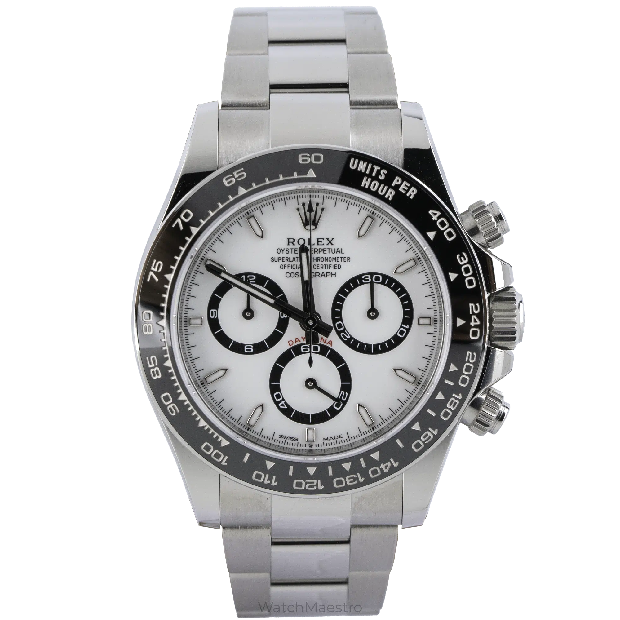 Queued up for 7 years just to get your hands on that Steel Daytona? Get yourself a Rolex Daytona Panda today. This one in particular is was purchased in 2024, comes complete with box and papers and it is still in a brand-new condition. Sheltered under the 5-year Rolex warranty, this timepiece features a White Dial with Black outlining on the sub-dials resembling the facial markings of a panda, hence the nickname. This classic configuration not only enhances readability but also adds a timeless and sporty aesthetic to the Rolex Daytona. This is a Rolex watch that you can enjoy wearing every day both with casual outfits as well as business attire.