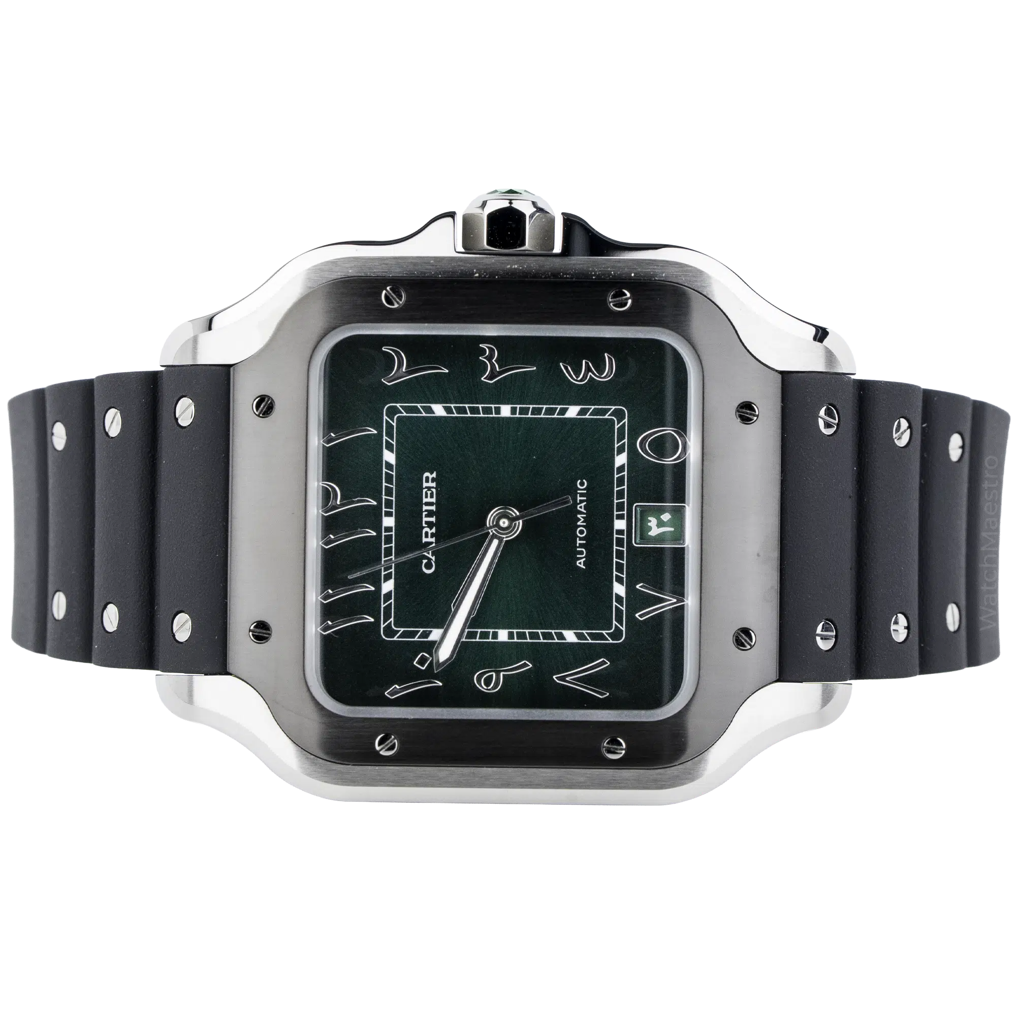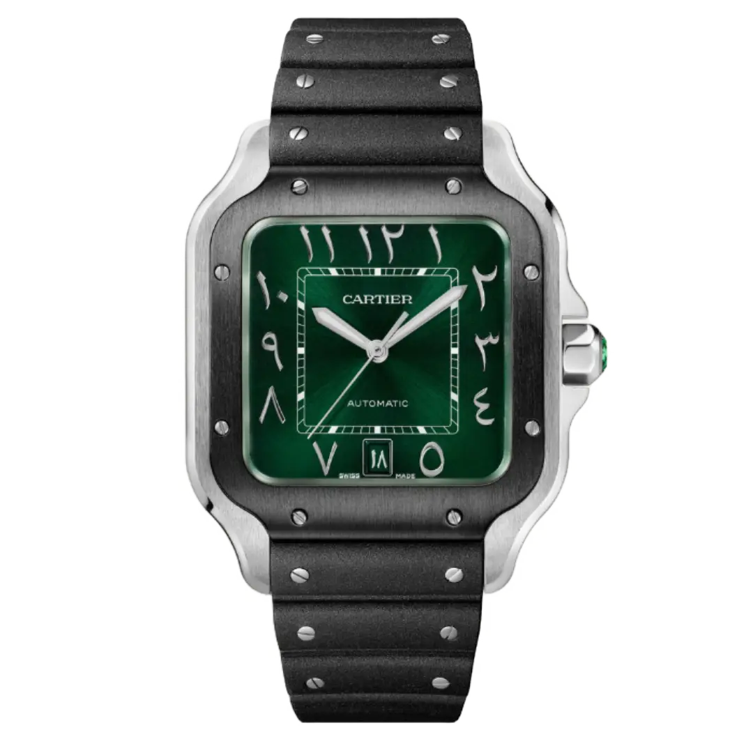 If you are looking for a Cartier Santos that stands out of the crowd – then this is the one to get! The Cartier Santos with a Green Arabic Dial and ADLC bezel is a bold, modern interpretation of one of Cartier’s most iconic timepieces. The vibrant green dial features stylized Arabic numerals. The black ADLC (Amorphous Diamond-Like Carbon) bezel provides a tough, scratch-resistant finish that enhances the watch’s sporty character. The black rubber strap completes the contemporary look, offering comfort and versatility for everyday wear. Purchased in 2025, the watch comes complete with box and papers.