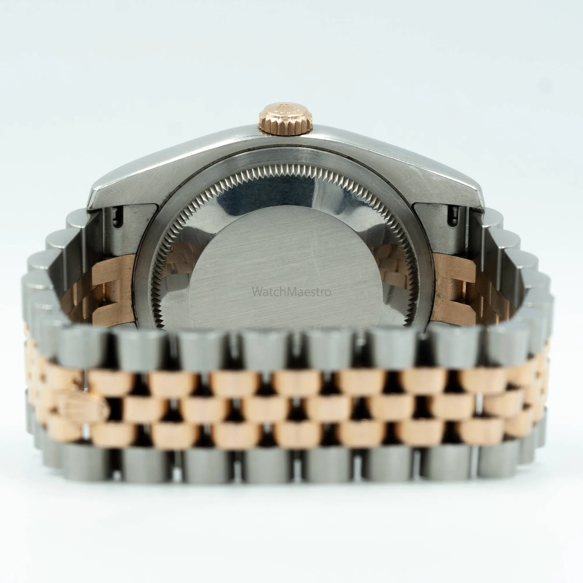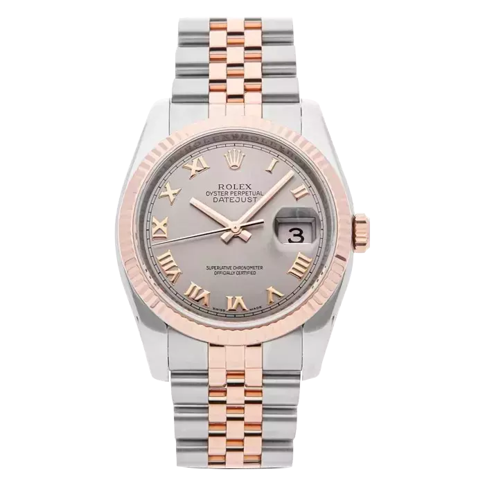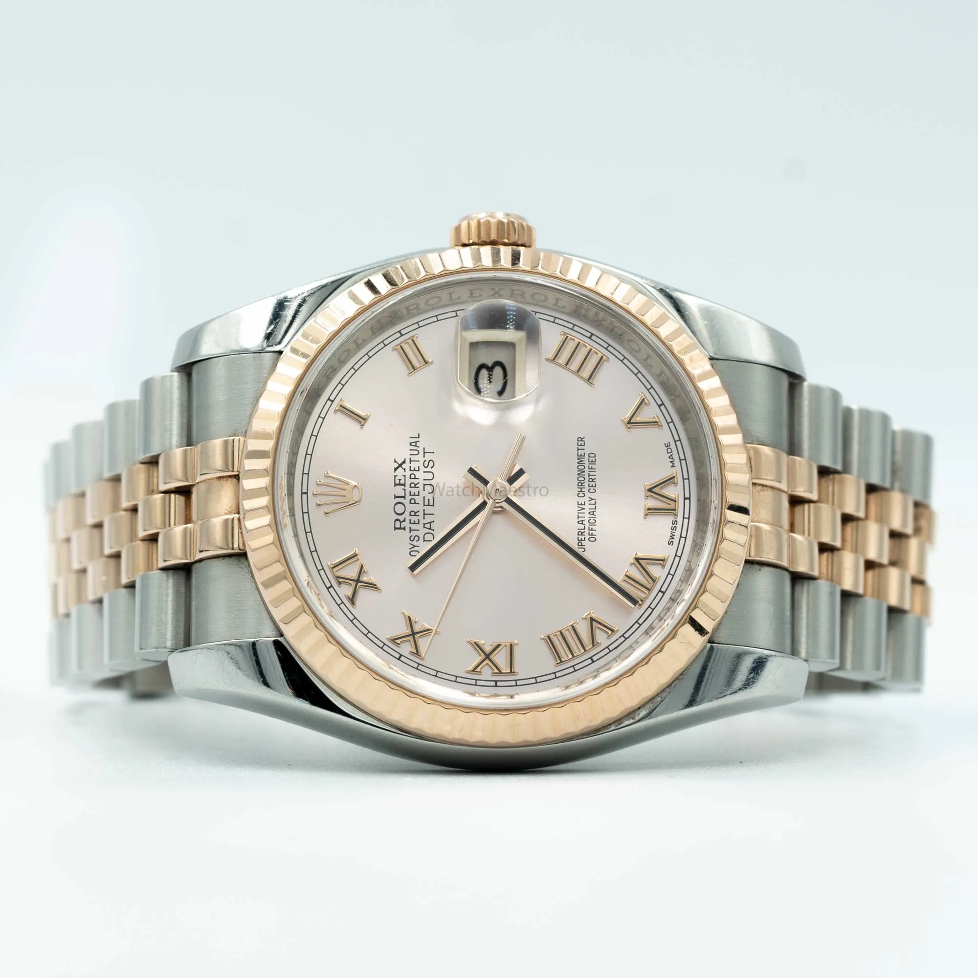 Rolex Datejust reference 116231 has been discontinued, making it even more desirable. As soon as a Rolex watch is discontinued, it is considered a collectible by watch enthusiasts. The Pink Roman dial on this one goes perfectly well with the two tone Jubilee bracelet.
