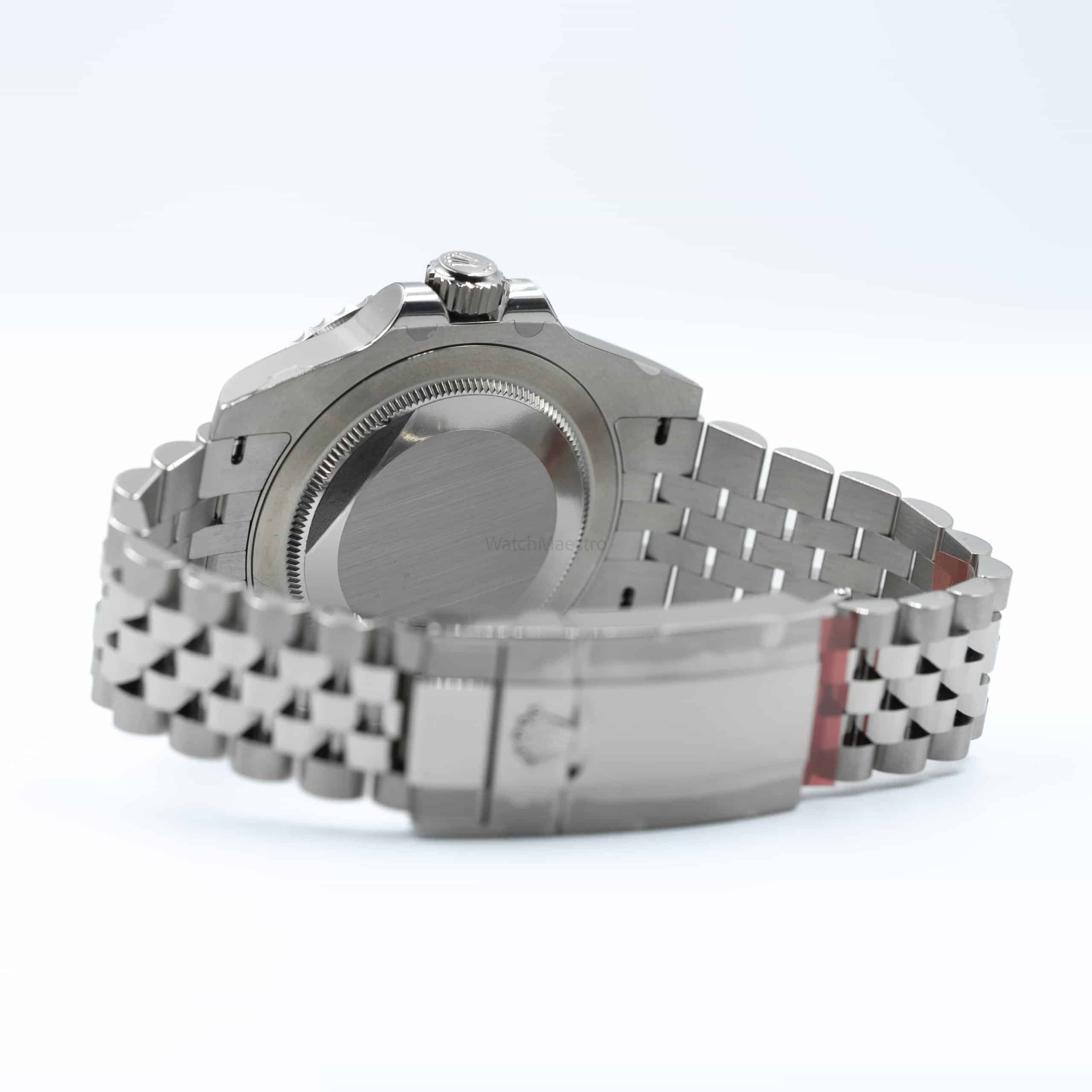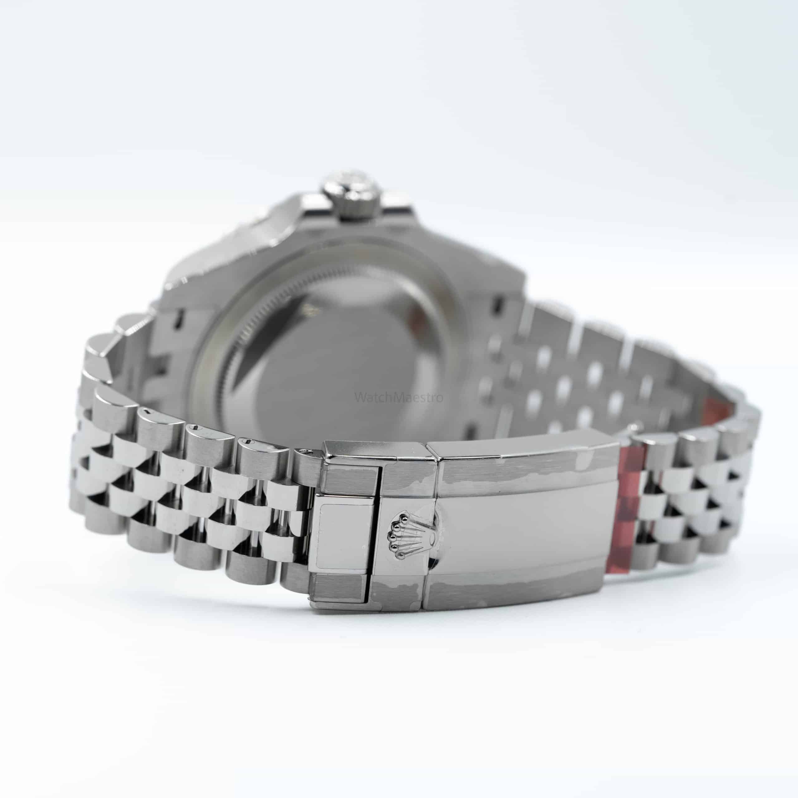 This is a brand-new yet unused Rolex GMT Master II with a 40mm black dial. It is made out of the exceptionally durable and reliable Oystersteel and it features a Jubilee bracelet. Its unique nickname ‘Batman‘ comes from the iconic blue and black bezel, which has appealed to a lot of watch enthusiasts. The watch houses the Caliber 3285 movement that allows travelers to easily adjust their local time using the winding crown.