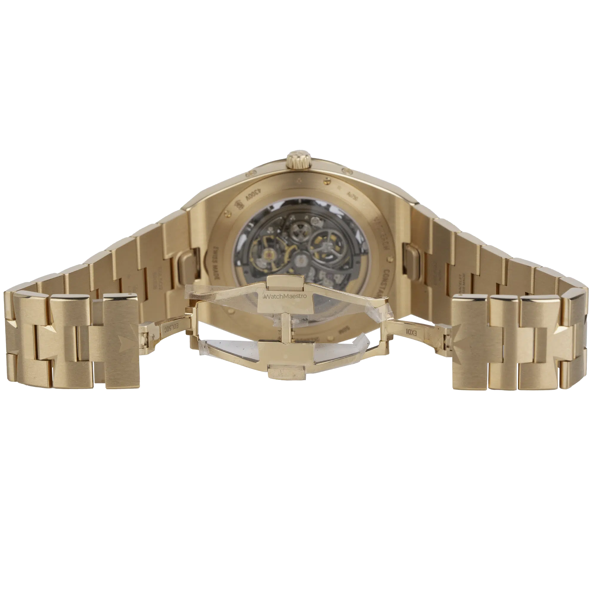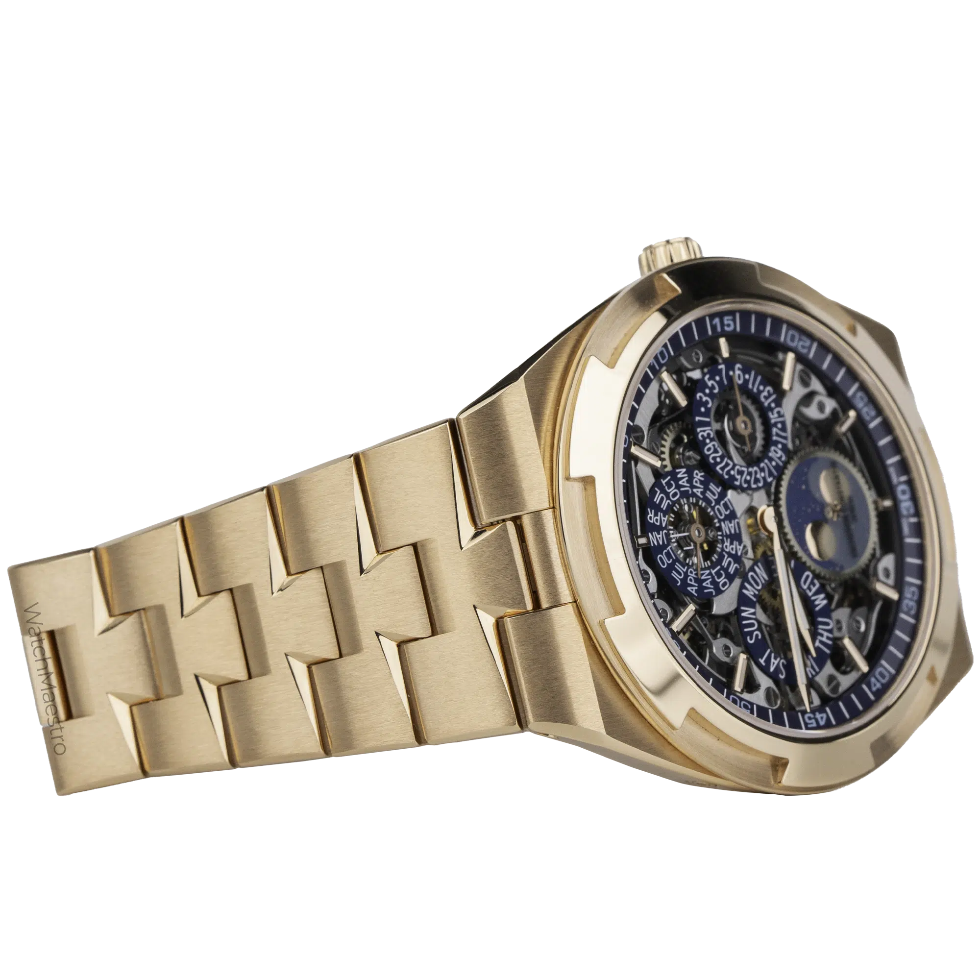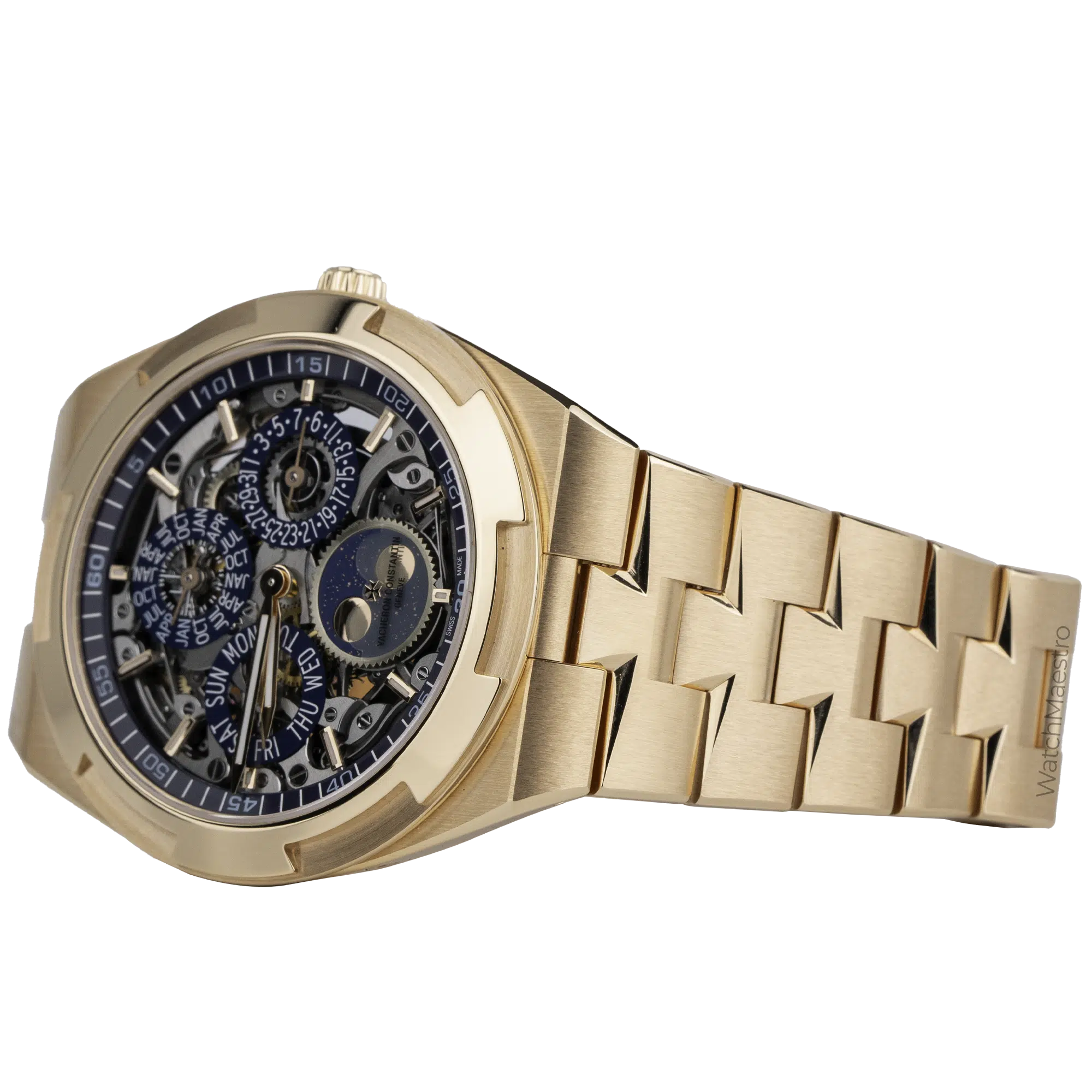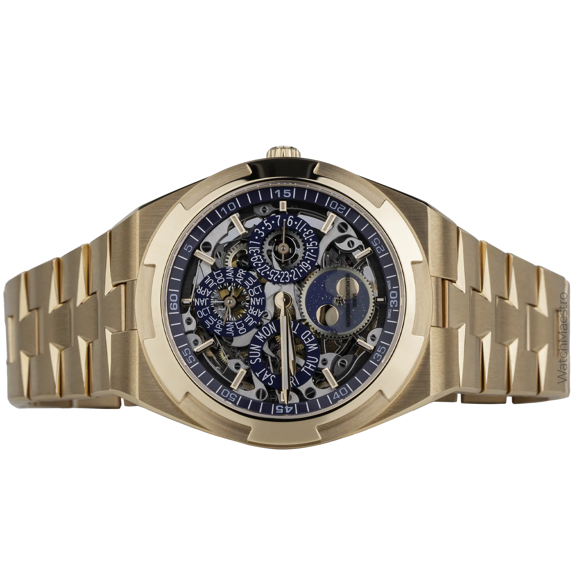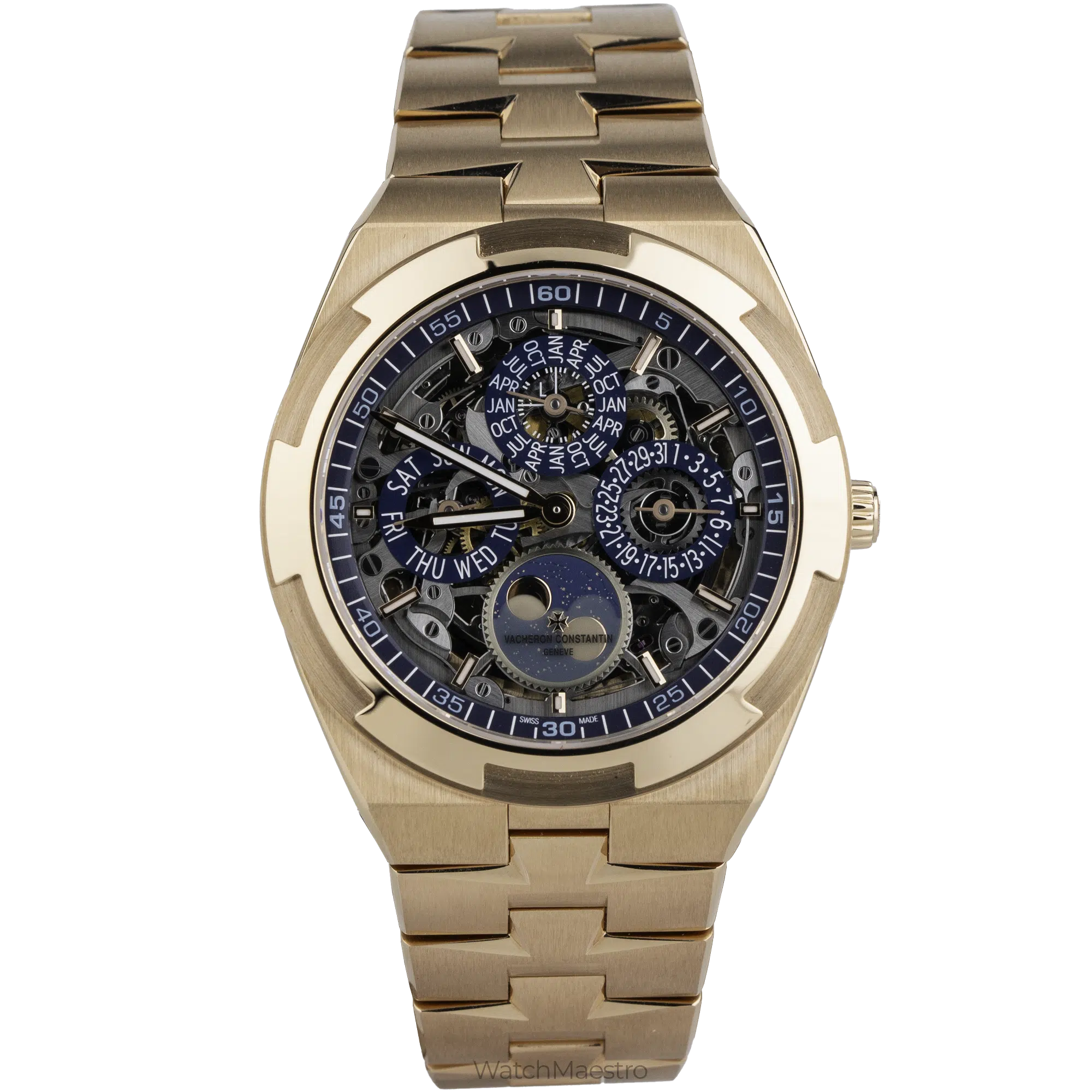 Introducing the Vacheron Constantin Overseas Perpetual Calendar Ultra-Thin Skeleton in Rose Gold. This extraordinary timepiece is engineered to be accurate until the year 2100, which means you do not have to worry about setting the calendar again and again as long as you put it on a winder. With an ultra-slim profile at just 8.1mm thick, this watch combines sophistication with a modern aesthetic. The skeletonized Blue dial offers a mesmerizing view of the intricate perpetual calendar mechanism, complemented by a transparent sapphire crystal case back. The watch is paired with a Rose Gold Bracelet and also includes a Blue Calf Skin Leather Strap and a Dark Blue Rubber Strap, all easily interchangeable to suit your style. Brand new and freshly picked up from the boutique in 2024, this watch is complete with its box and papers.