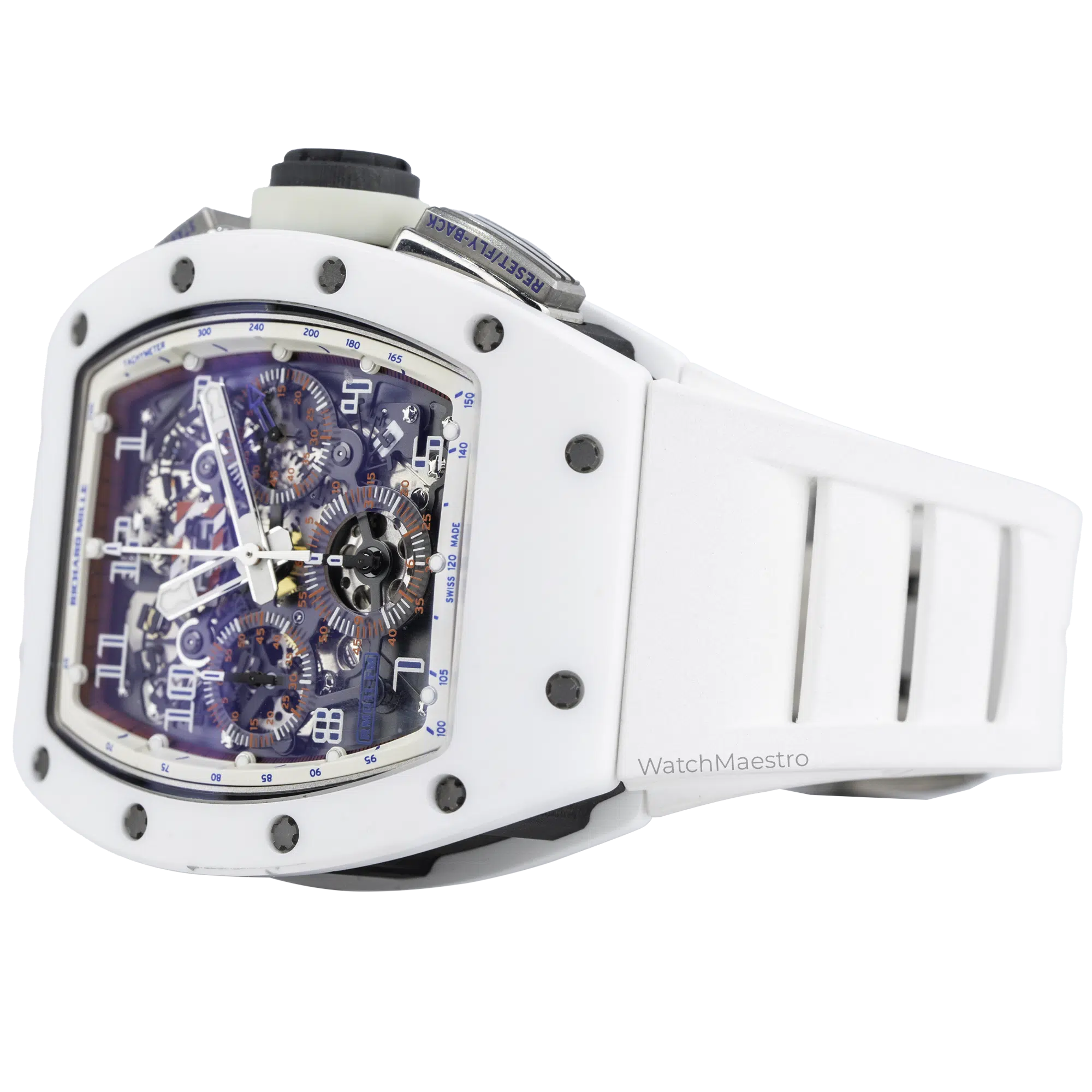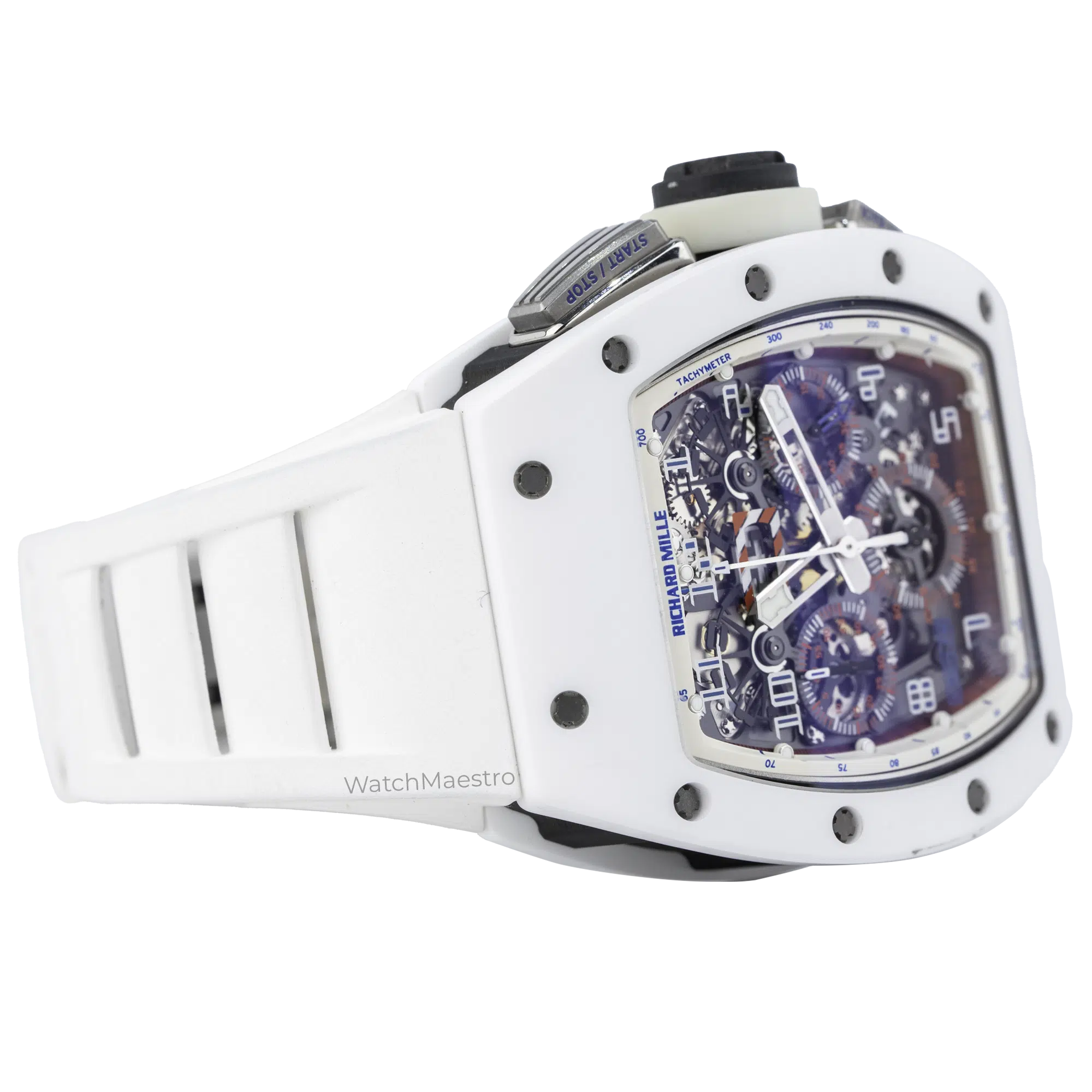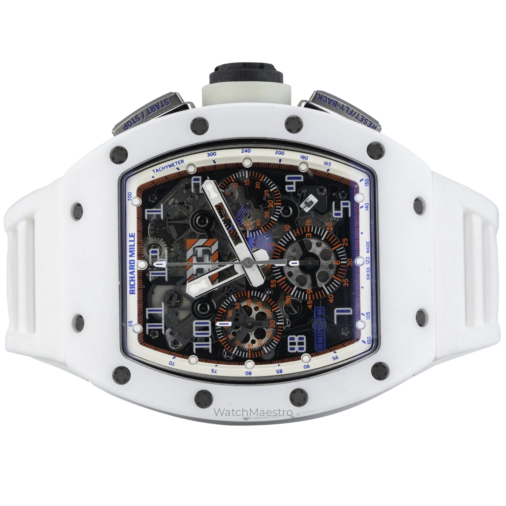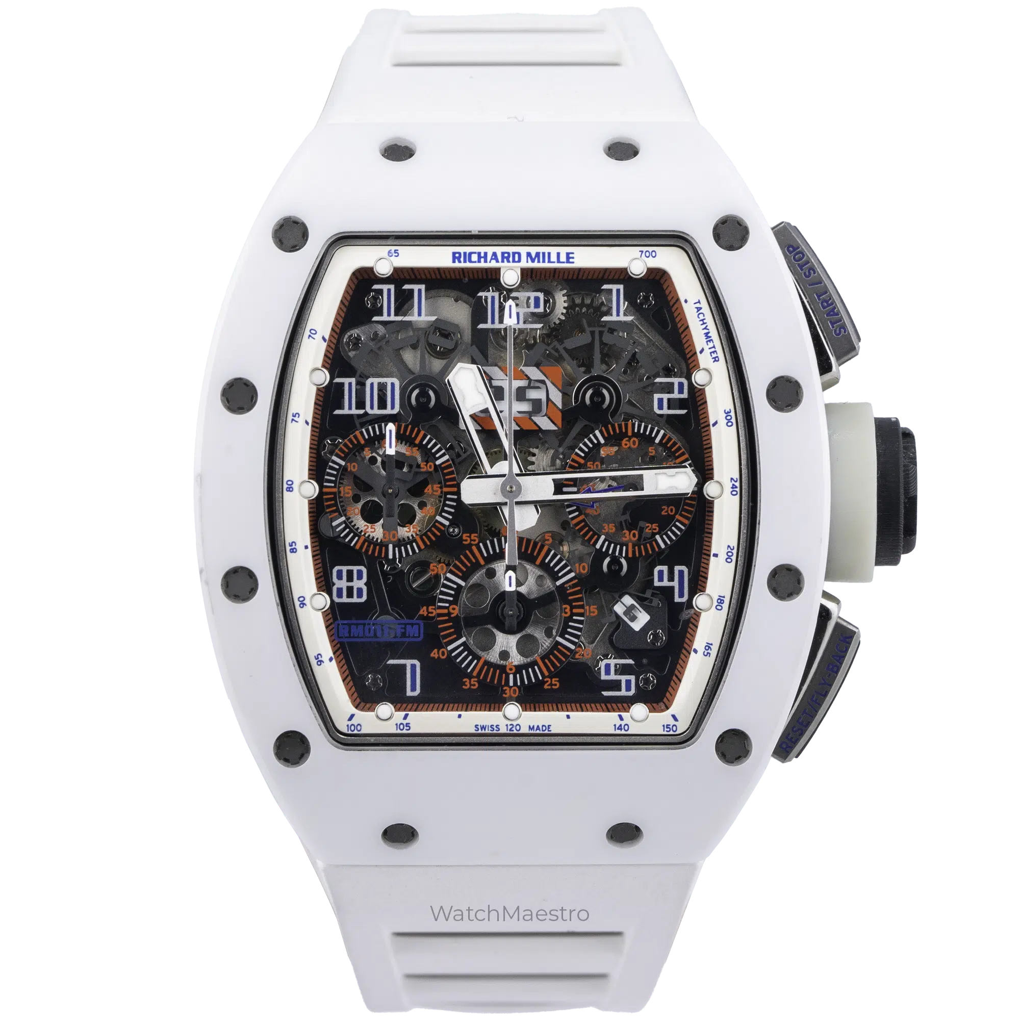 Grab the opportunity to own this unique looking Richard Mille RM011 Felipe Massa Asia Edition. It is crafted out of a NTPT Carbon case, which is sandwiched between White Ceramic front and back plates. Limited to just 50 pieces in the world, this particular model was an Asia Exclusive, which means all 50 of those were only sold in the Asia region. Hence, owning one in the Middle East will definitely make you stand out. The Sapphire Crystal on the front and the back lets you peak to through the intricate movement. The Flyback Chronograph makes this watch stand out and the date window makes it more practical. Purchased in 2017, the watch comes complete with box and papers. Even though pre-owned, the watch is still in an immaculate condition.