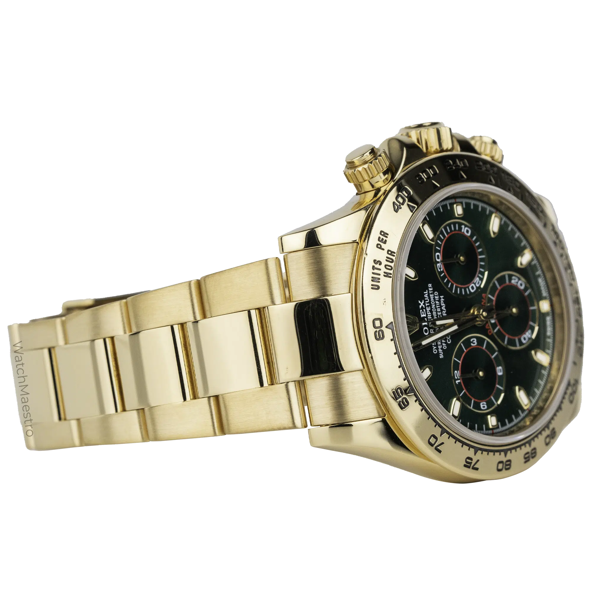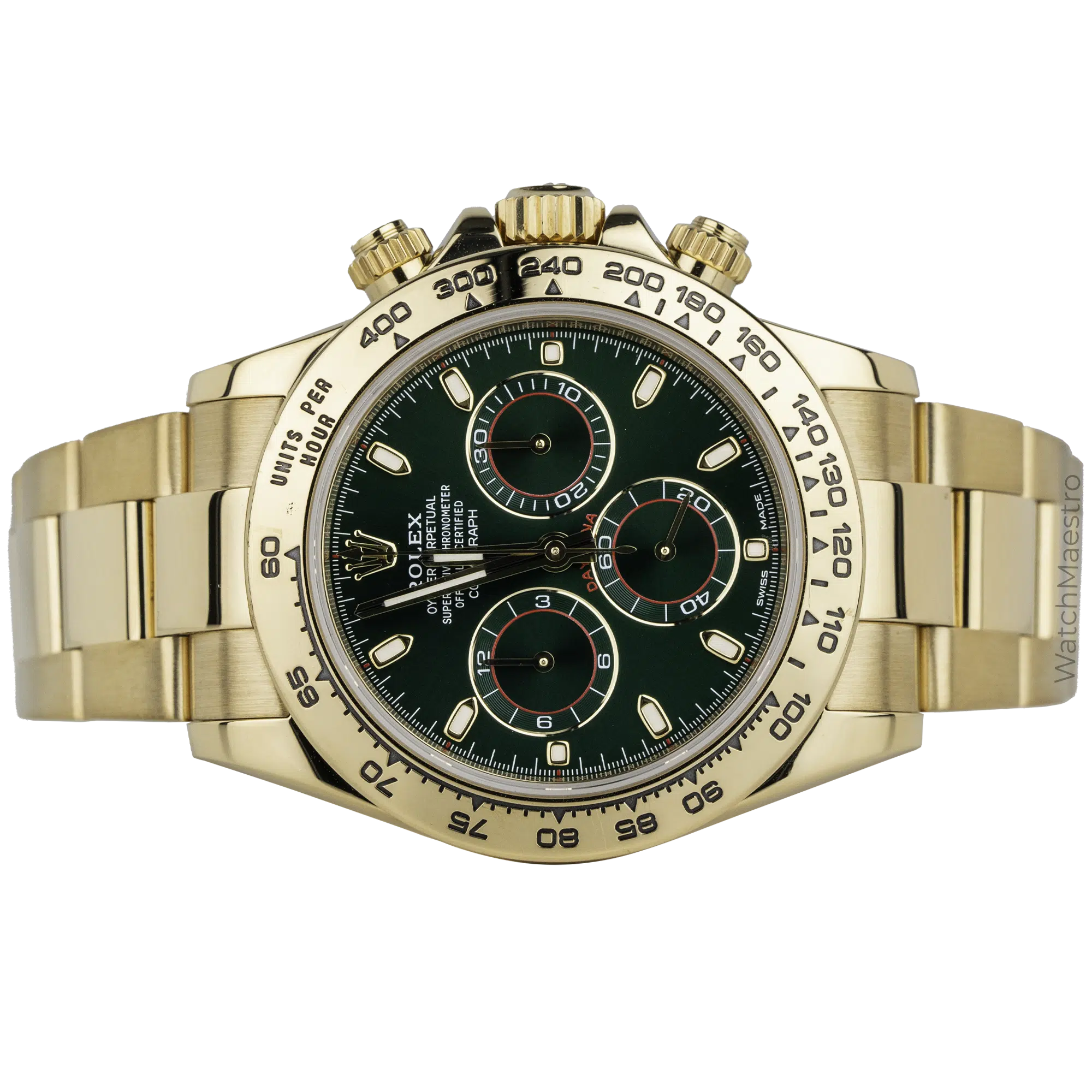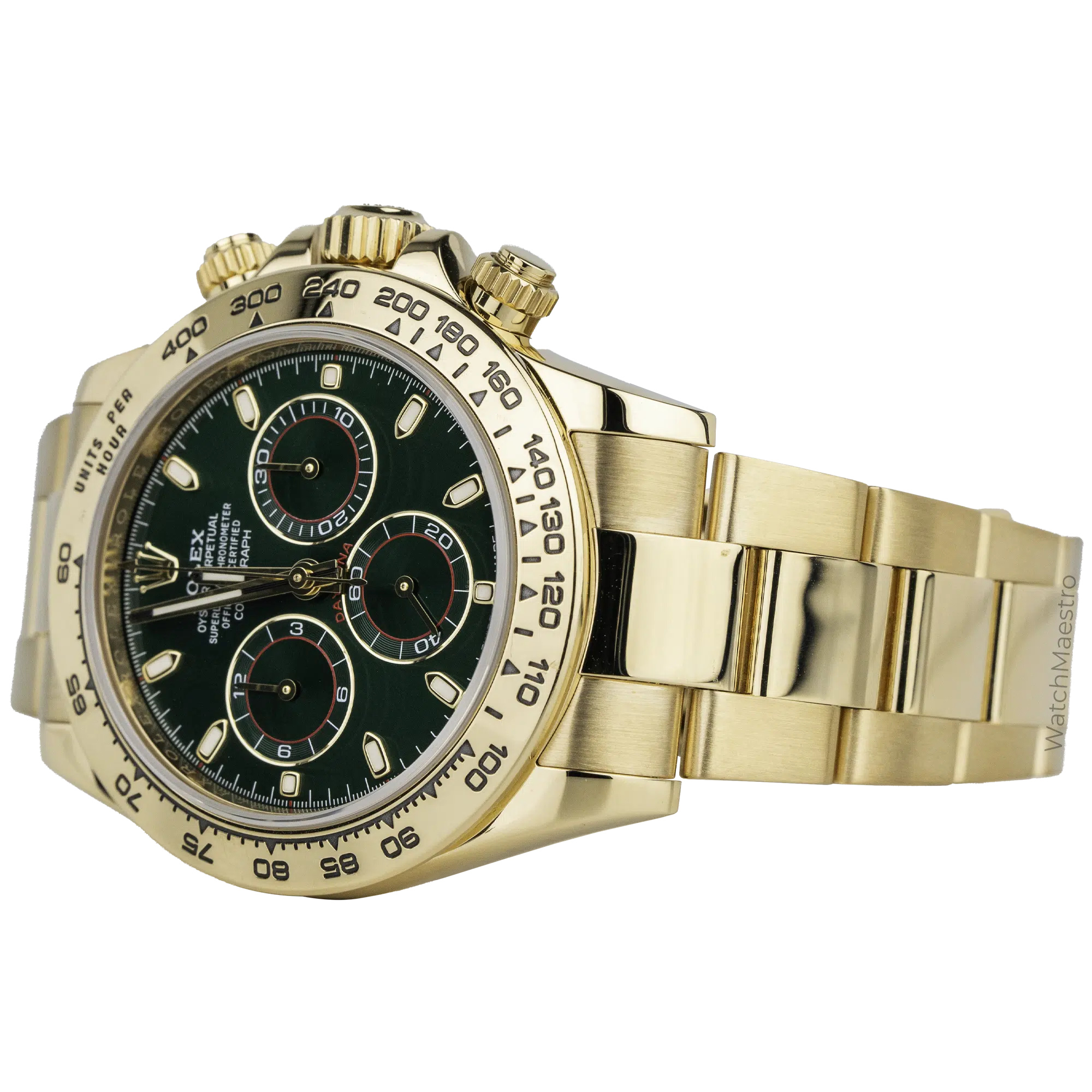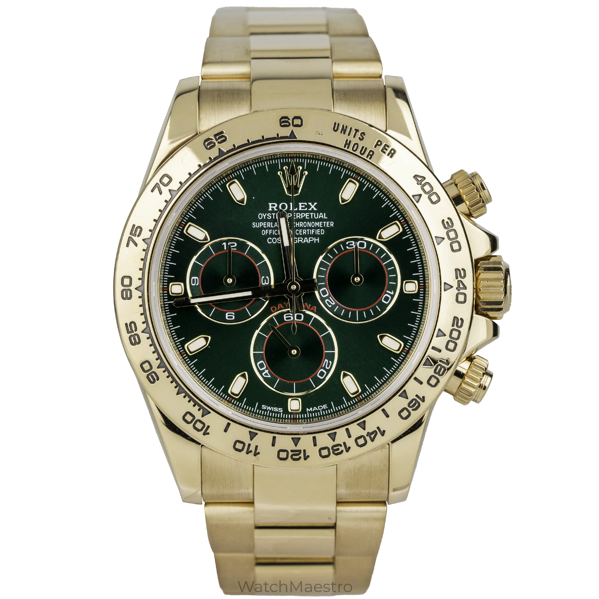 This is a pre-owned Rolex Cosmograph Daytona Yellow Gold with a Green Dial. Purchased in 2018, the watch comes with its original box and paperwork. Popularly known as the John Mayer Daytona, it is one of the most sought-after Rolex models one can get. Crafted out of 18ct Yellow Gold, the 40mm case is paired with an 18ct Yellow Gold Oyster bracelet.