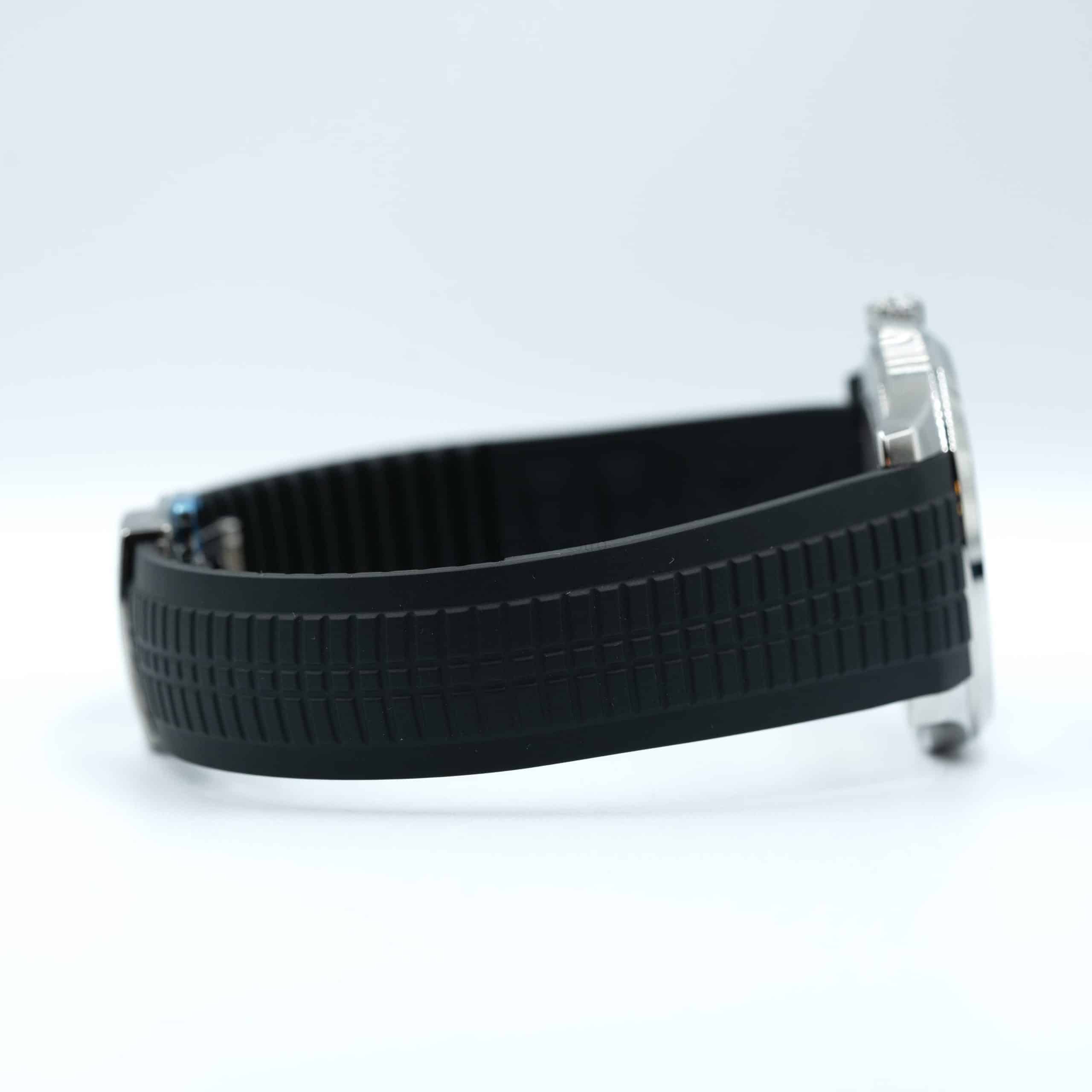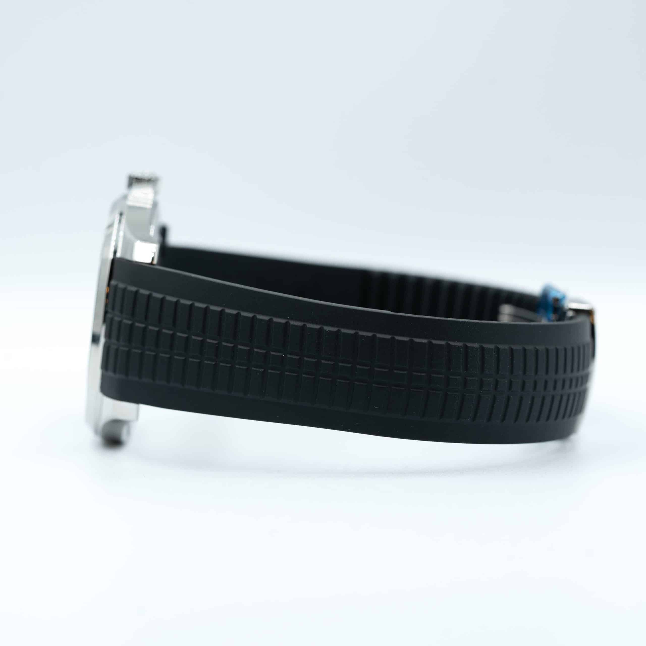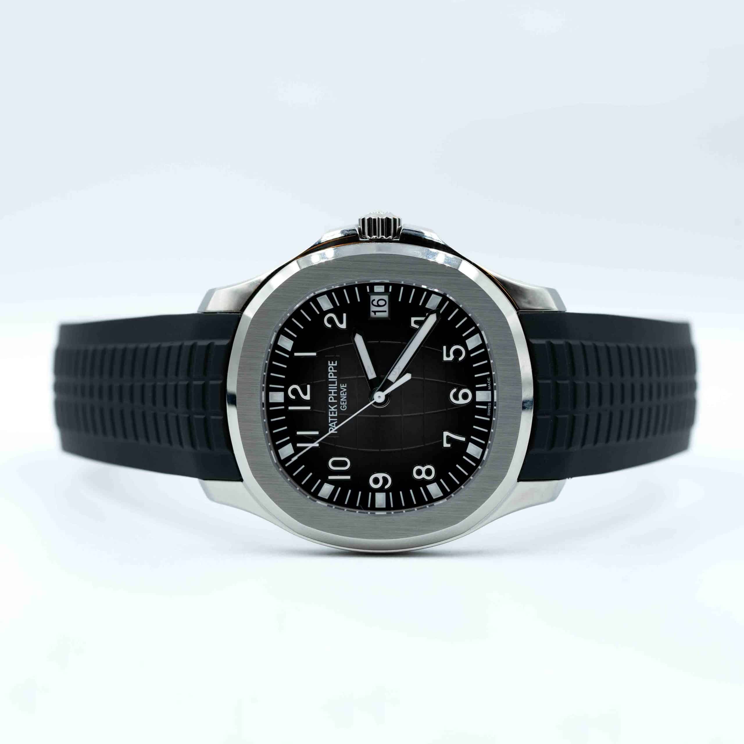 Patek Philippe Aquanaut ref. 5167A-001 comes with a self-winding mechanical movement. This particular model is in a brand-new shape and it still has the original stickers on it. The watch features a black embossed dial and a stainless steel case. It comes with a “Tropical“ composite black strap with a fold-over clasp.