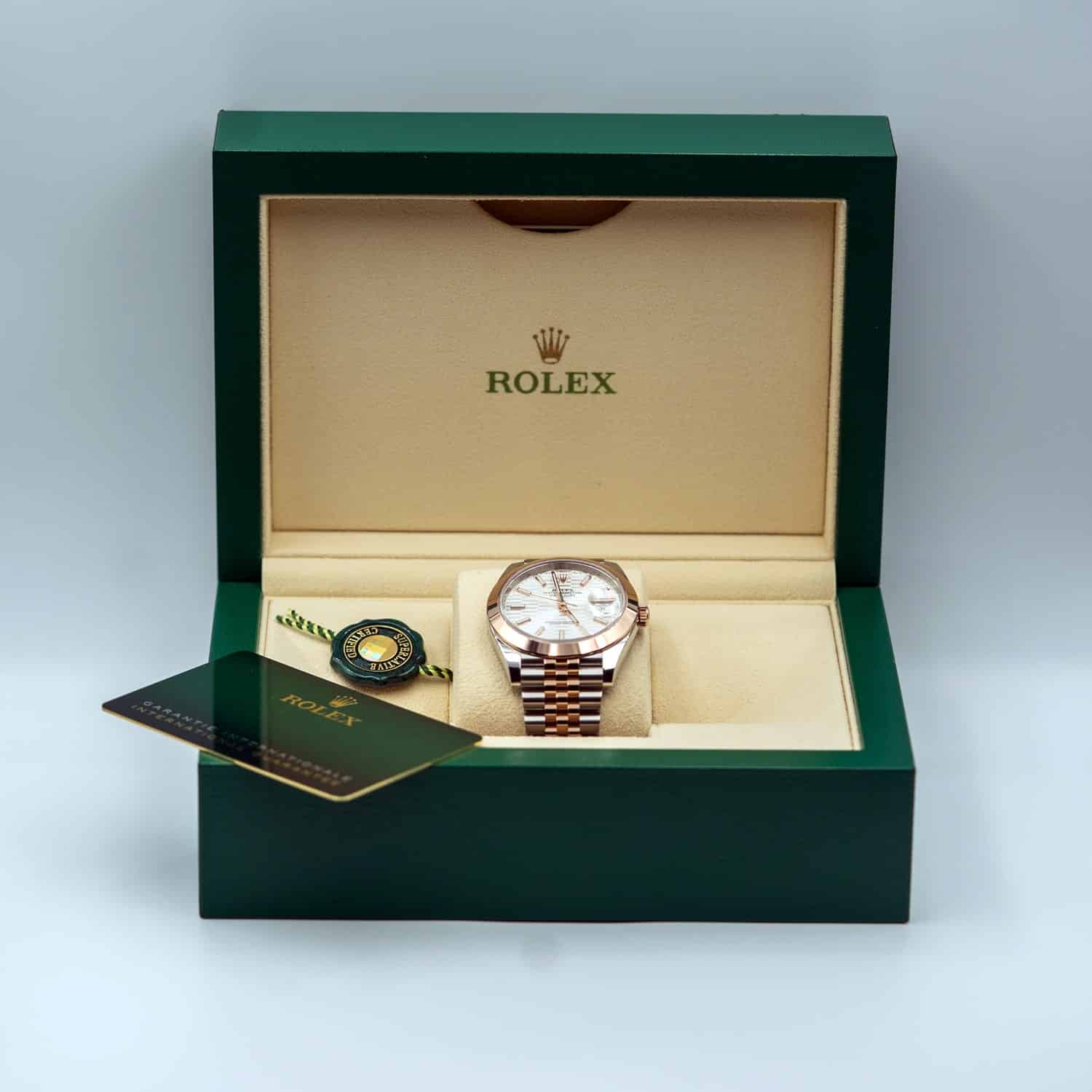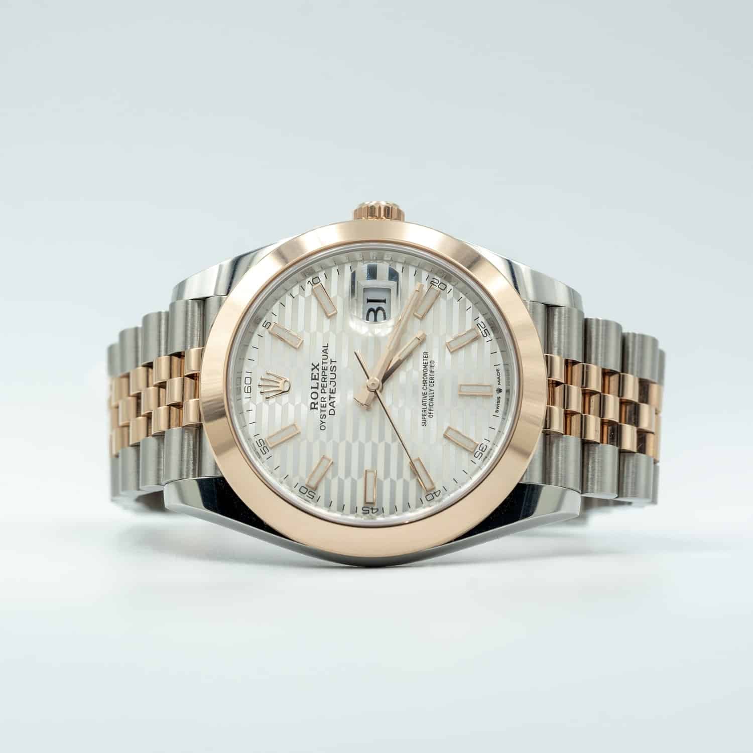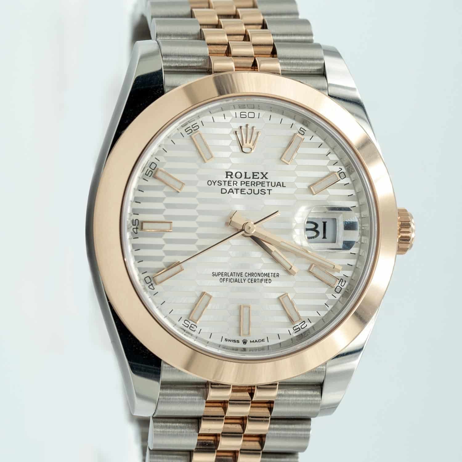 This is a pre-owned Rolex Datejust 41 with a two-tone Jubilee bracelet. Purchased in 2023, the watch comes complete with the original box and papers. The watch features a White Motif 41mm dial, which is further complemented by the 18ct Rose Gold Smooth Bezel. It is a recently launched colorway and not many people own it making it extremely desirable.