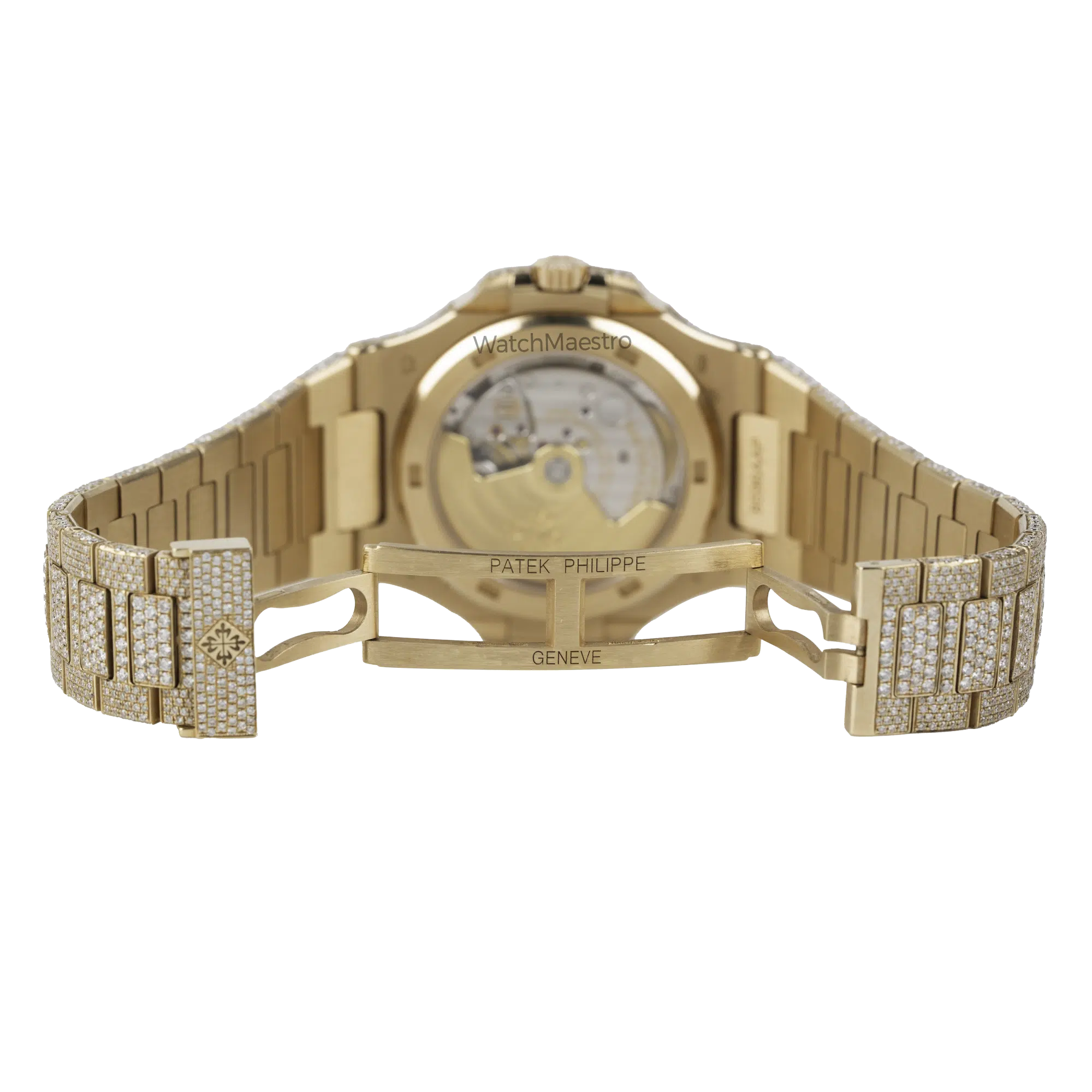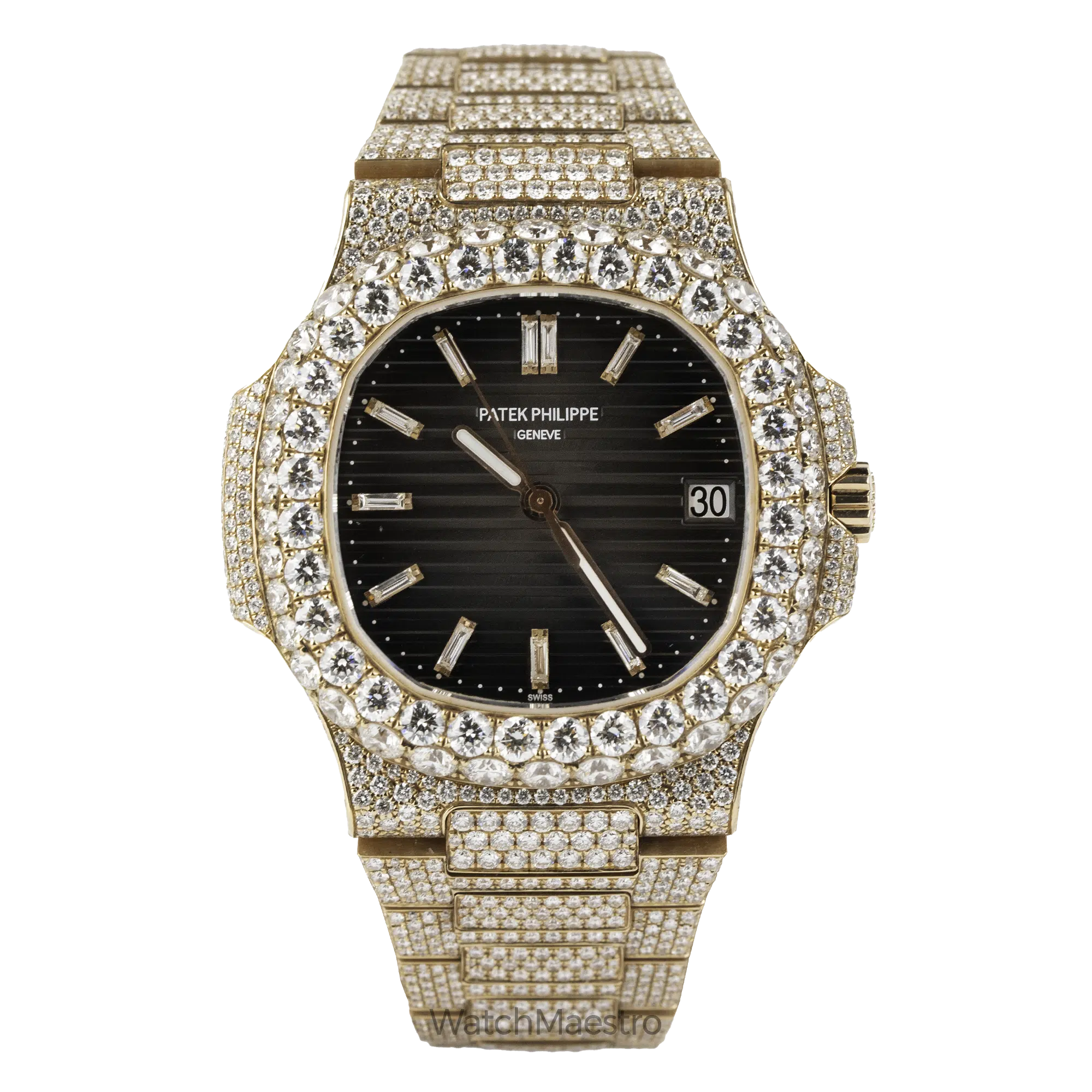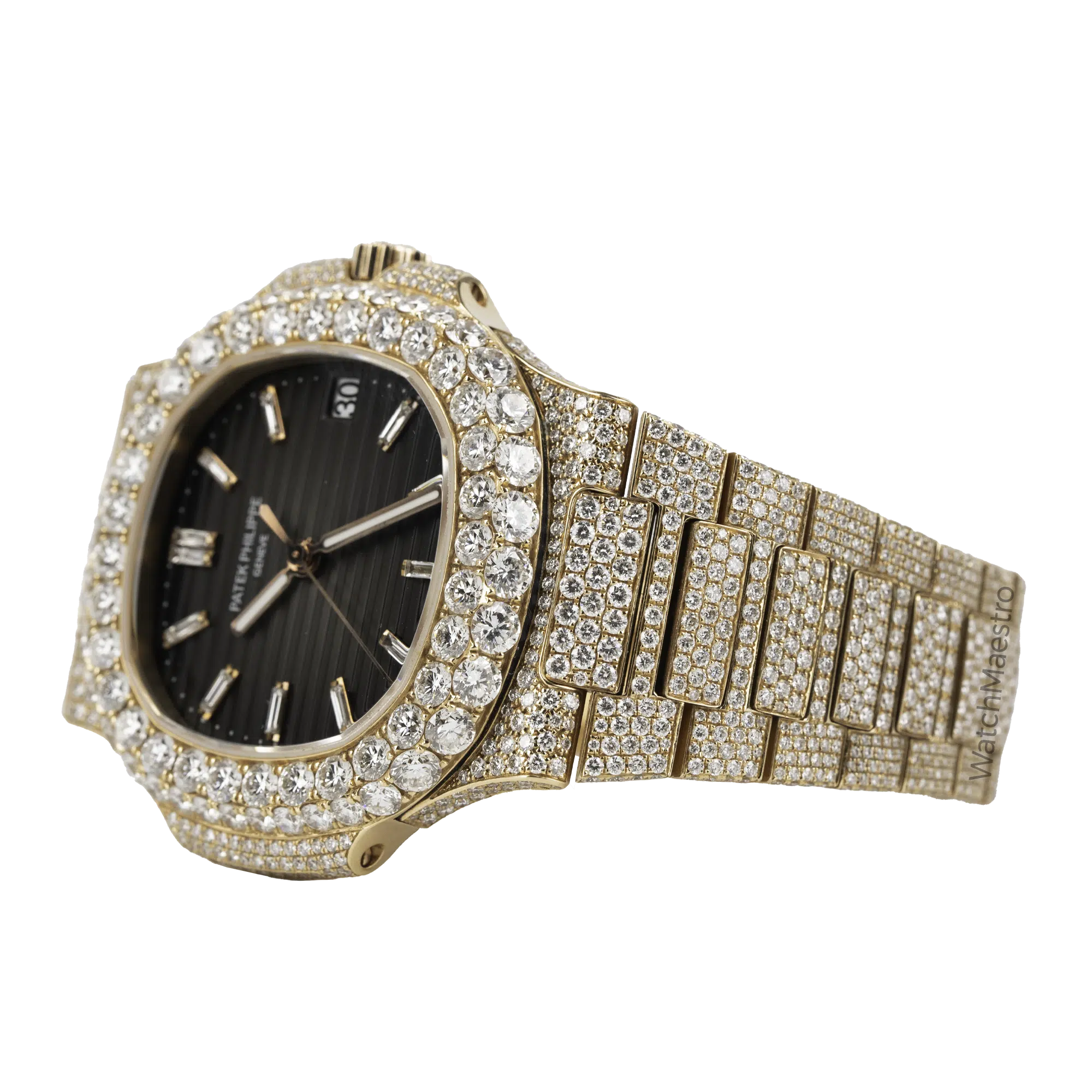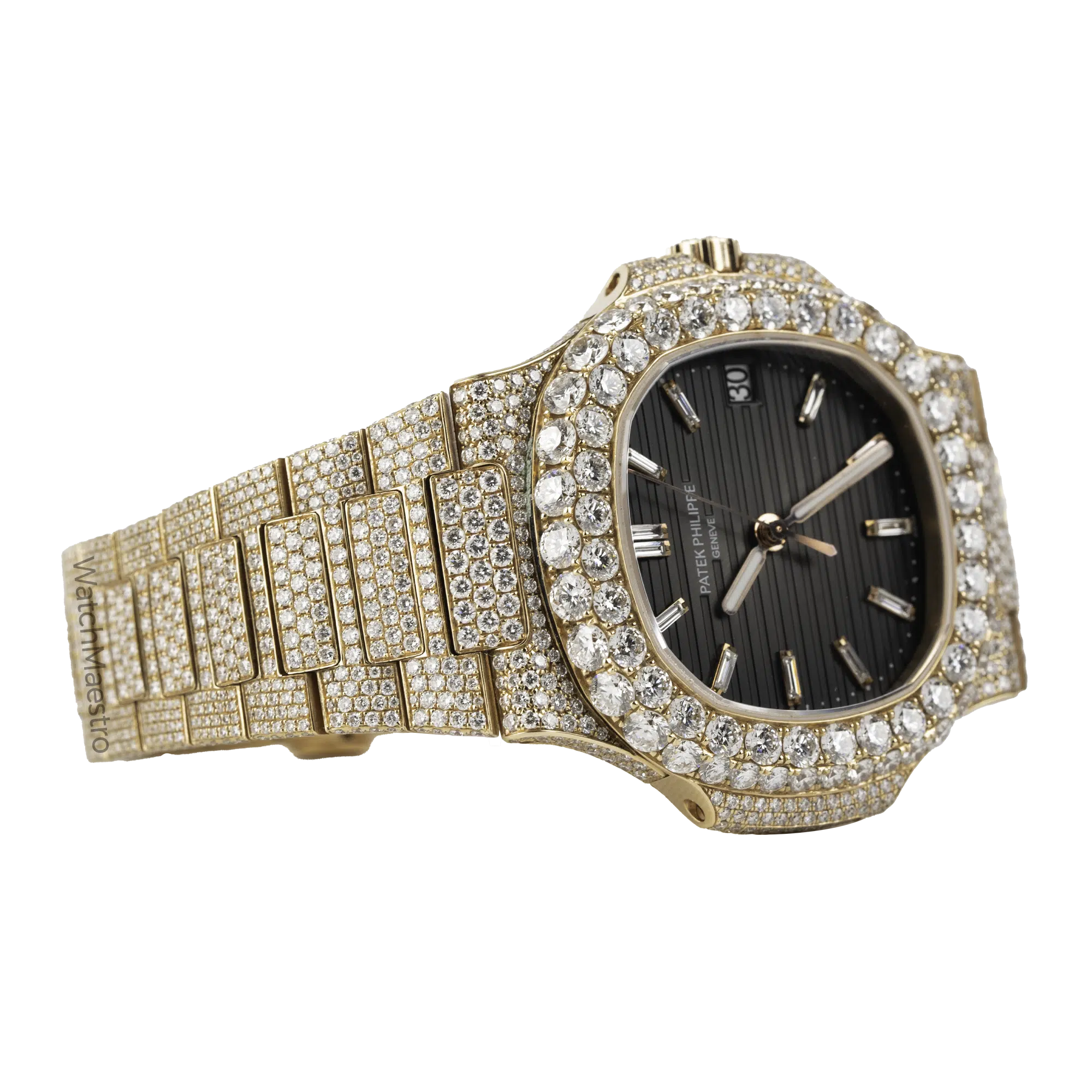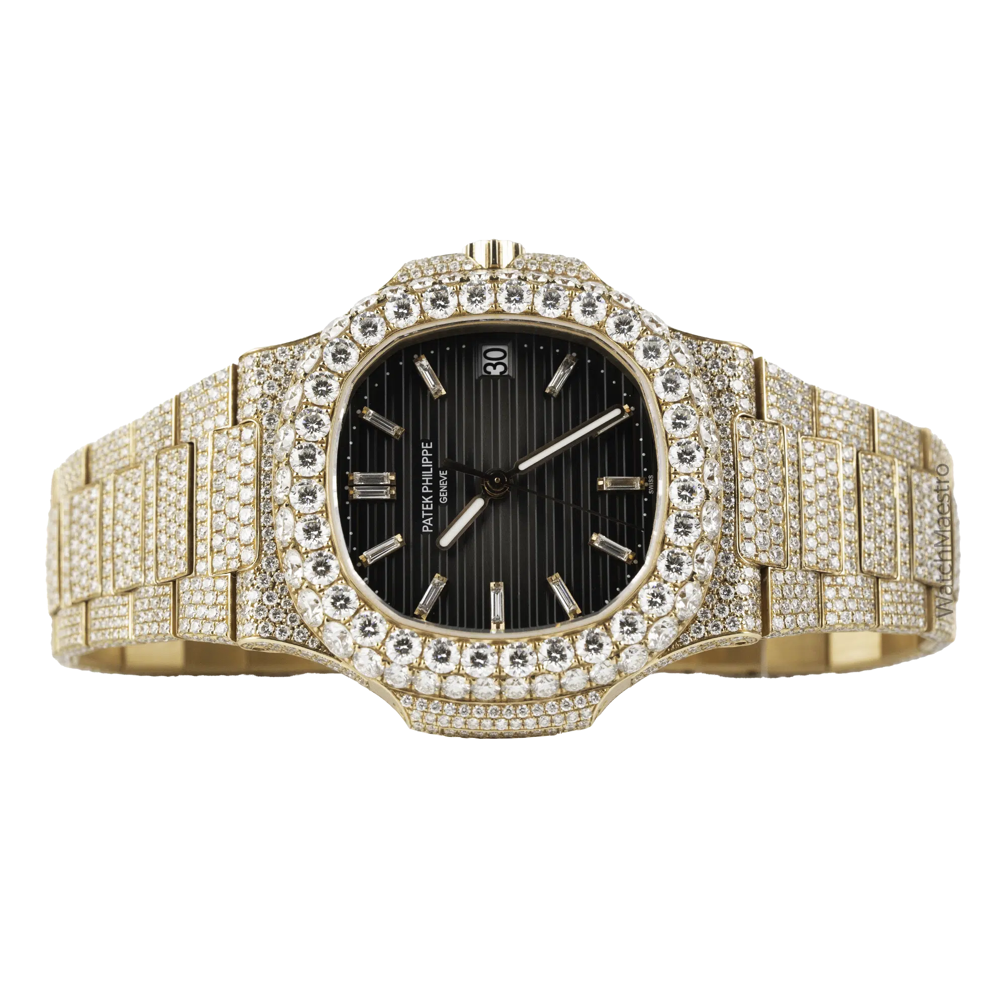 WatchMaestro brings you this special Patek Philippe Nautilus 5711R with a bespoke touch. Crafted entirely in Rose Gold, this Nautilus stands as a symbol of Patek Philippe’s legacy in horological excellence. What sets this particular piece apart is its aftermarket transformation. Fully iced out, this watch is definitely going to attract a lot of eyeballs to your wrist when you wear it with pride. Each facet of the watch, from the iconic octagonal bezel to the intricate links of the bracelet are fully iced creating a magnificent play of light and luxury.
