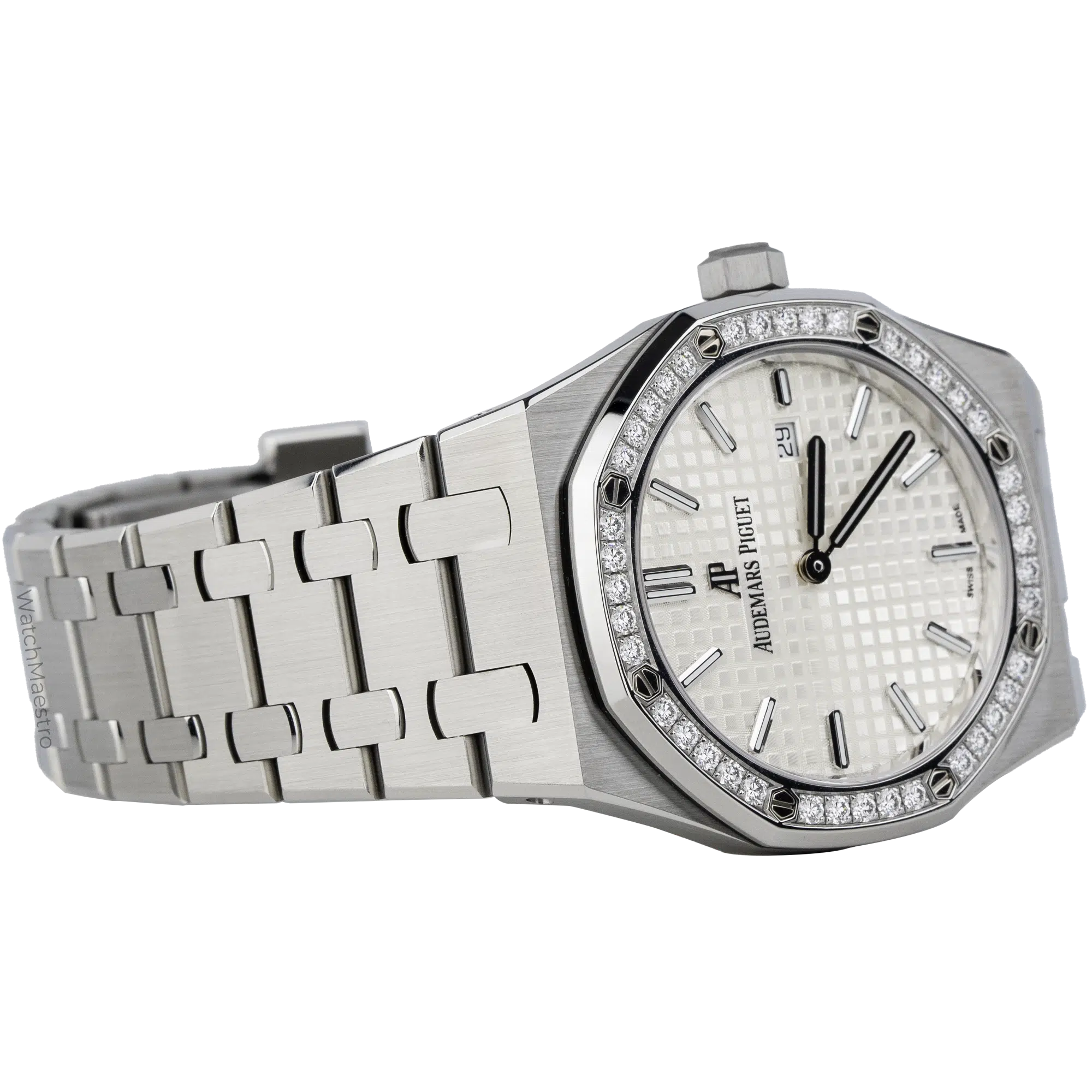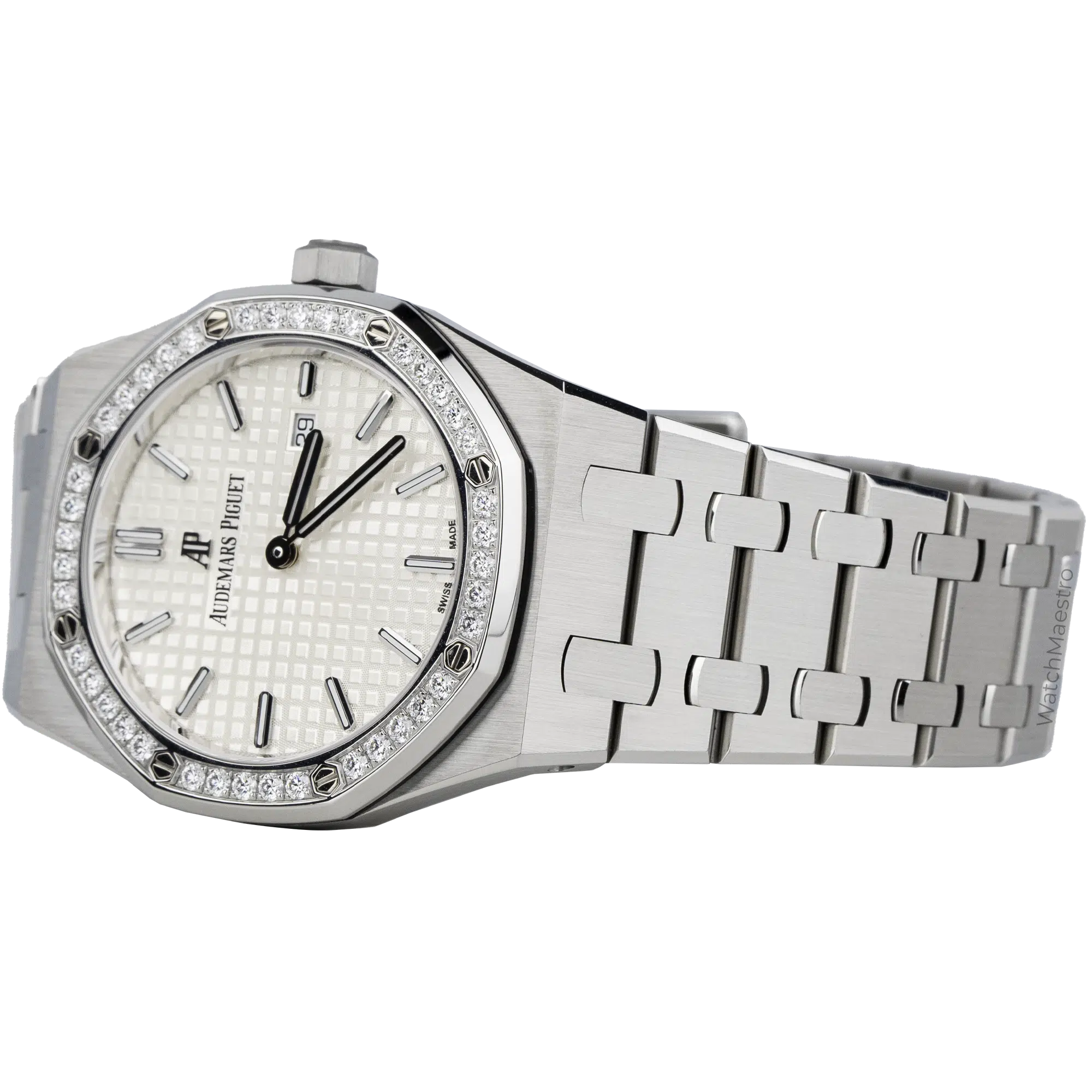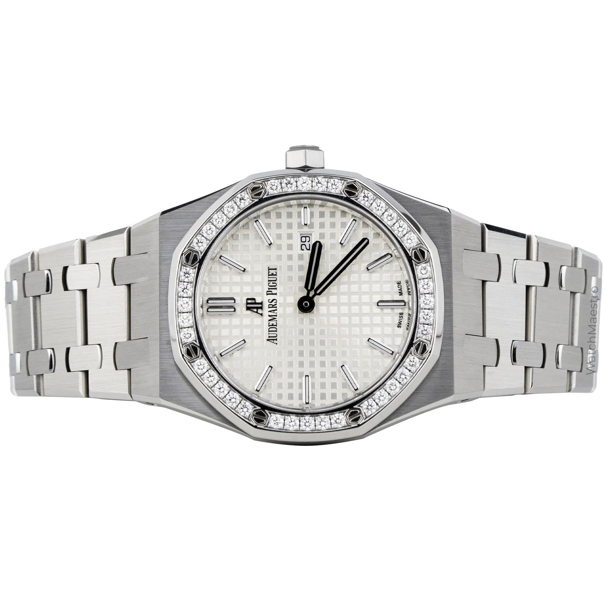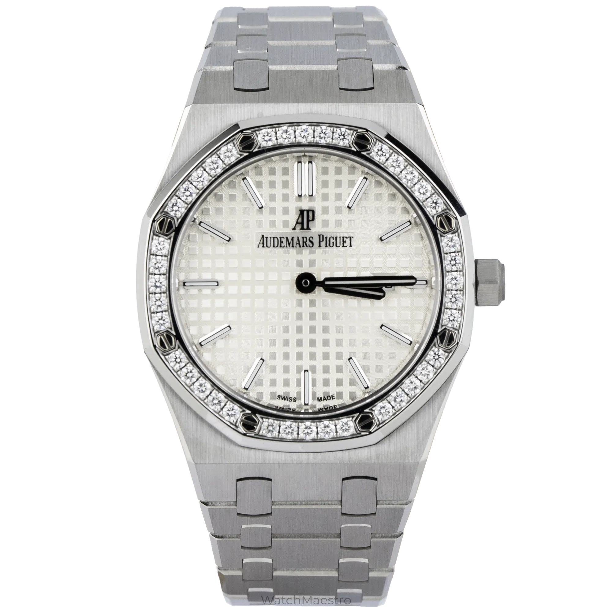 Audemars Piguet Royal Oak 67651ST.ZZ.1261ST.01 features a 33mm White dial that hits the sweet spot. The dial gets a Grande Tapisserie pattern on it and the watch even gets a date window for practicality. It is powered by a Quartz movement, which means you never have to worry about winding it.