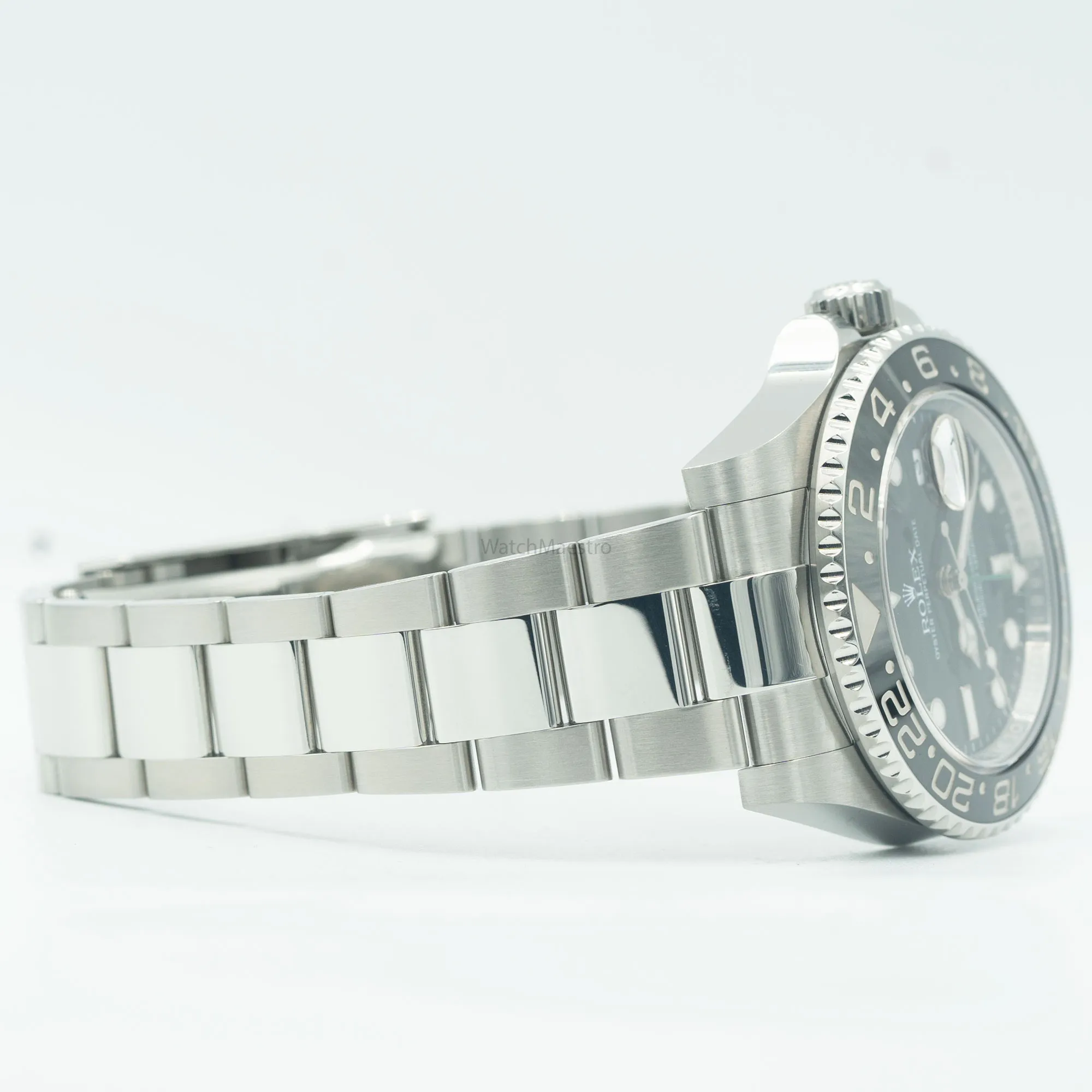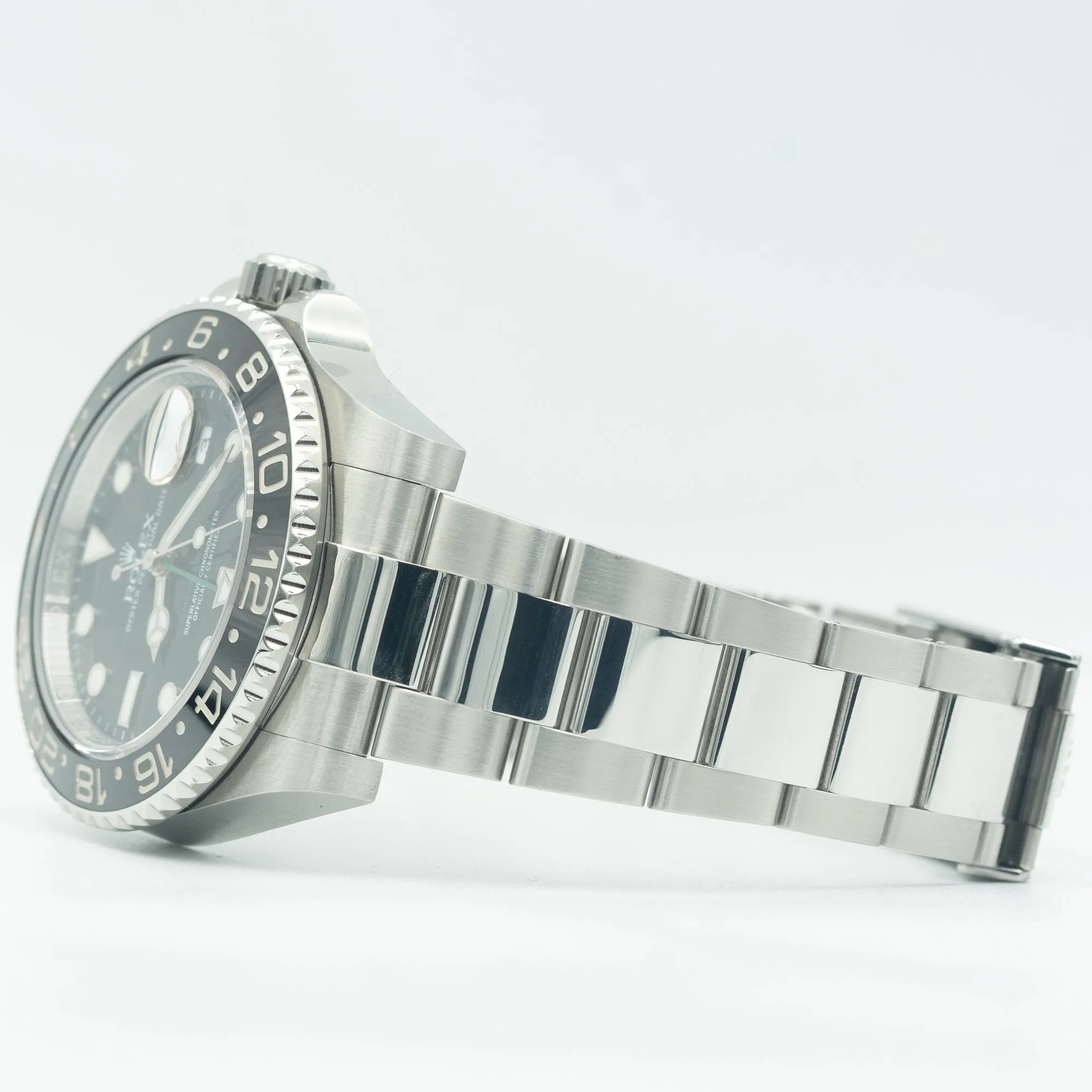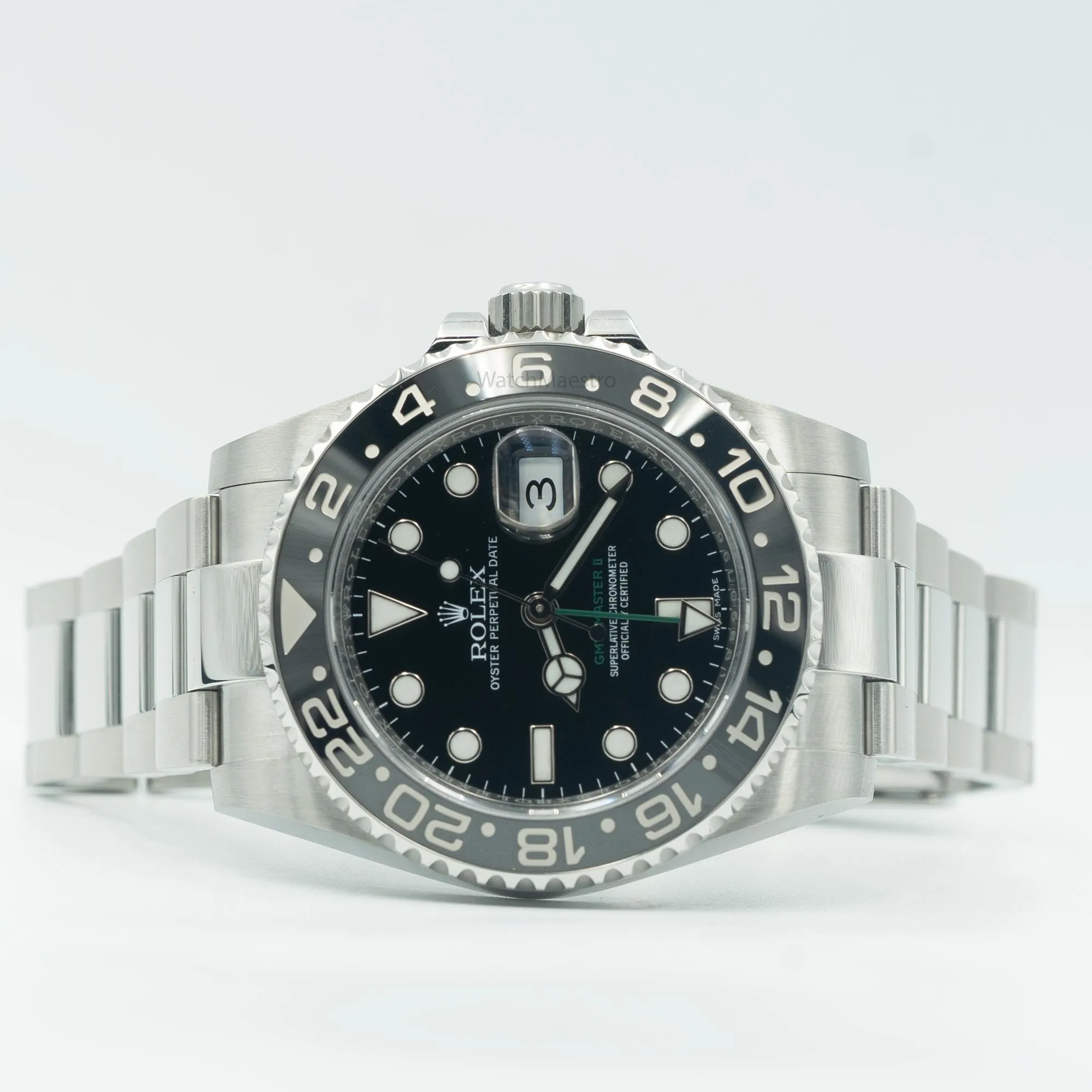 This is a pre-owned Rolex GMT Master II with an all-black ceramic bezel. It was purchased in 2013 and features a 40mm Black dial. The watch is in pristine condition. It is a discontinued piece making it a desirable watch among collectors and enthusiasts.