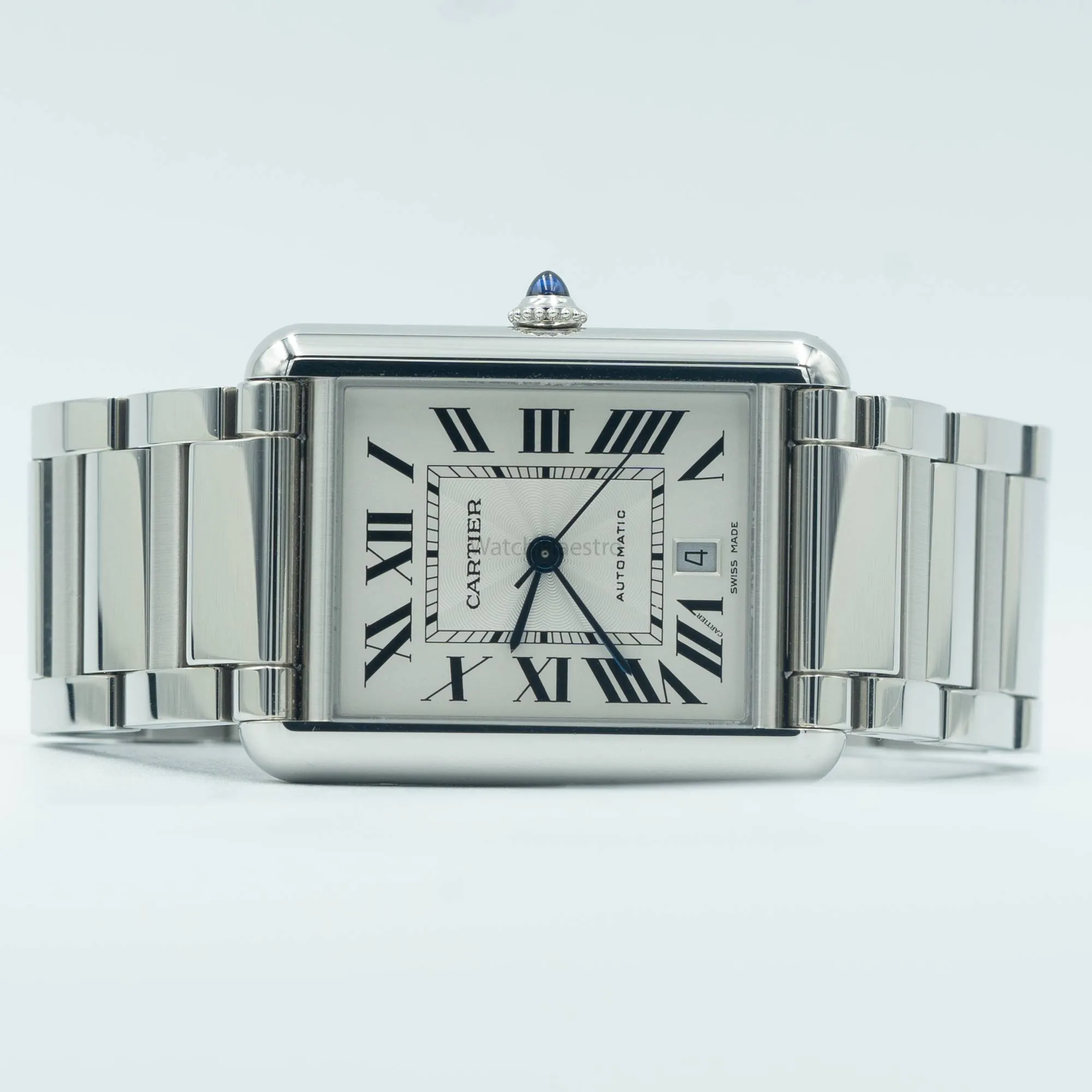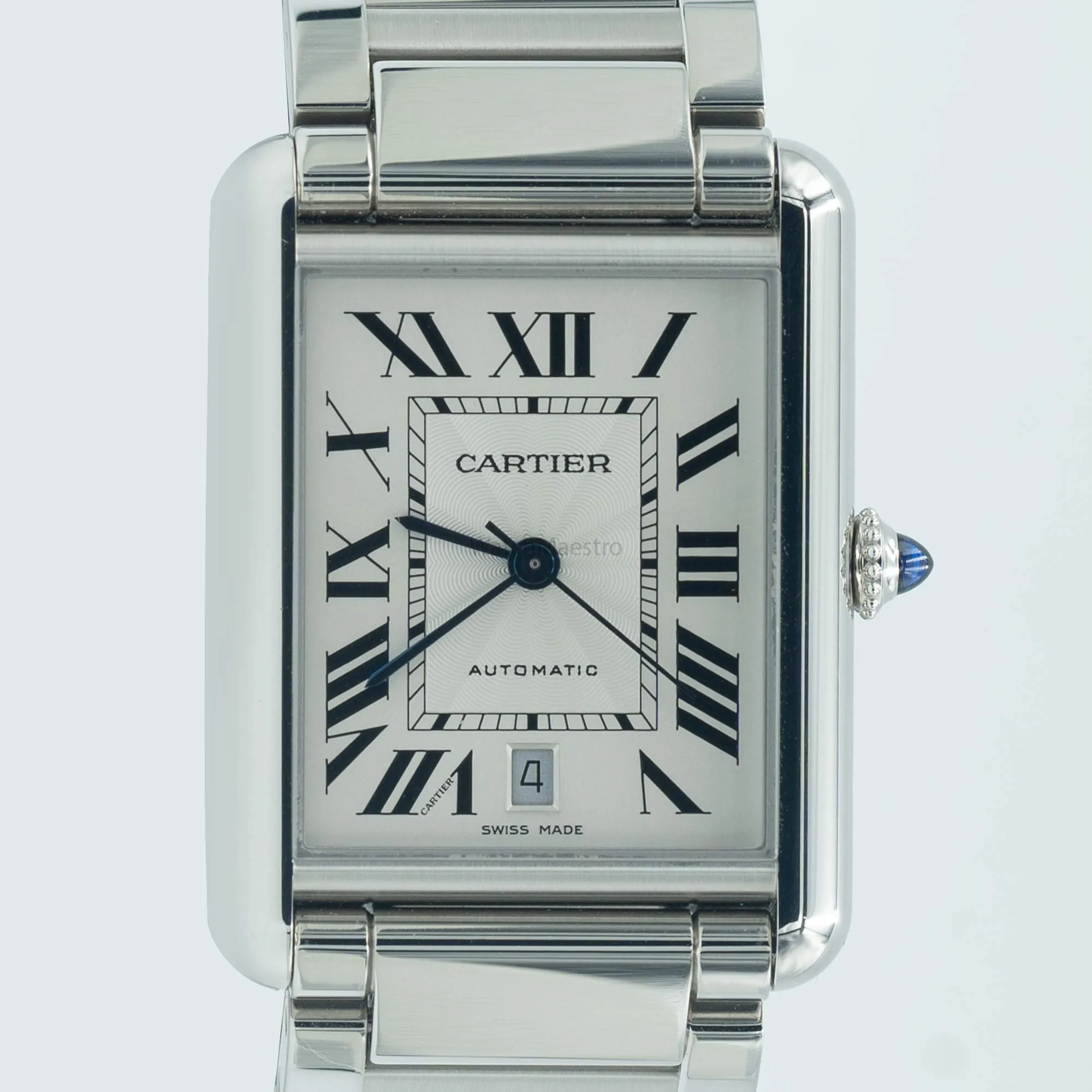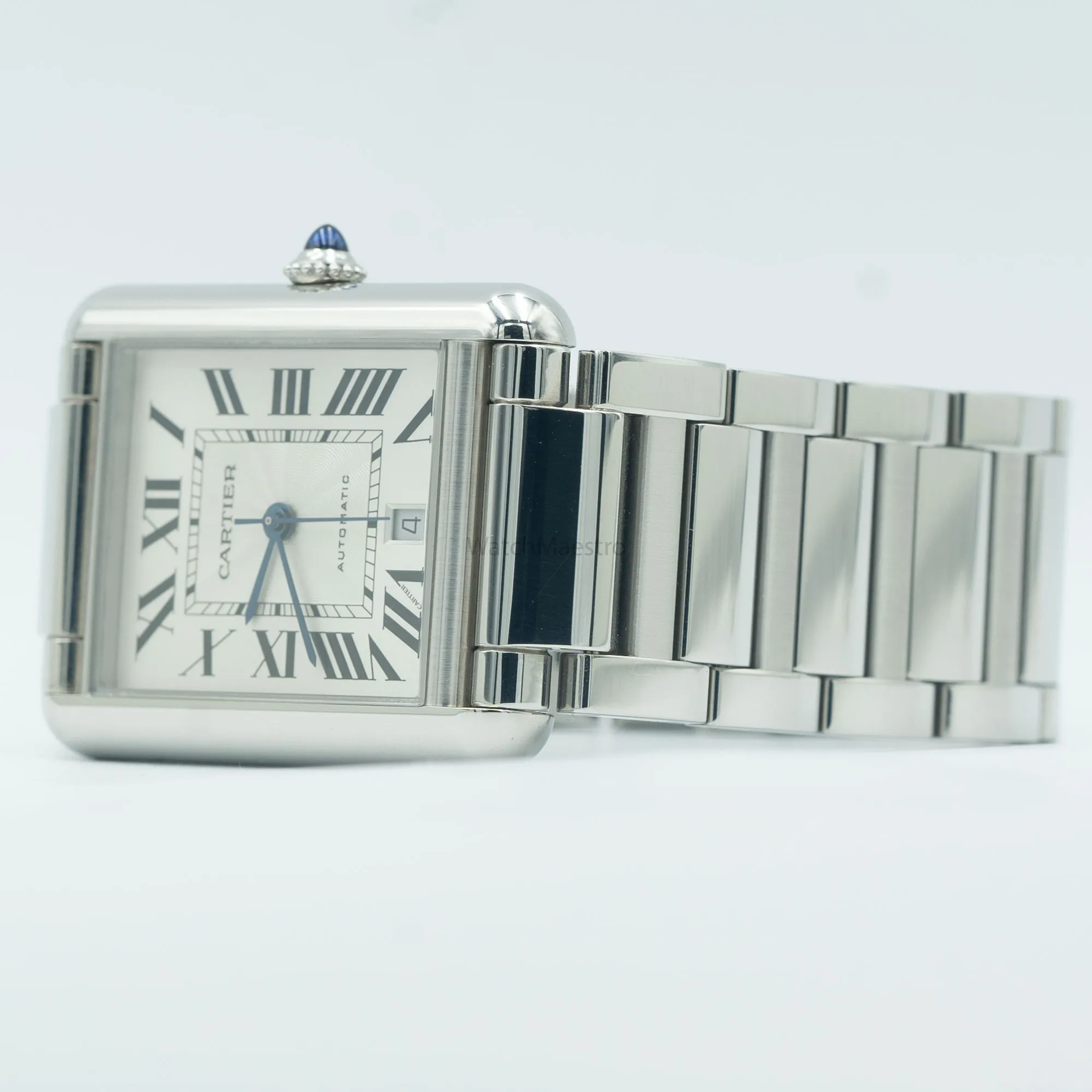 This is a pre-owned Cartier Tank Must Steel reference WSTA0053. Purchased in 2022, the timepiece comes complete with its original box and paperwork. It features a Silver Roman Dial with blued-steel sword-shaped hands giving it a unique look. The watch comes with an automatic winding movement and the 41mm case of the watch sits on a steel bracelet.