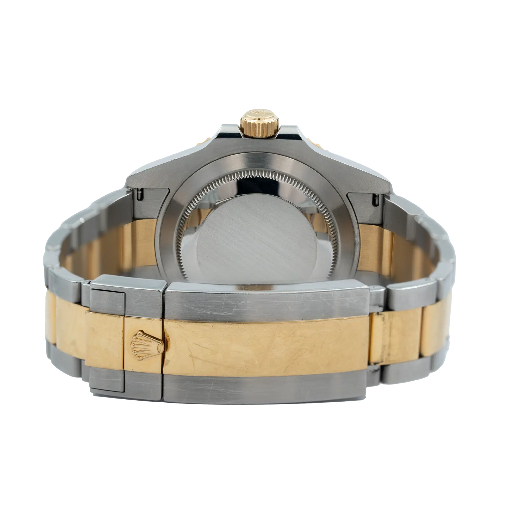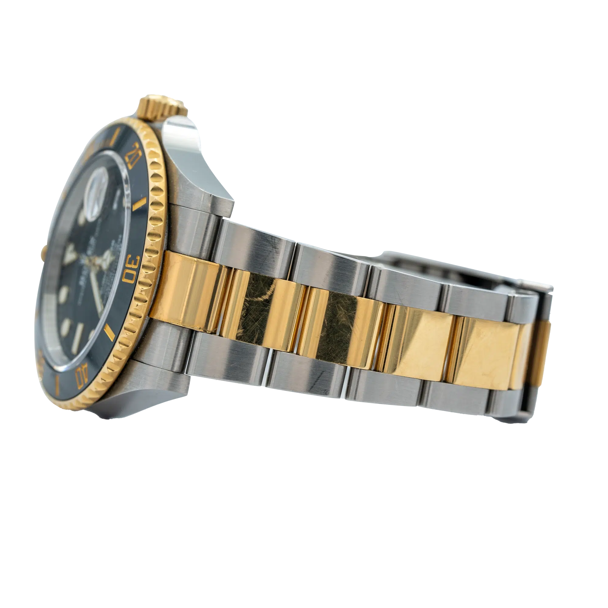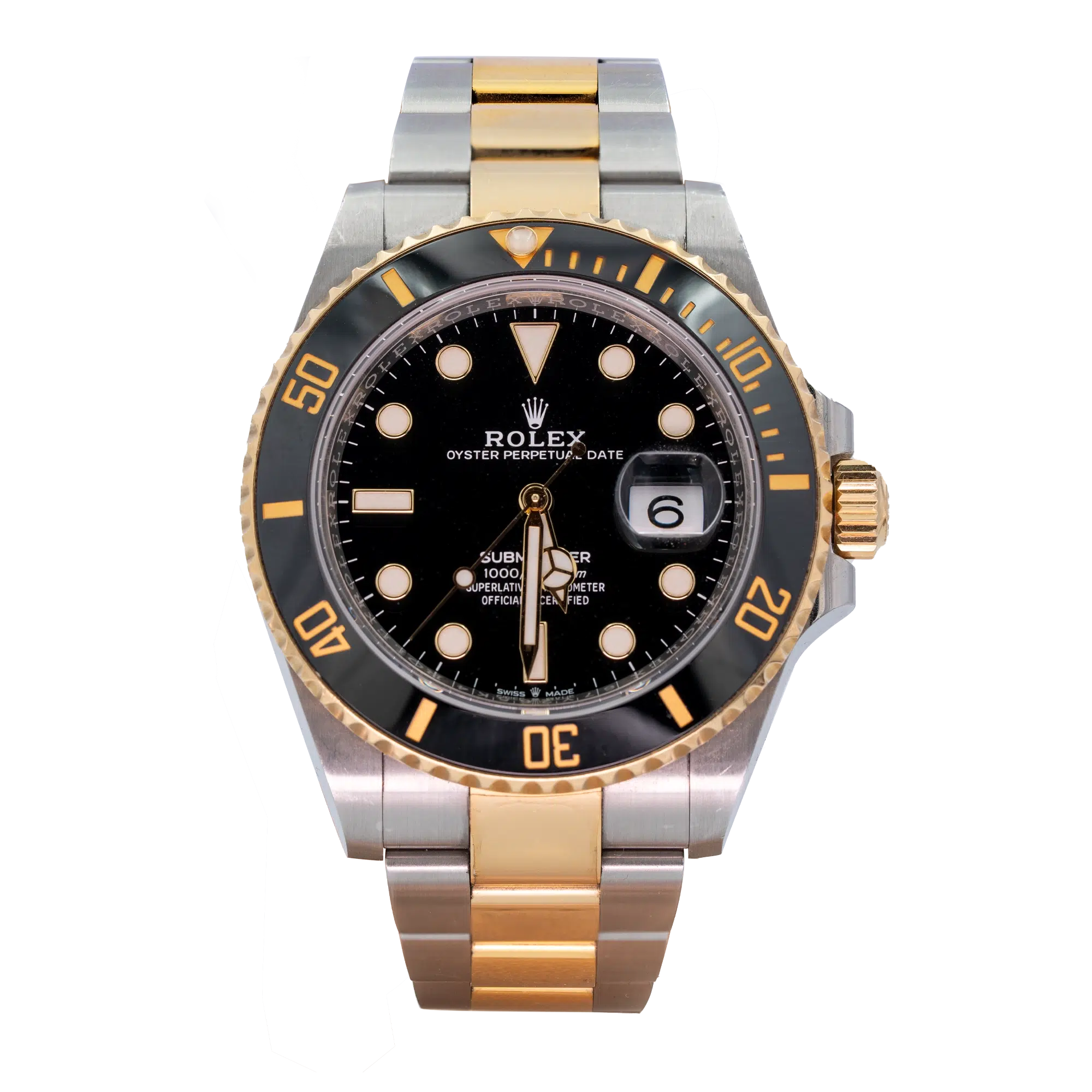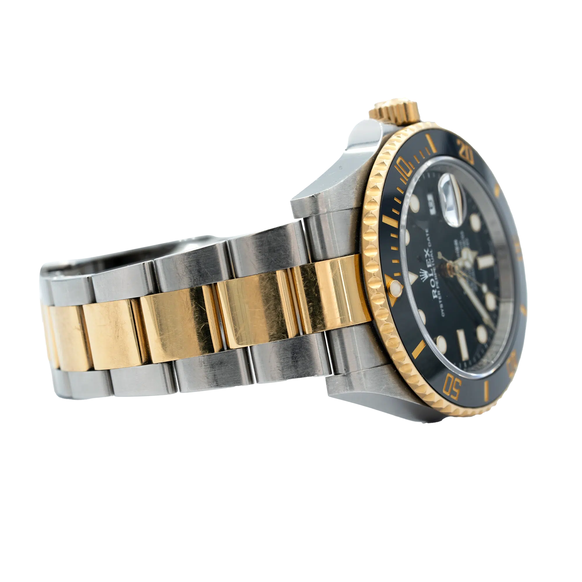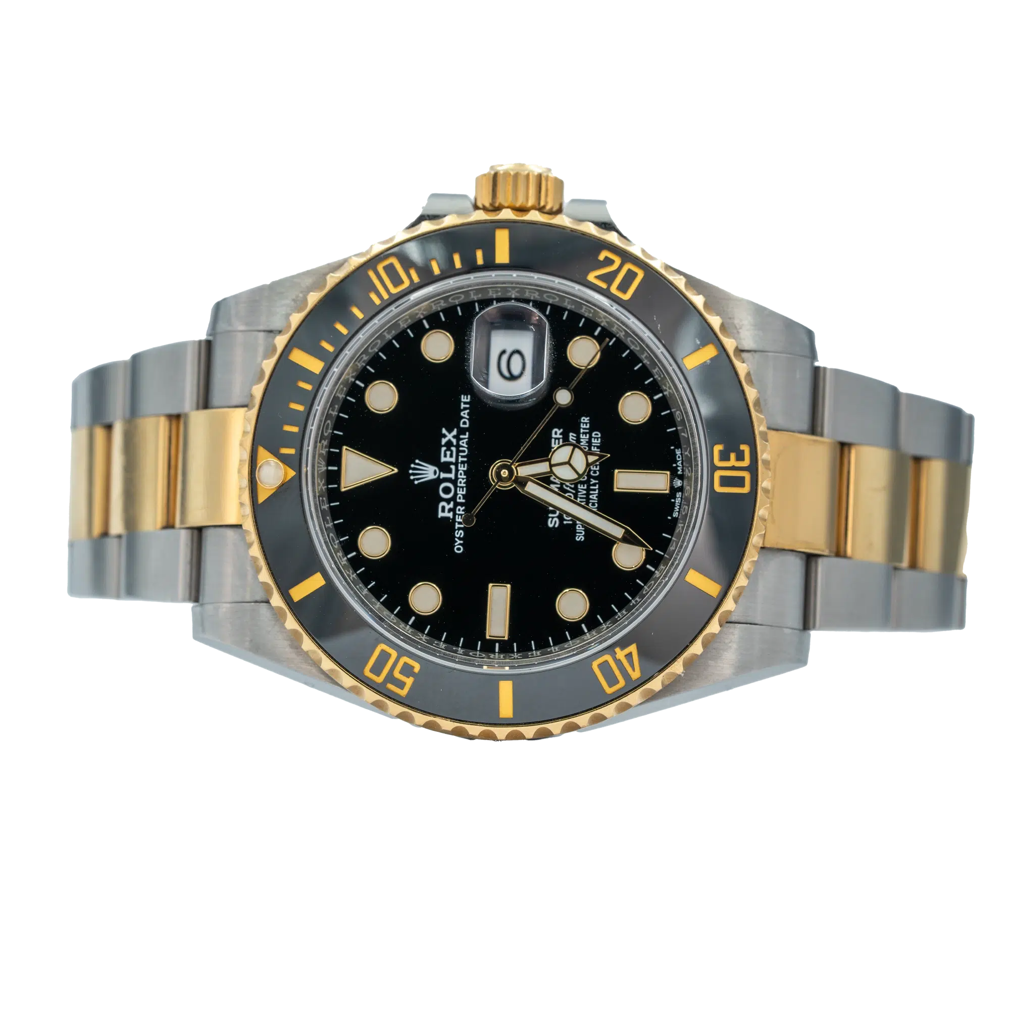 This is a pre-owned Rolex Submariner 41mm. Purchased in 2021, the watch comes complete with box and papers. It features a black dial and a black Cerachrom bezel. The 41mm Oystersteel case sits on a two-tone Oyster bracelet featuring 18ct Yellow Gold and Oystersteel. It is one of the classiest-looking two-tone Submariner models available today.