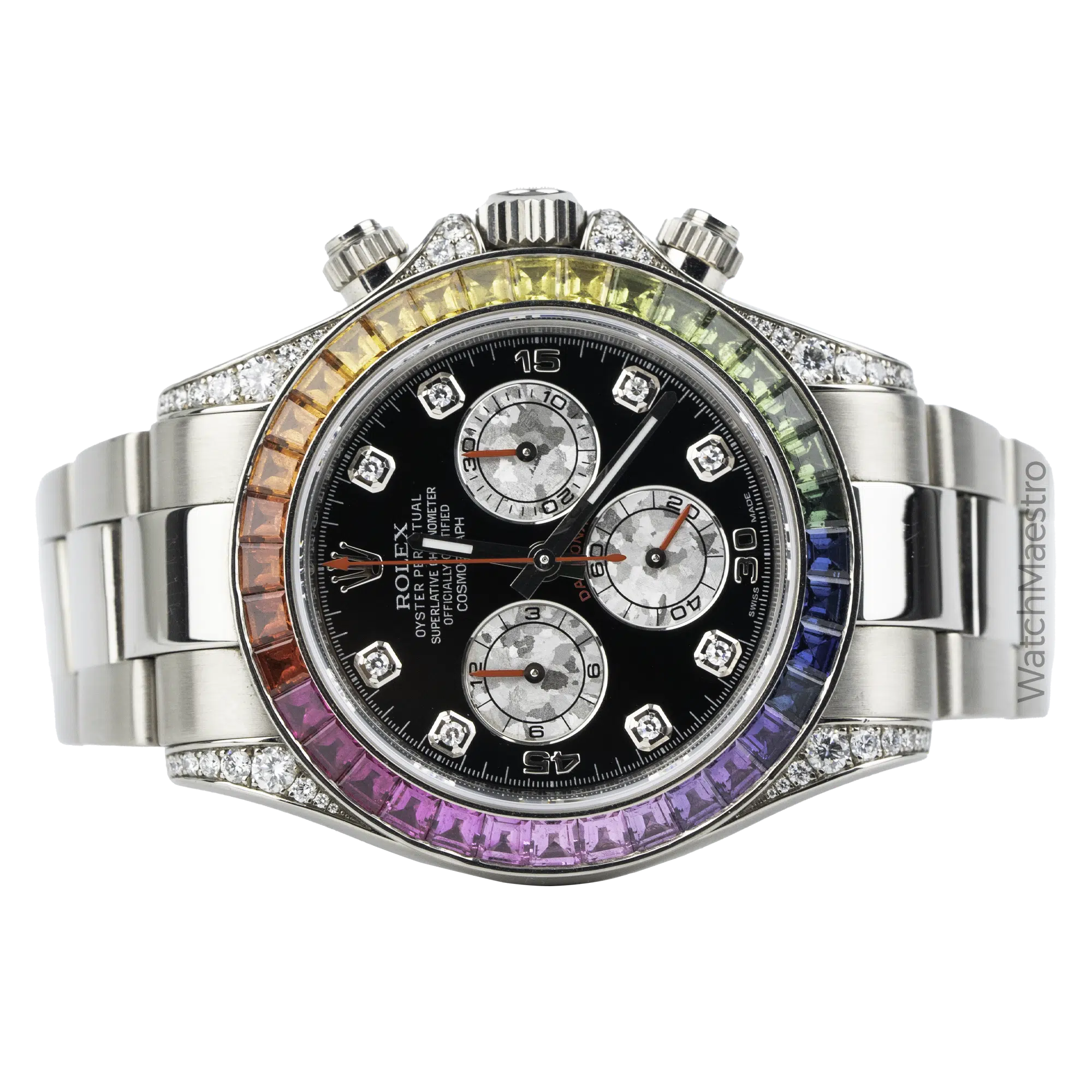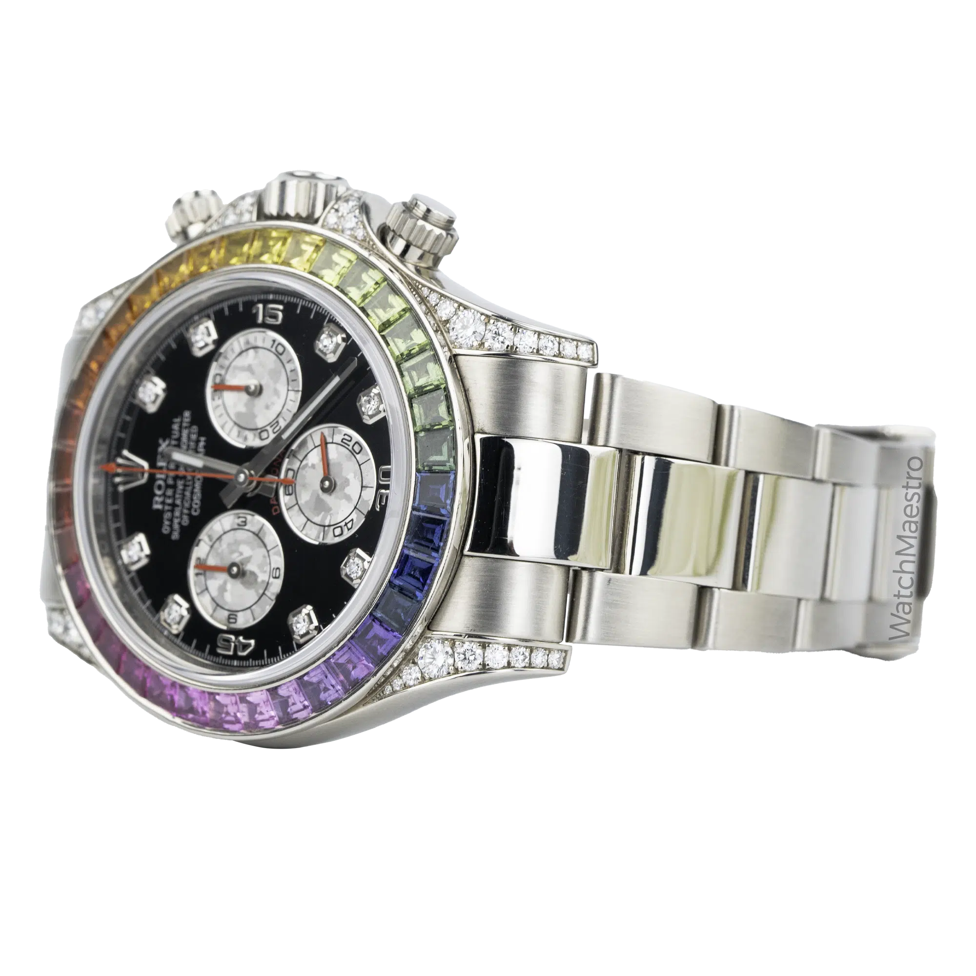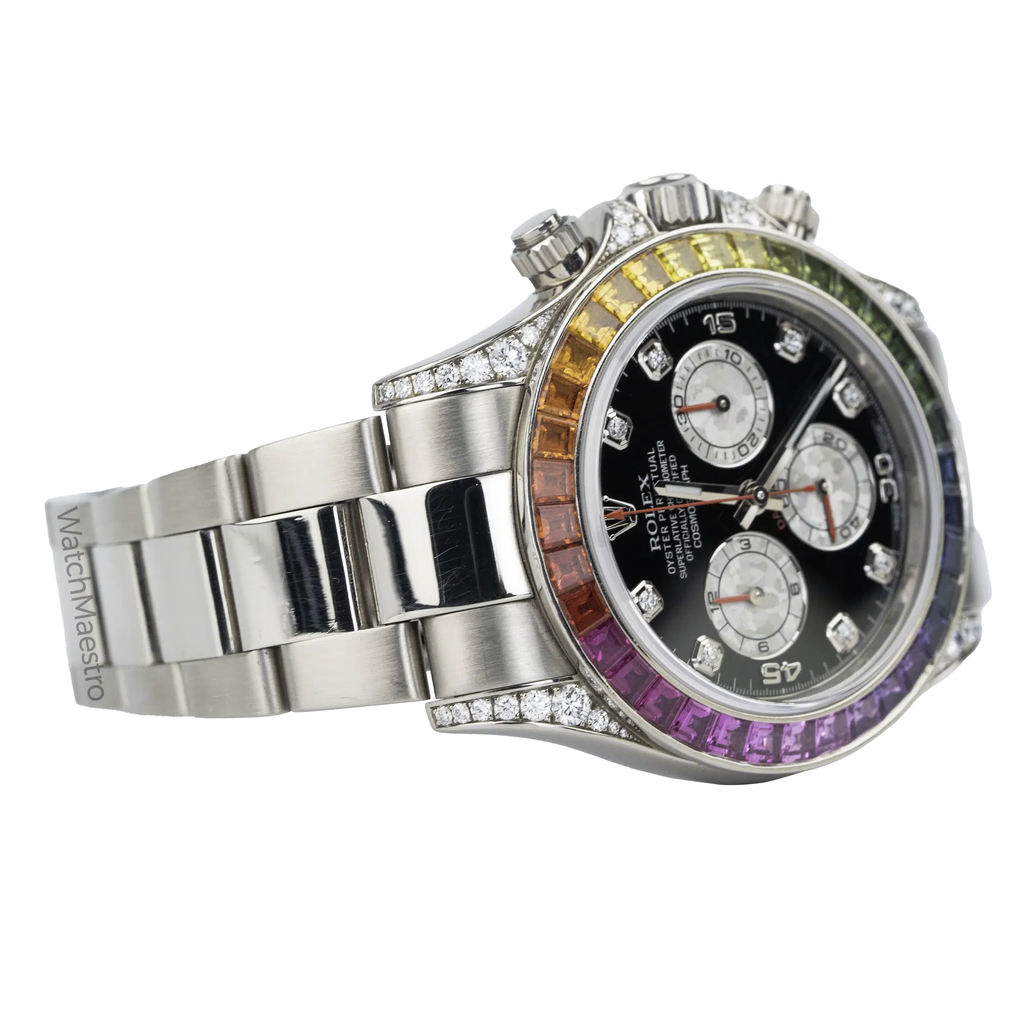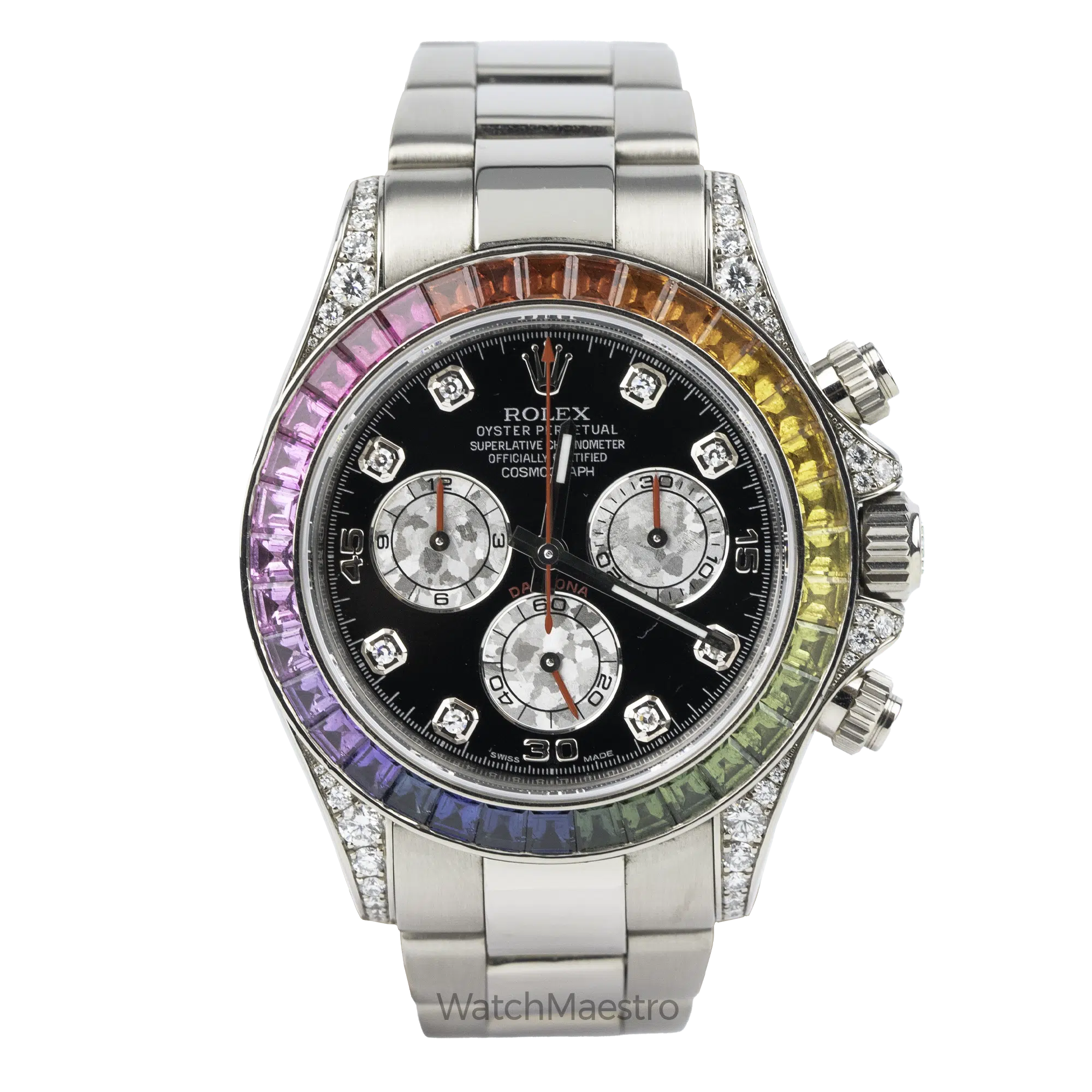 A true watch collector’s dream – the Rolex Rainbow Daytona White Gold. Adorned with an exceptionally rare factory-set Rainbow Bezel, this reference 116599RBOW is an off-catalog piece at Rolex, making it an extraordinarily rare find. It features 36 baguette-cut sapphires in a rainbow gradation and 56 diamonds spread around the case and the lugs of the watch. It even gets a 40mm Black dial with diamond-set hour markers. Purchased in 2013, the watch is still in a great condition and comes with its green Rolex warranty card. Connect with us on WhatsApp for more details and be part of the select few who can call this extraordinary piece their own.