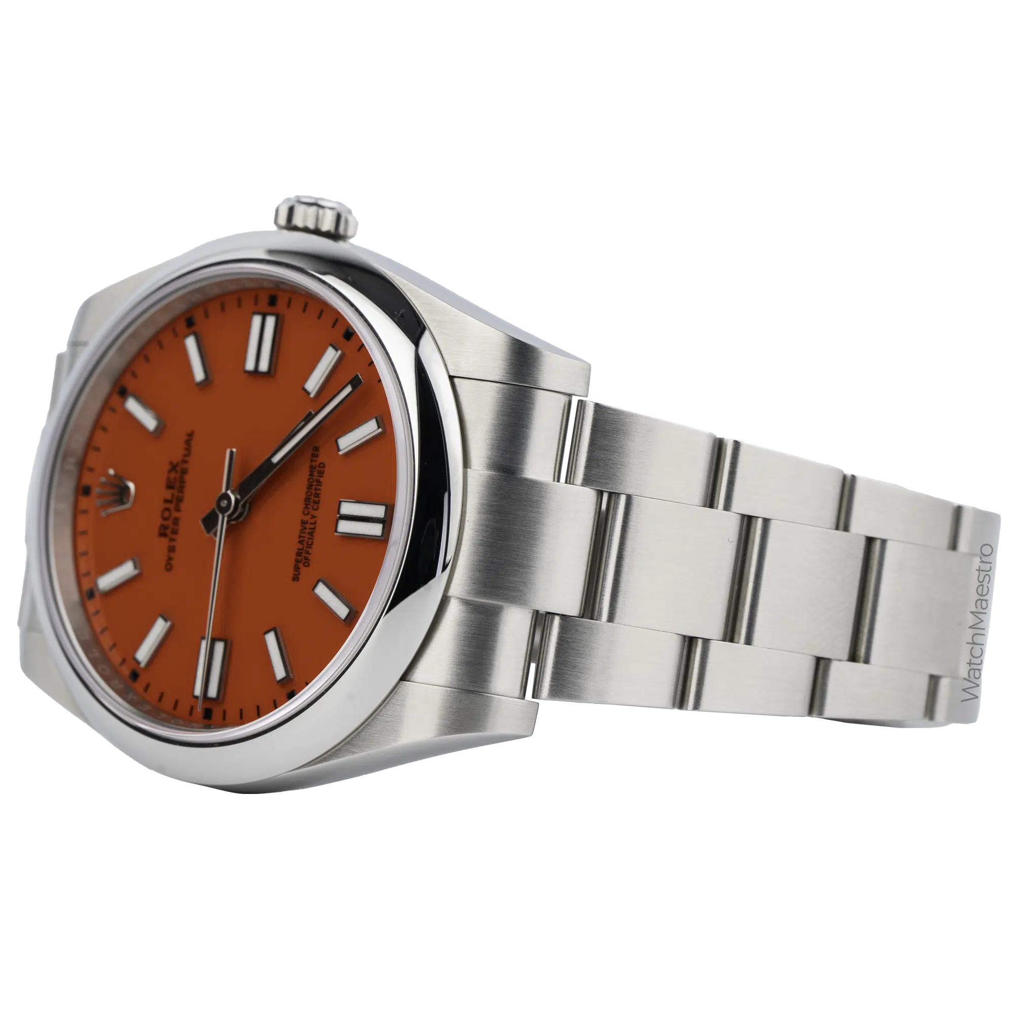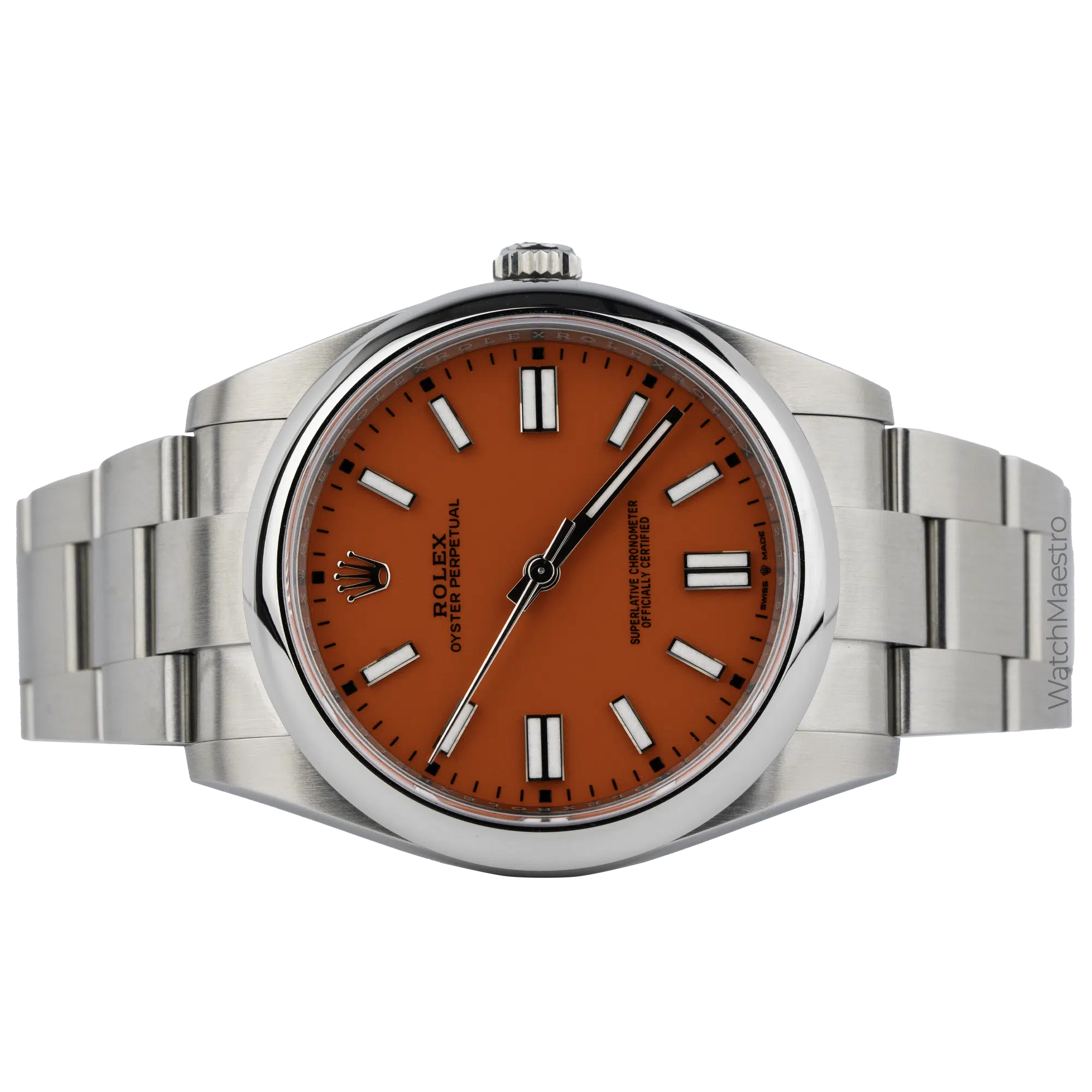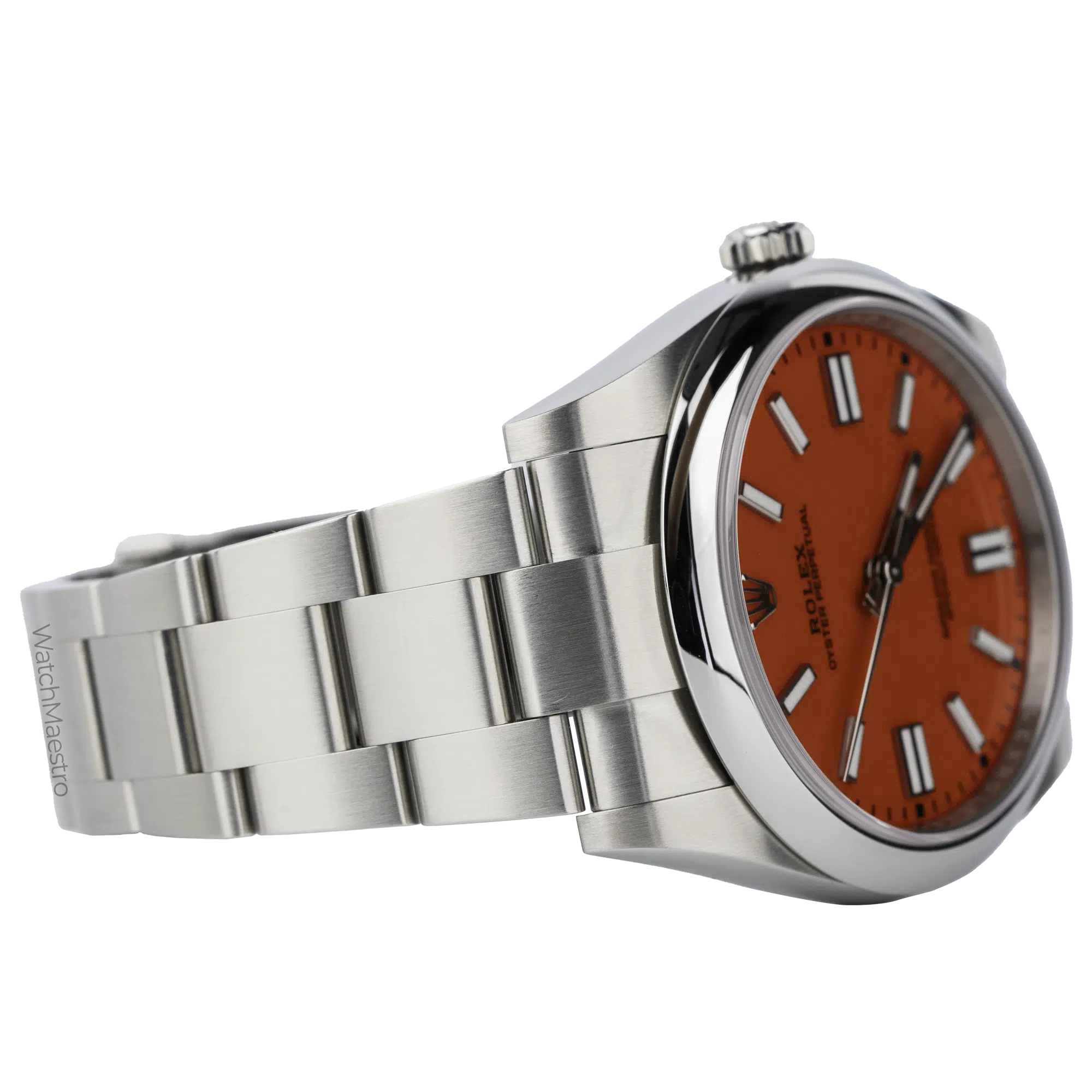 Rolex Oyster Perpetual 41mm — a true gem featuring a rare Coral Red Dial. The dial itself is enough to set this watch apart as a distinctive and sought-after timepiece. Now discontinued, this dial is even harder to find in the secondary market. This is one of the nicest-looking dials Rolex has ever added to the OP collection. This iconic watch was purchased in 2022, and it is still in brand-new condition. With its original box and papers, this watch is a complete package.