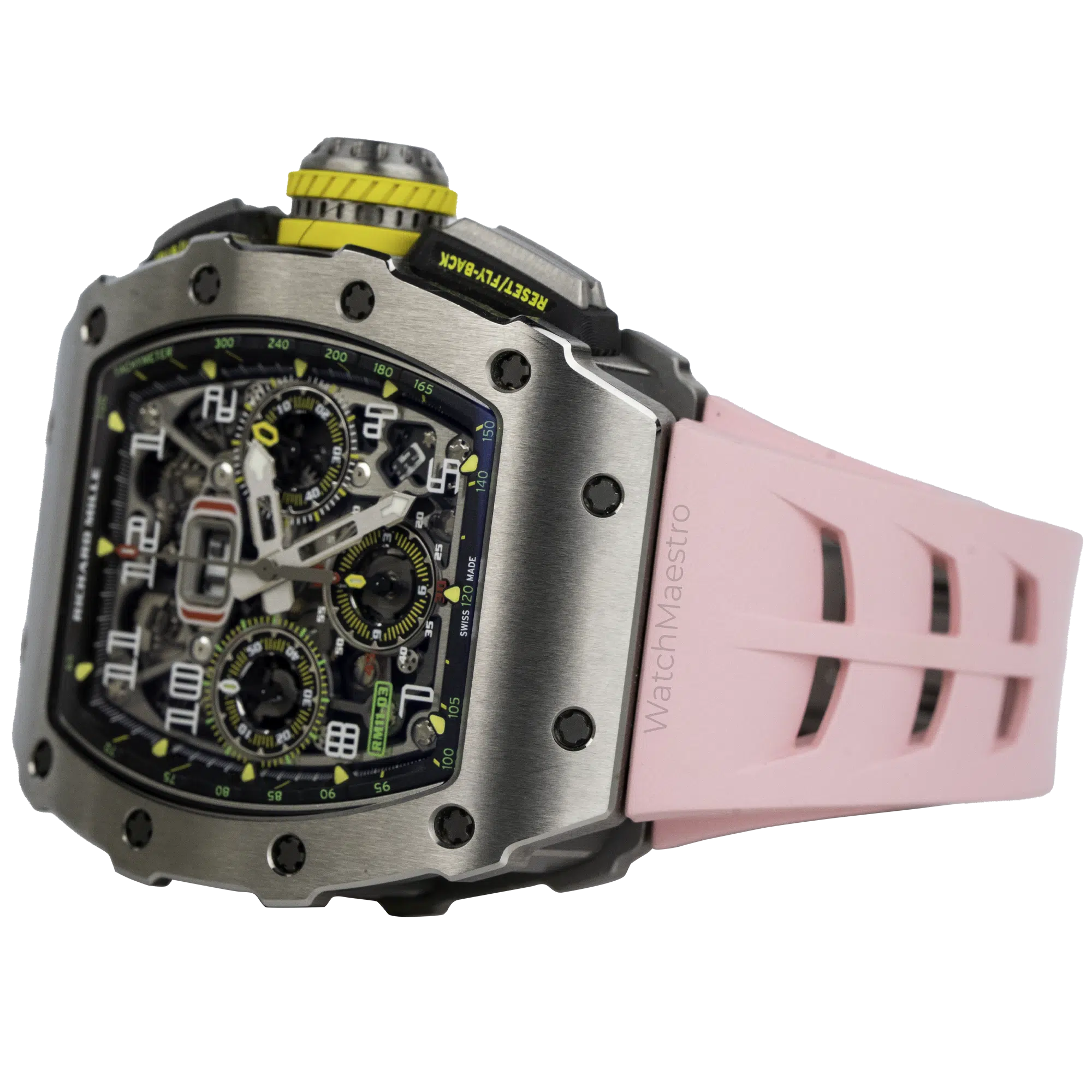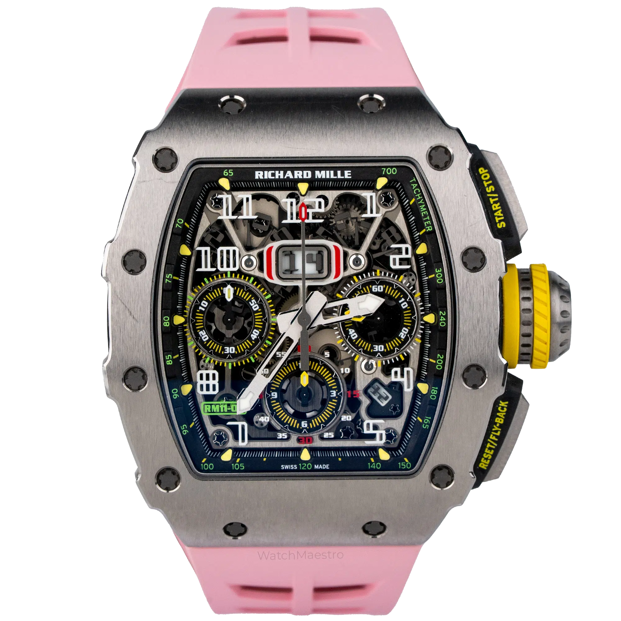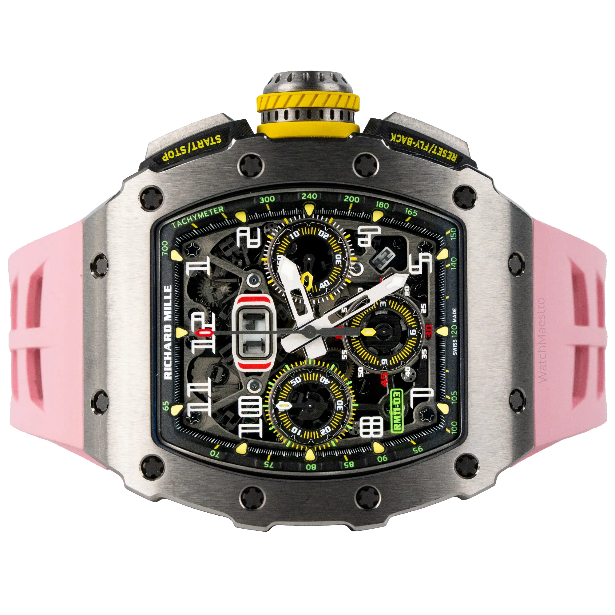 WatchMaestro presents you with the bold and stunning Richard Mille RM 11-03 in Titanium. This striking timepiece features a Skeleton Dial with Bold Numerals, providing a captivating view of its intricate mechanical movement. Crafted in Titanium, the RM 11-03 is paired with a vibrant Pink Rubber Strap, that will surely bring people’s attention towards your wrist. Its Automatic Flyback Chronograph function ensures precision and performance, making it a standout in both style and functionality. Originally purchased in 2020, the watch is presented in pre-owned, good condition. This exceptional watch comes complete with its original box and papers, ensuring its authenticity and provenance.