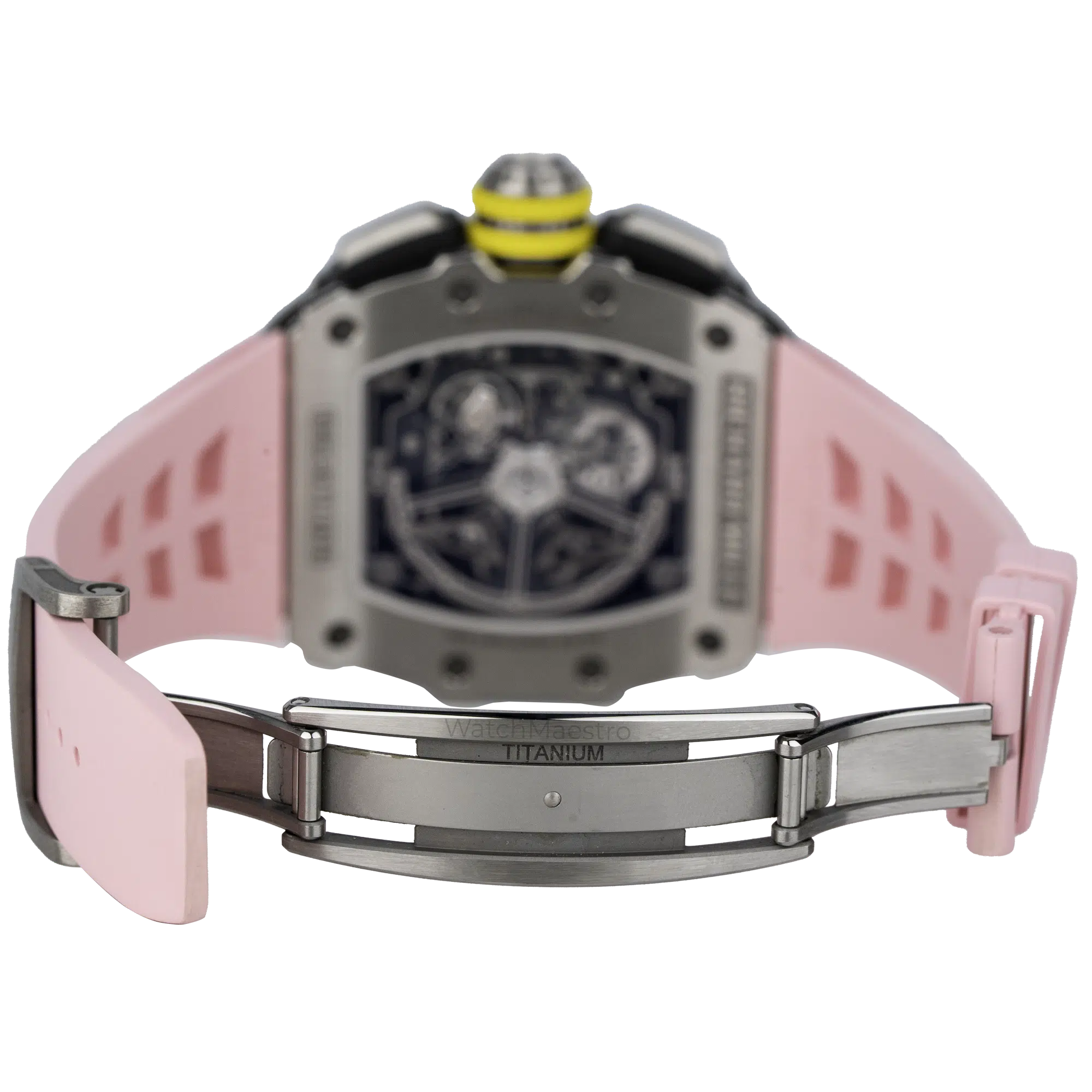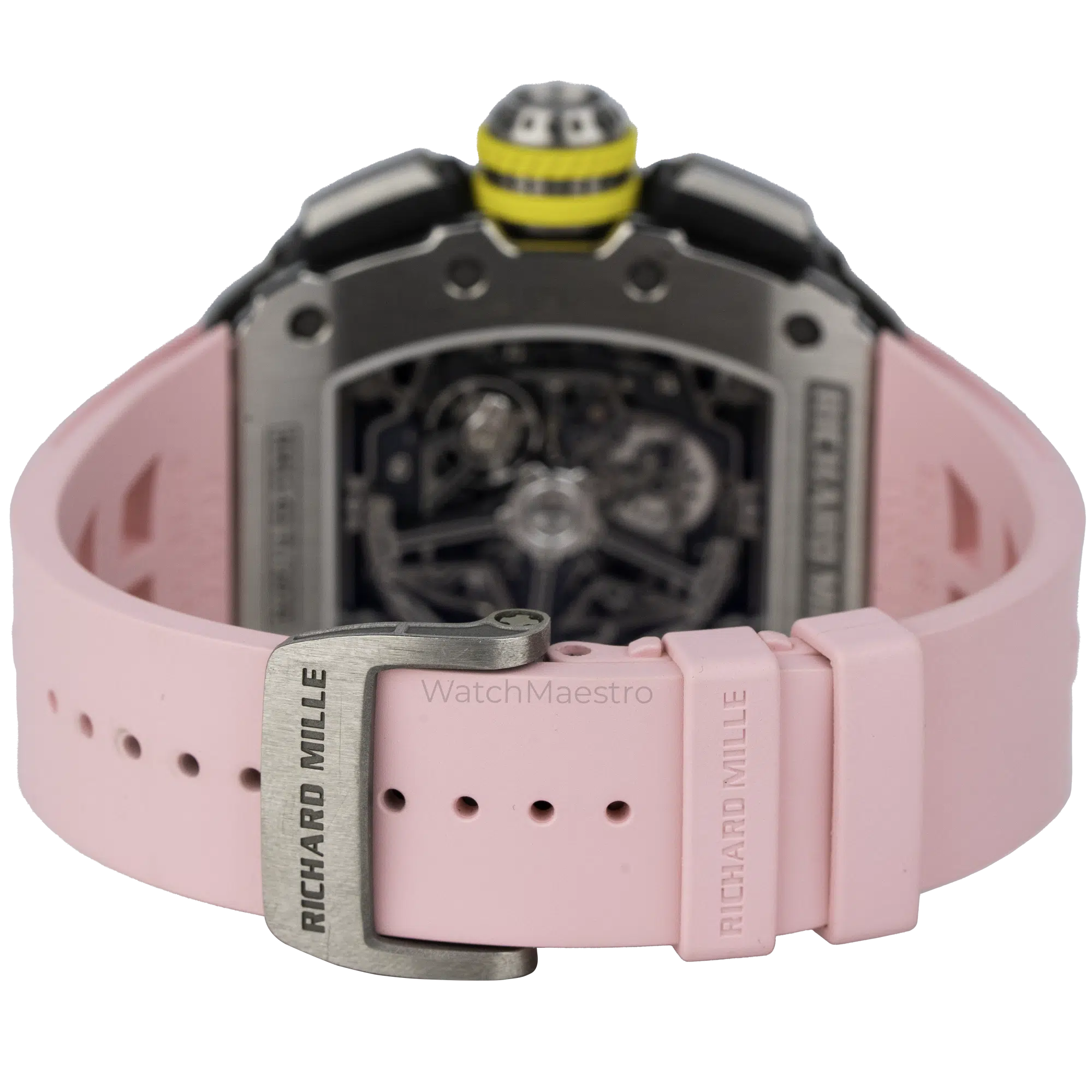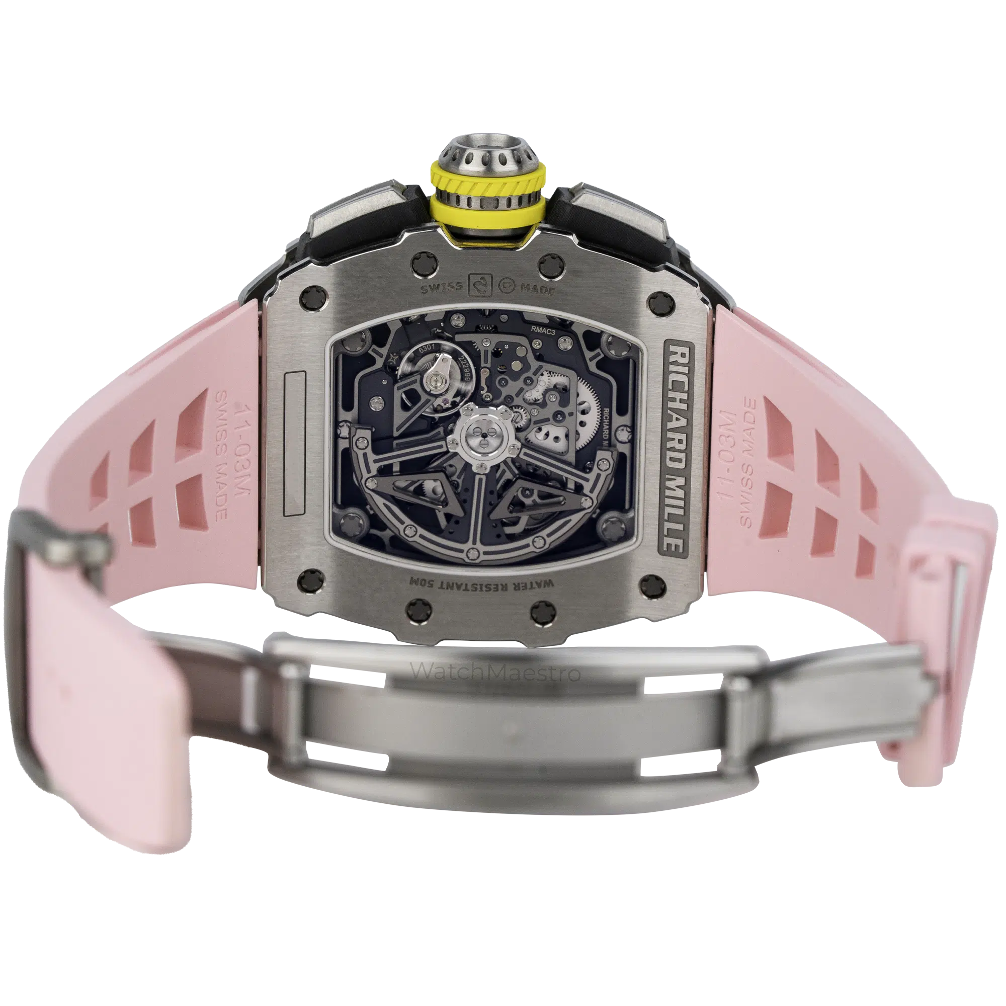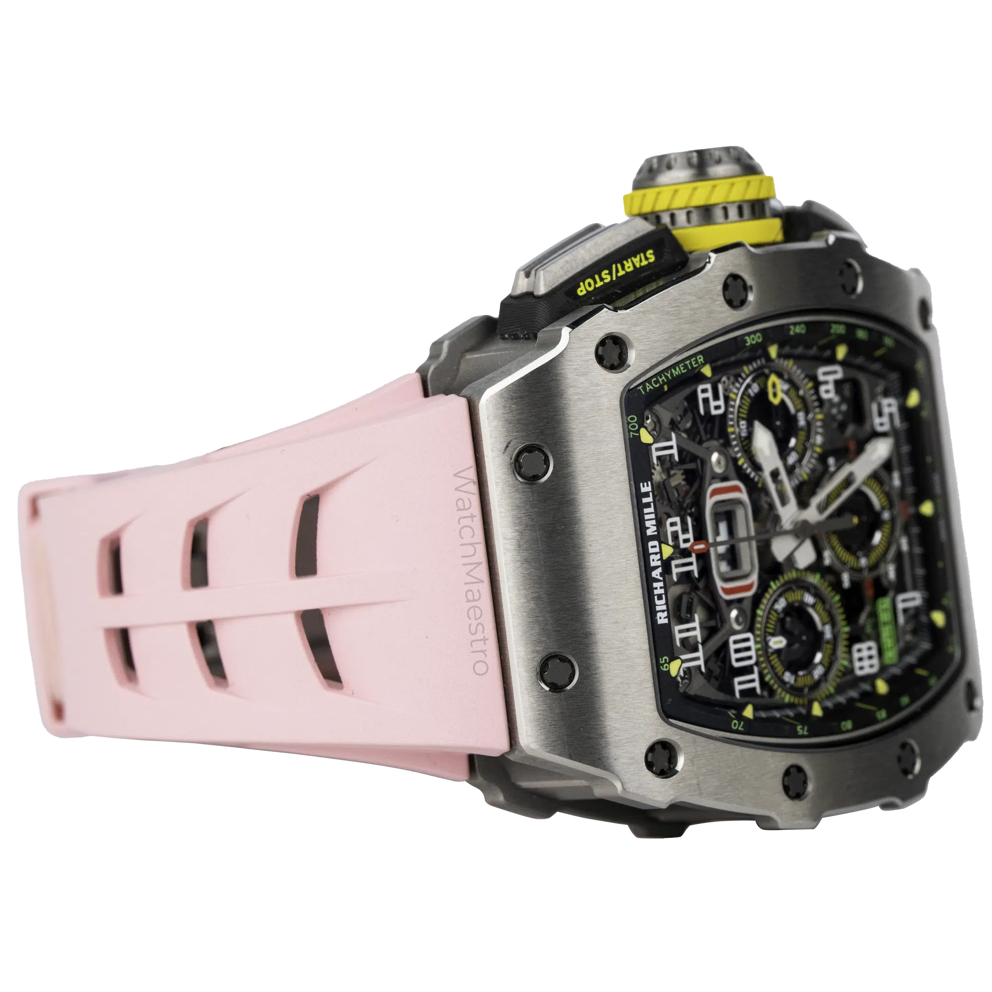 WatchMaestro presents you with the bold and stunning Richard Mille RM 11-03 in Titanium. This striking timepiece features a Skeleton Dial with Bold Numerals, providing a captivating view of its intricate mechanical movement. Crafted in Titanium, the RM 11-03 is paired with a vibrant Pink Rubber Strap, that will surely bring people’s attention towards your wrist. Its Automatic Flyback Chronograph function ensures precision and performance, making it a standout in both style and functionality. Originally purchased in 2020, the watch is presented in pre-owned, good condition. This exceptional watch comes complete with its original box and papers, ensuring its authenticity and provenance.