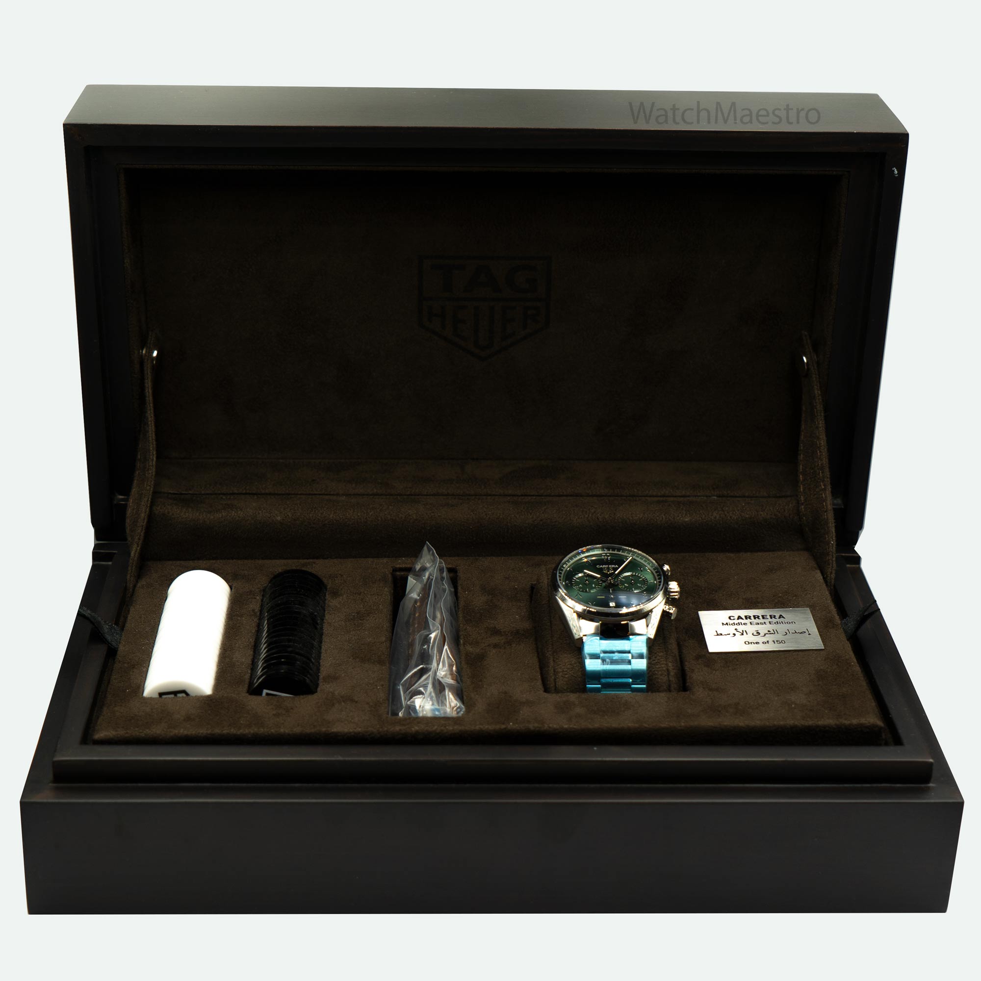 This is a brand-new Tag Heuer Carrera Middle East Limited Edition 42mm watch. The reference CBN2014.BA0642 is powered by the Calibre Heuer 02 self-winding automatic movement. It features a green dial with Arabic numerals on it. It is a limited edition watch and this is one of the 150 pieces ever made. This elegant timepiece was purchased in December 2021 and it comes complete with a box and papers and it still has the stickers on it. Interestingly, the watch comes with an additional strap and the box of the watch has a backgammon game.