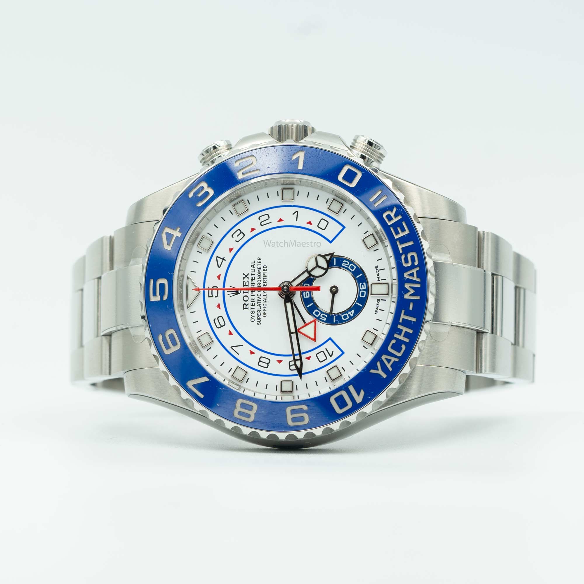 This is an unworn Rolex Yacht-Master II reference 116680 with some factory stickers still on it. Complete with its box and papers, this is the perfect watch for someone looking to buy a brand-new Rolex. Purchased in 2021, the watch is currently available at a great deal. It features a 44mm White Dial with the Cerachrom Blue bezel making for an absolutely stunning combination.