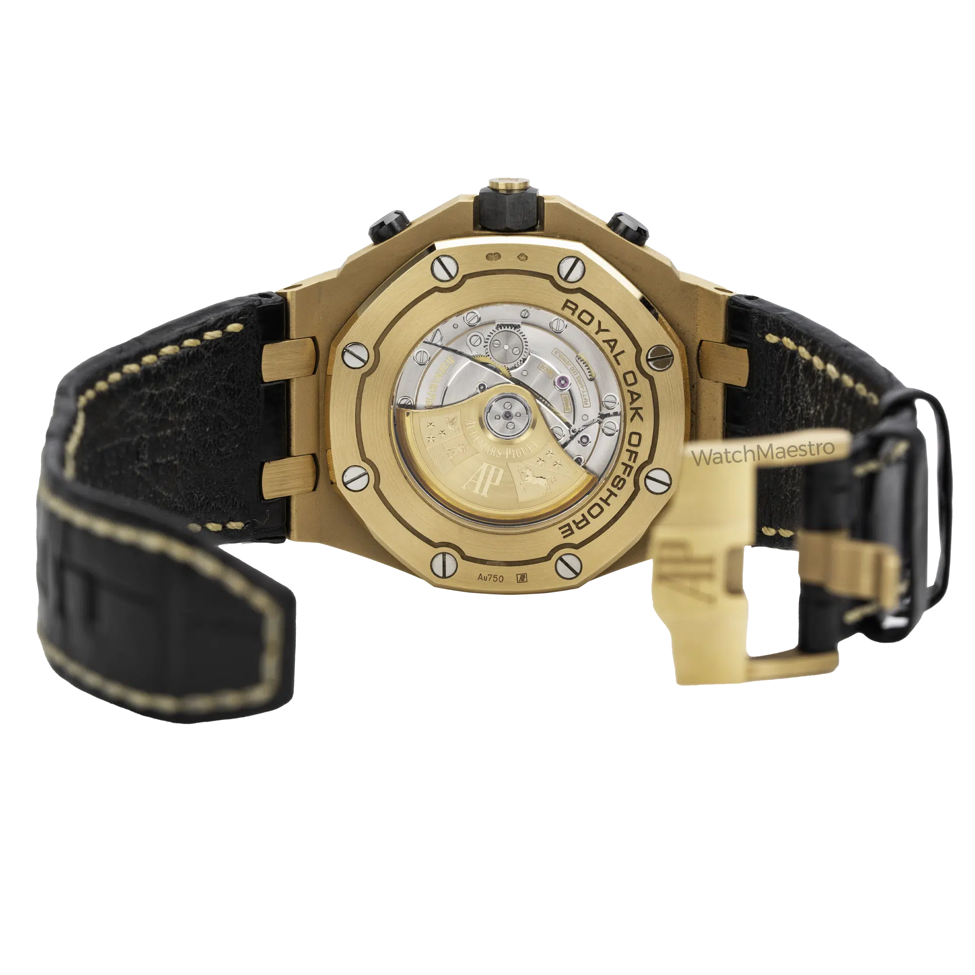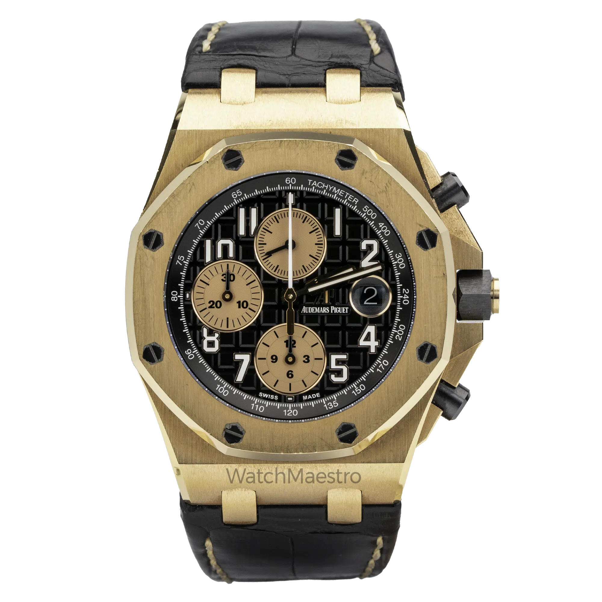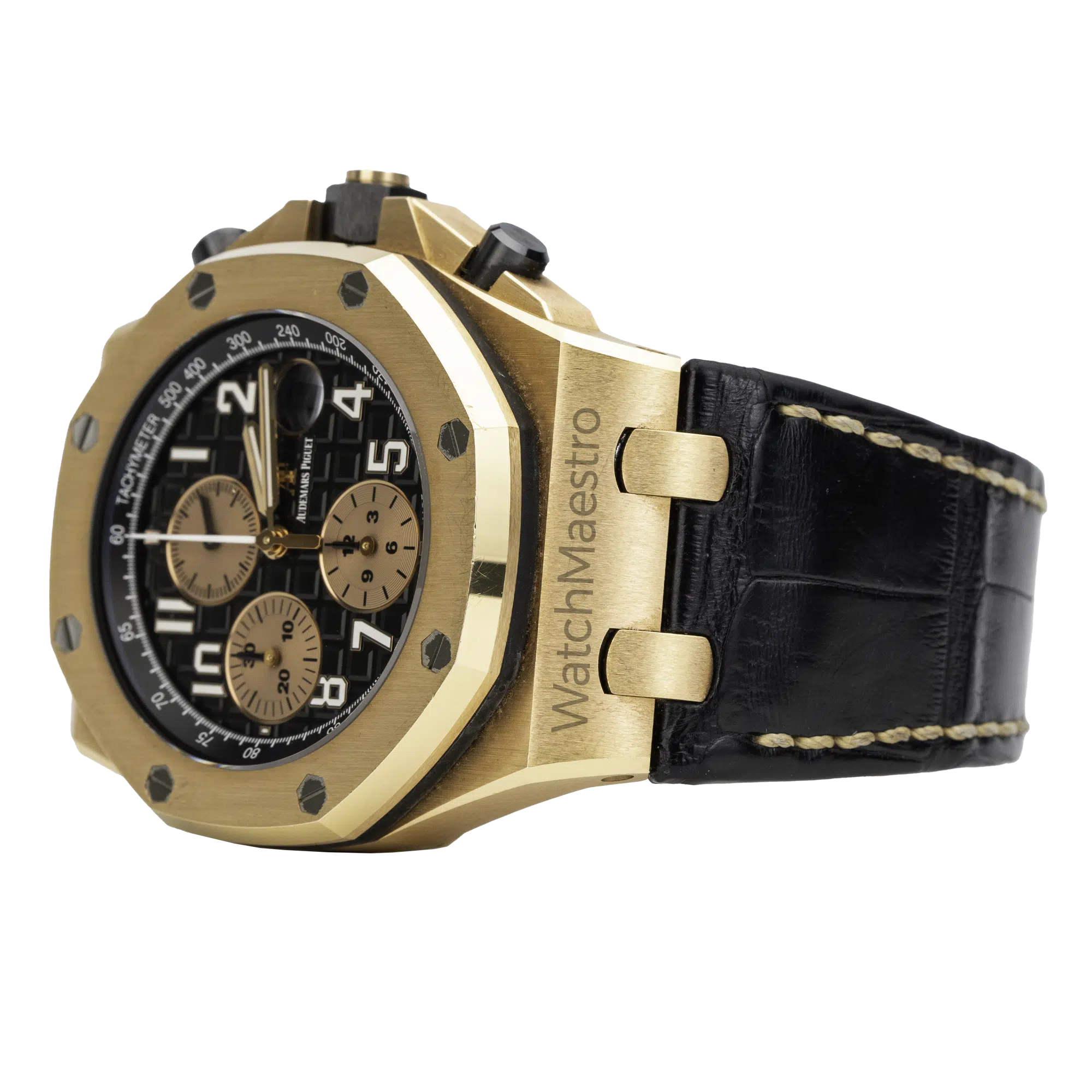 This is the Audemars Piguet Royal Oak Offshore Chronograph 42mm — a pre-owned timepiece that comes complete with its box and papers. The watch features Black Dial with pink gold-toned counters and the distinctive Méga Tapisserie pattern. It also flaunts the bold numerals that not only enhance legibility but also contribute to the watch’s distinctive and commanding aesthetic. Encased in Rose Gold, this timepiece boasts a robust yet refined presence. It is further complemented by a hand-stitched black alligator strap that adds a touch of luxury and comfort. Purchased originally in 2019 the watch is still in a relatively good condition with only minor usage marks here and there. Pick up the watch today and get a 2-year WatchMaestro warranty with it.