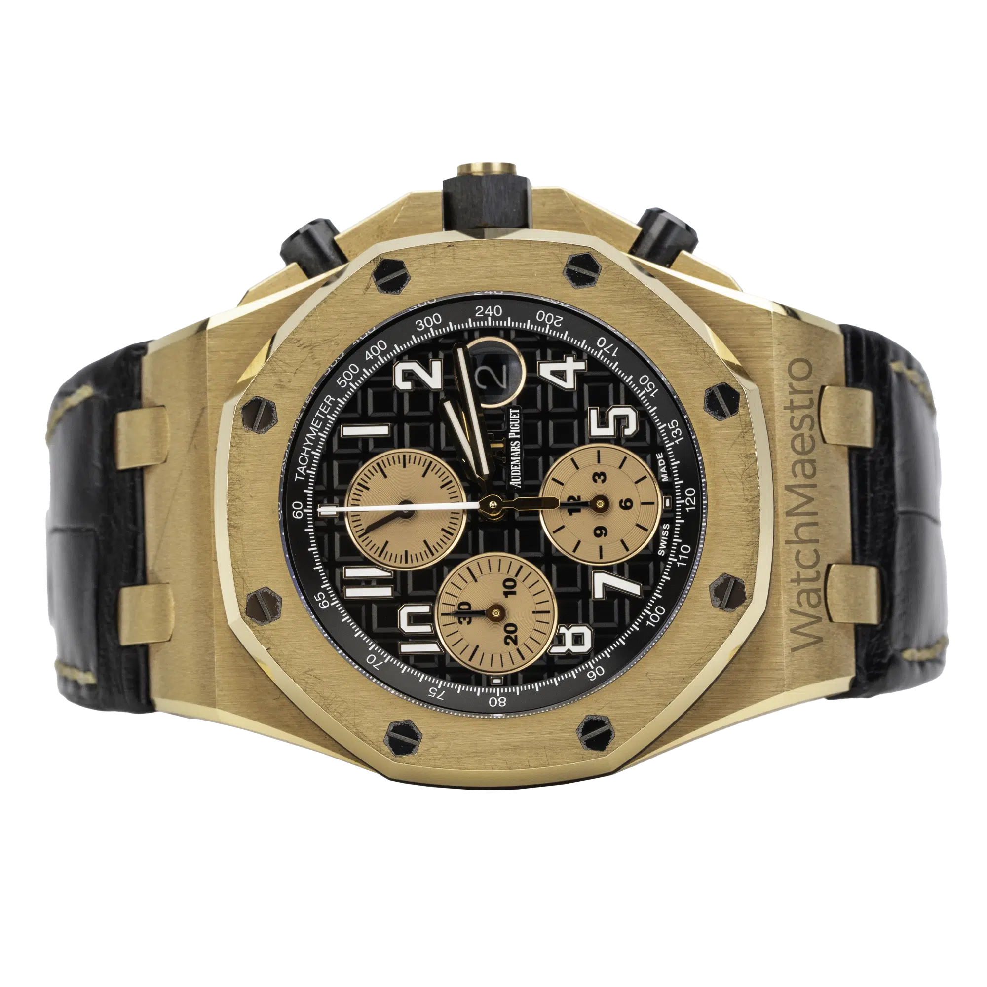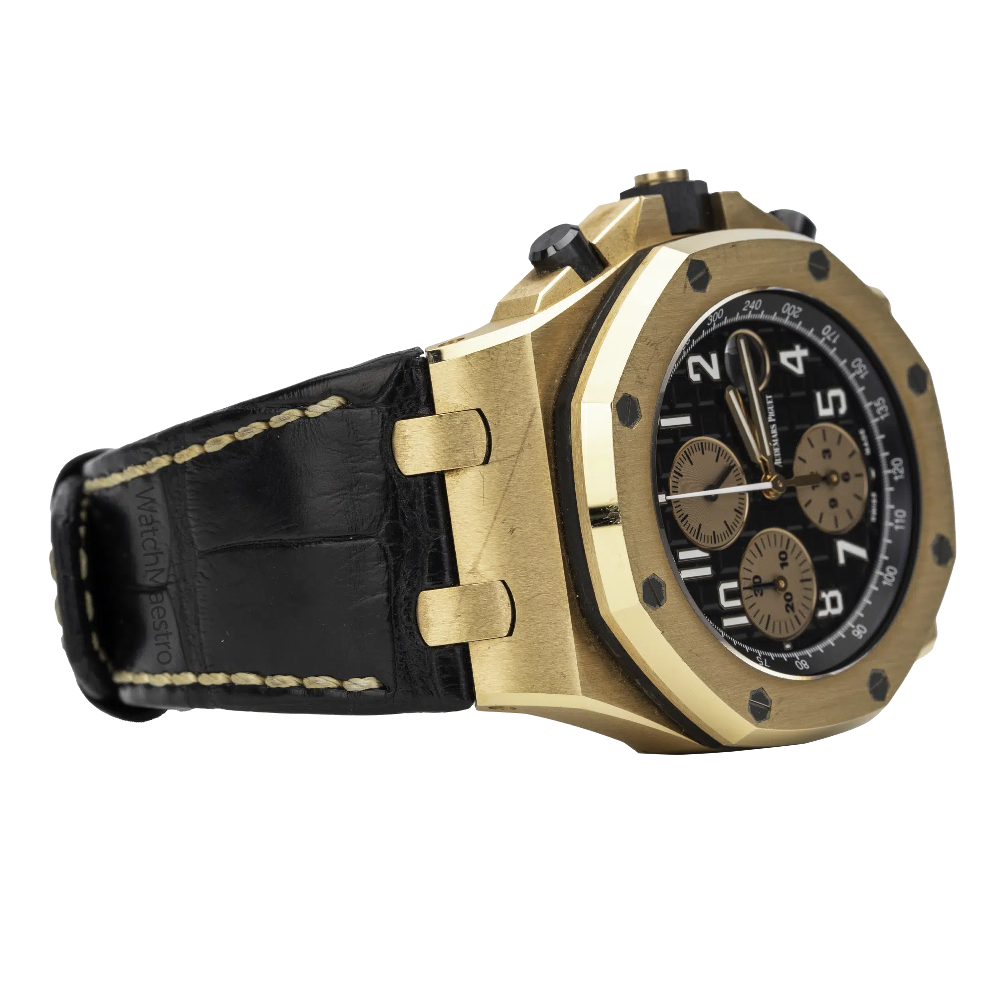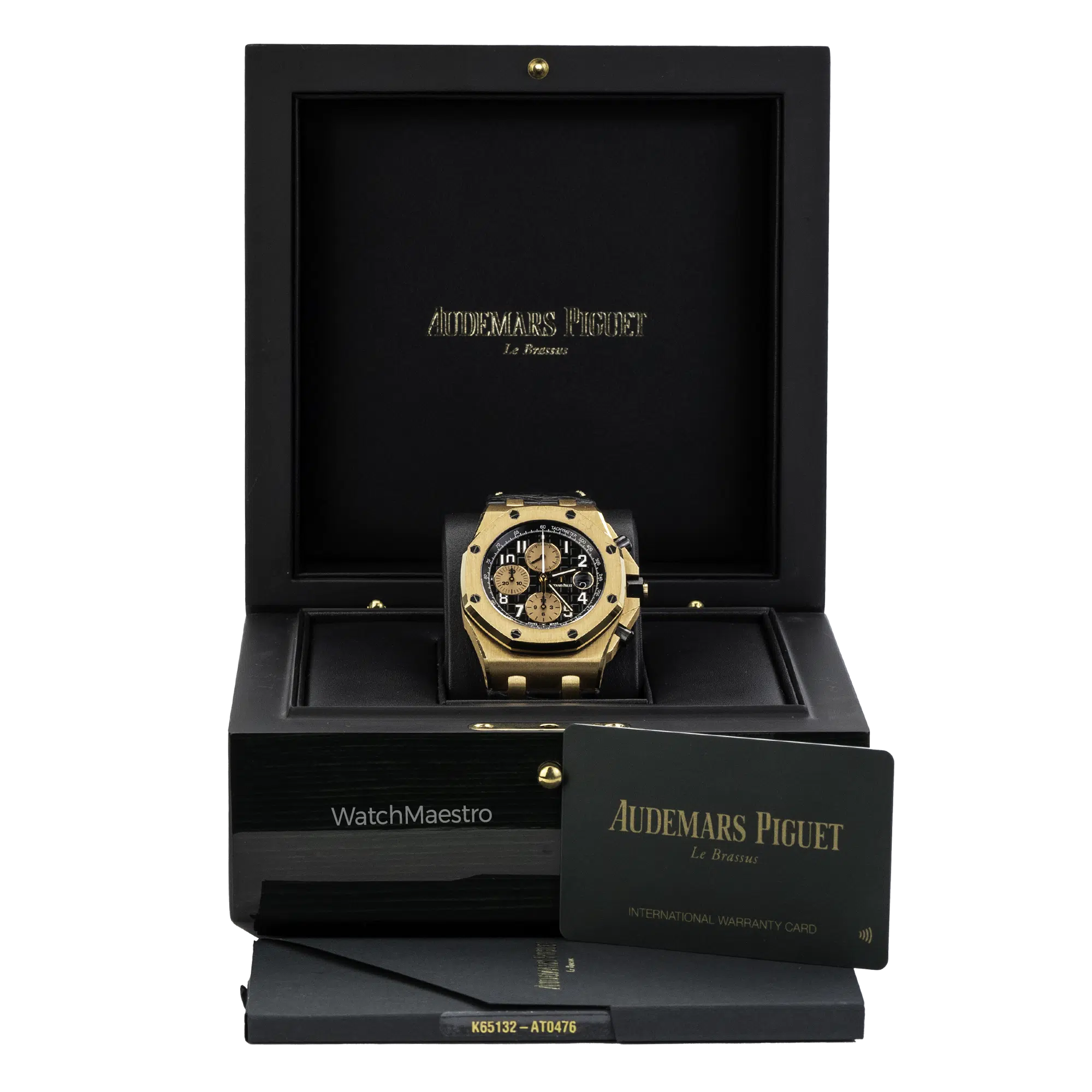This is the Audemars Piguet Royal Oak Offshore Chronograph 42mm — a pre-owned timepiece that comes complete with its box and papers. The watch features Black Dial with pink gold-toned counters and the distinctive Méga Tapisserie pattern. It also flaunts the bold numerals that not only enhance legibility but also contribute to the watch’s distinctive and commanding aesthetic. Encased in Rose Gold, this timepiece boasts a robust yet refined presence. It is further complemented by a hand-stitched black alligator strap that adds a touch of luxury and comfort. Purchased originally in 2019 the watch is still in a relatively good condition with only minor usage marks here and there. Pick up the watch today and get a 2-year WatchMaestro warranty with it.