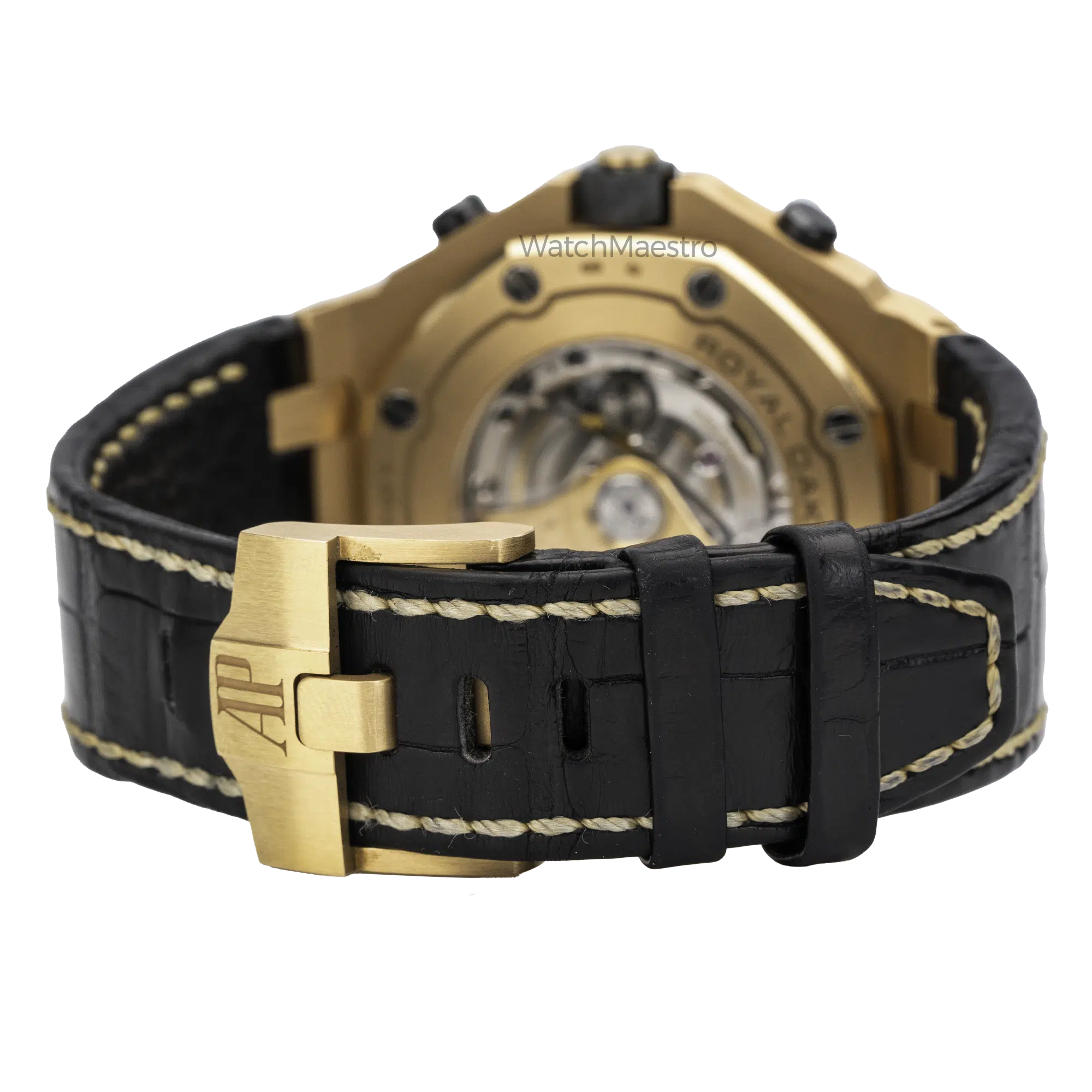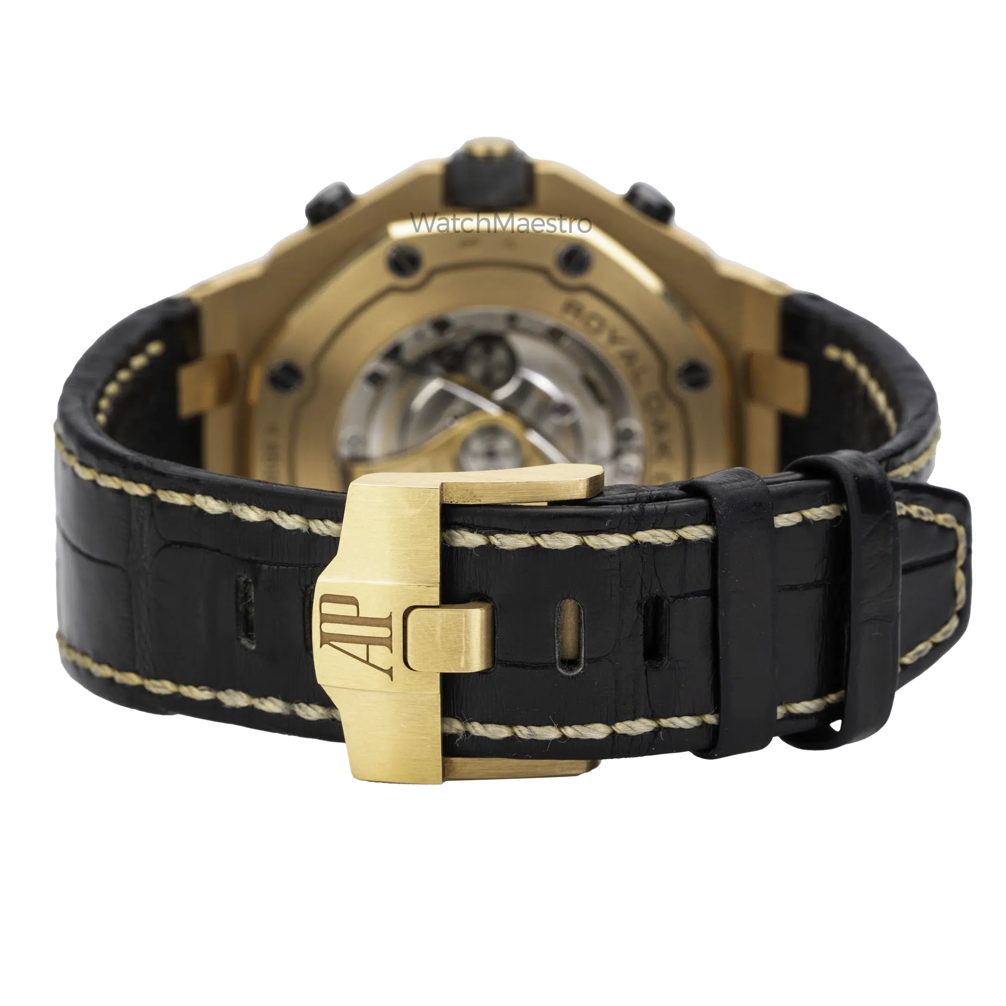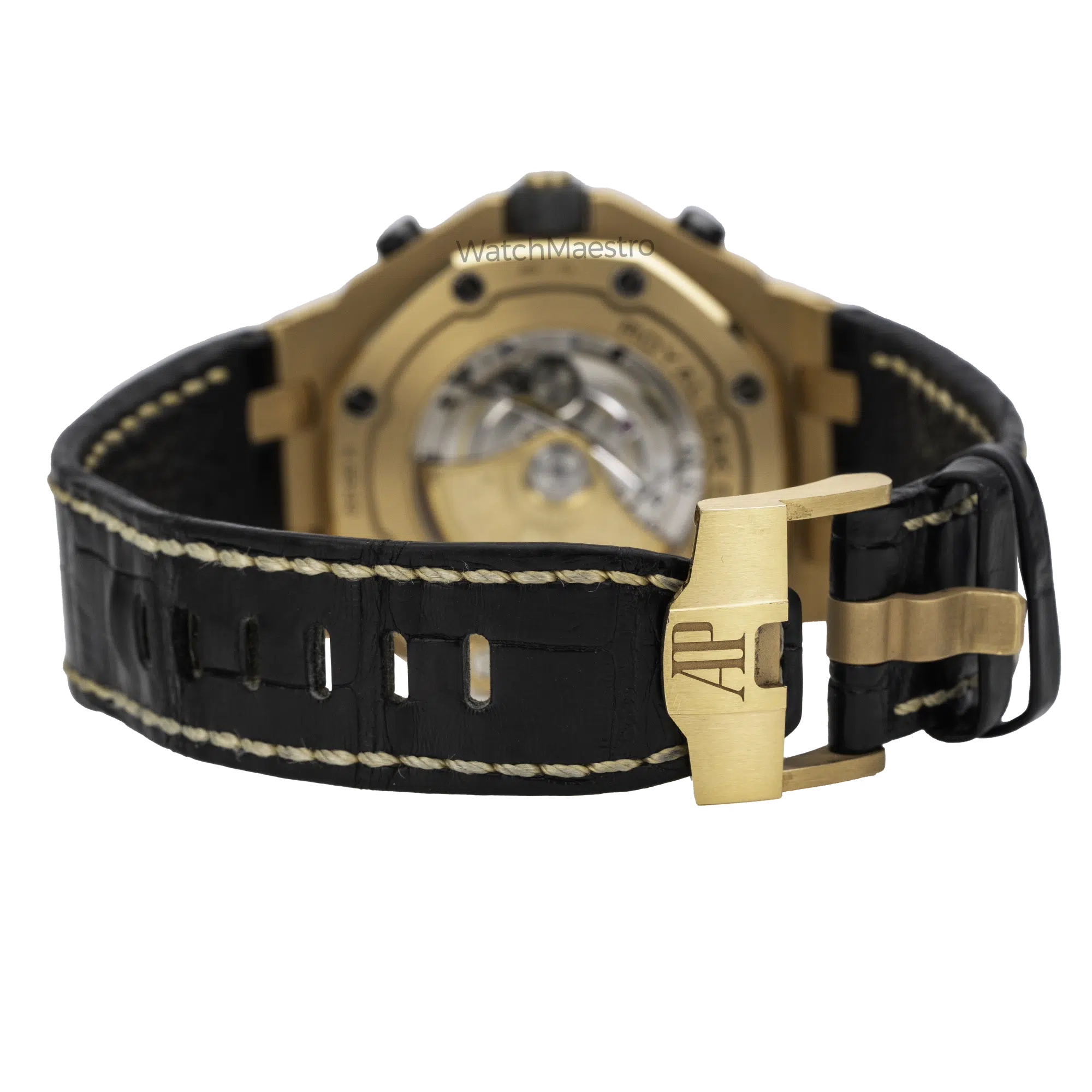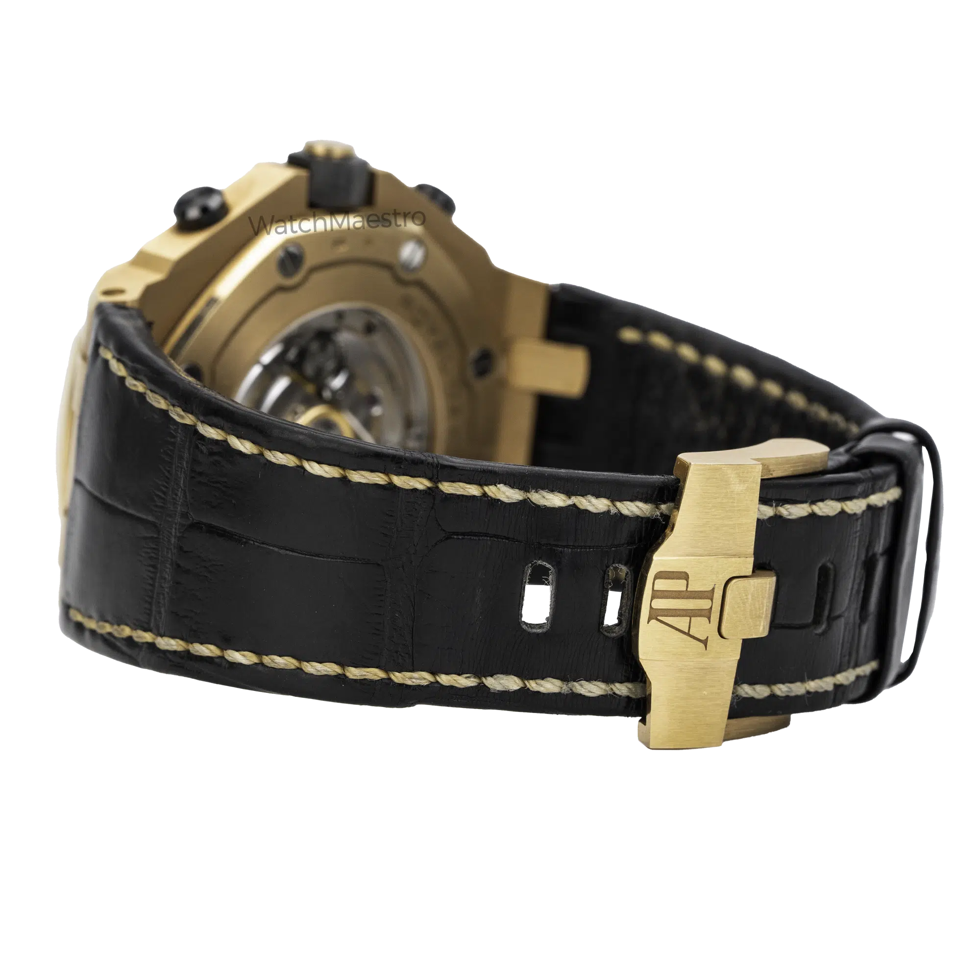 The Royal Oak Offshore 26470OR comes with a Chronograph complication and features a very aesthetically pleasing design. The whole combination of the Rose Gold Case, Black Dial and the alligator strap all blend in together so well.