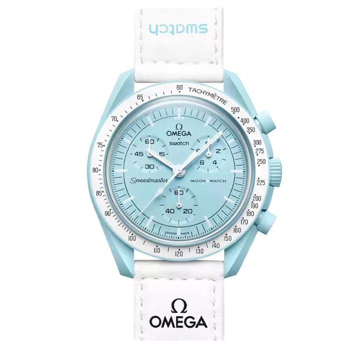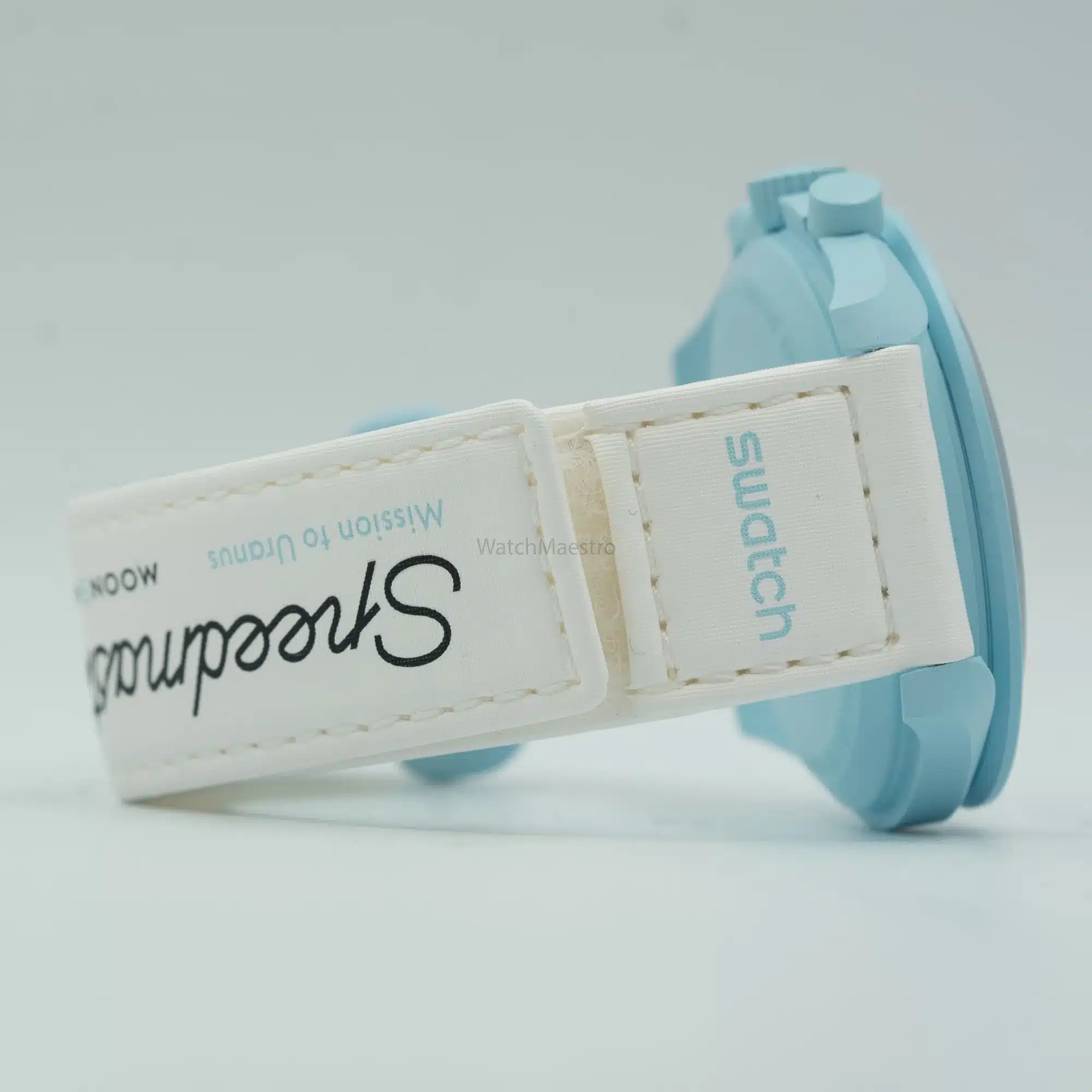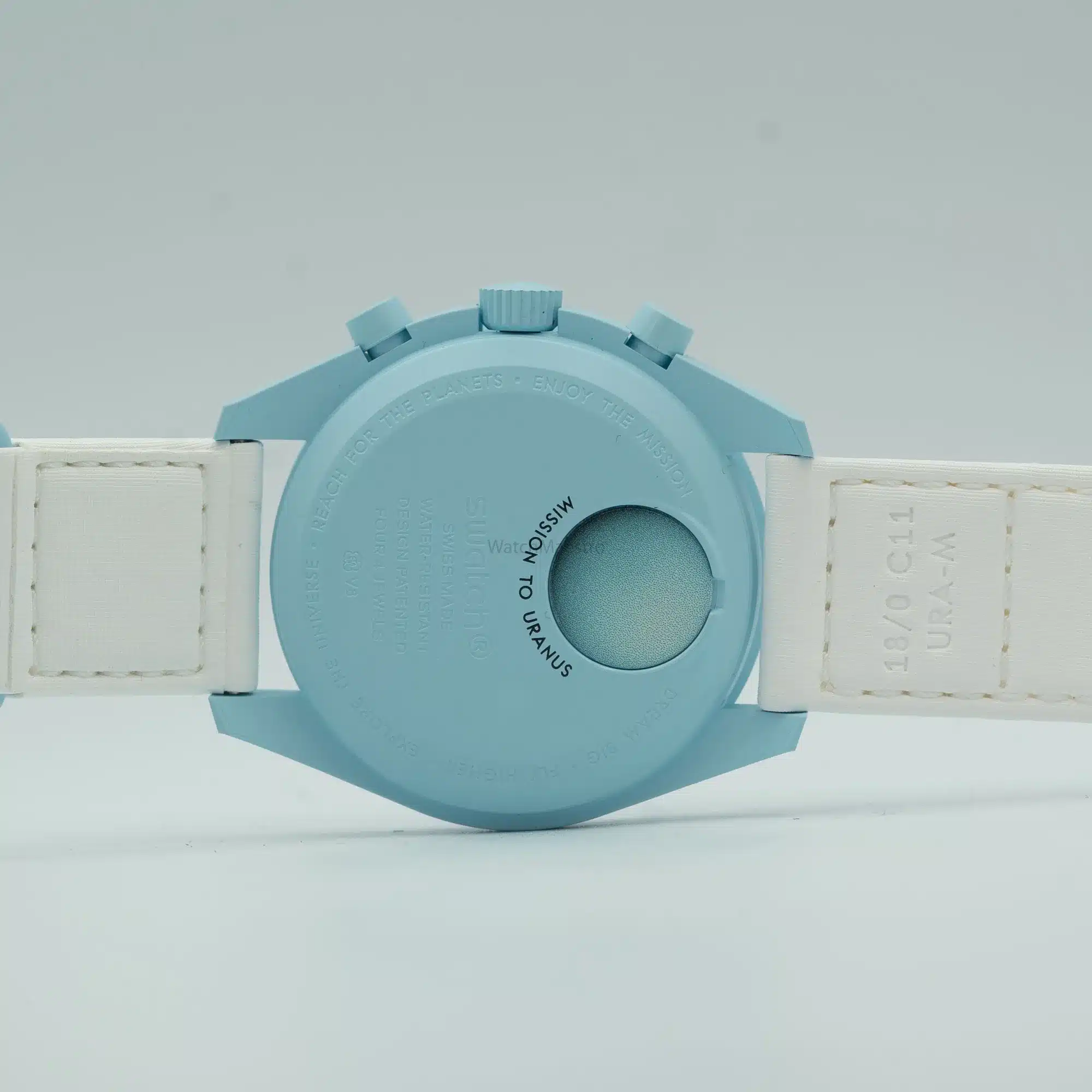 The Uranus Moonswatch has a bioceramic case measuring 42mm and an adjustable velcro strap. Also, being powered by a quartz movement, this cross-over watch weighs almost nothing. Inspired by the Omega Speedmaster, its dial displays a chronograph seconds hand along with three sub-dials.