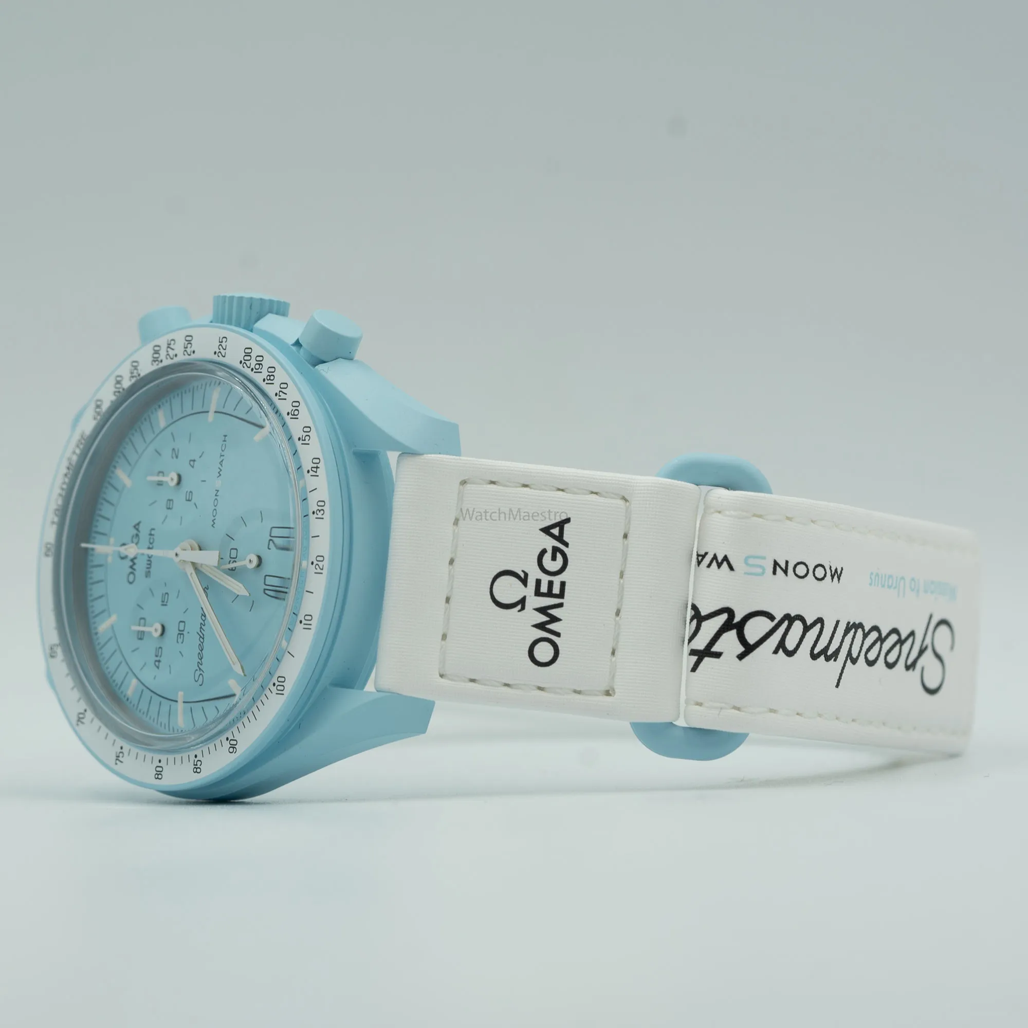 This is a brand-new Omega x Swatch Moonswatch Mission to Uranus. The watch was purchased in 2022 and comes complete with box and papers. The timepiece features a 42mm blue dial and a white bezel. Paired with a white strap, the watch looks absolutely stunning.