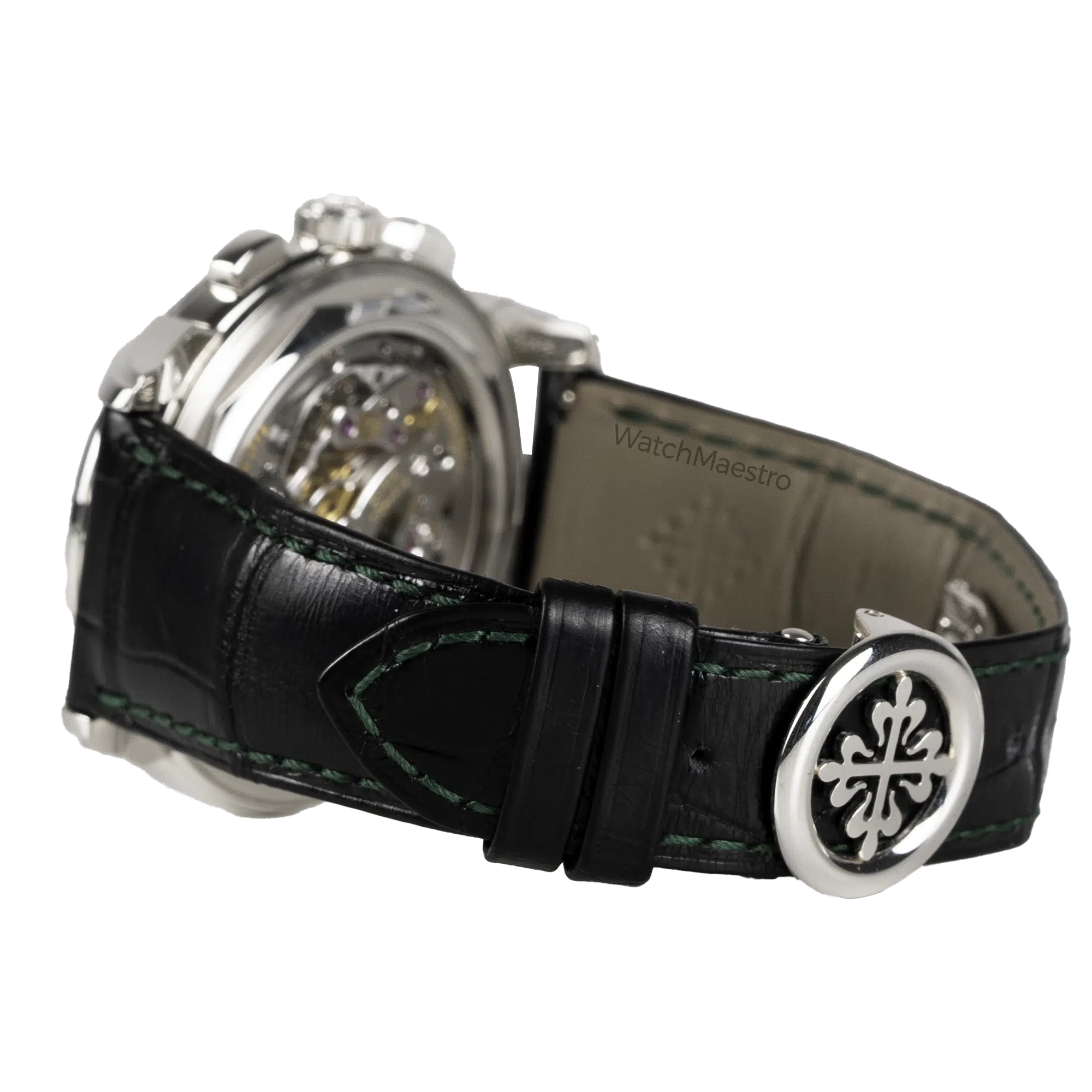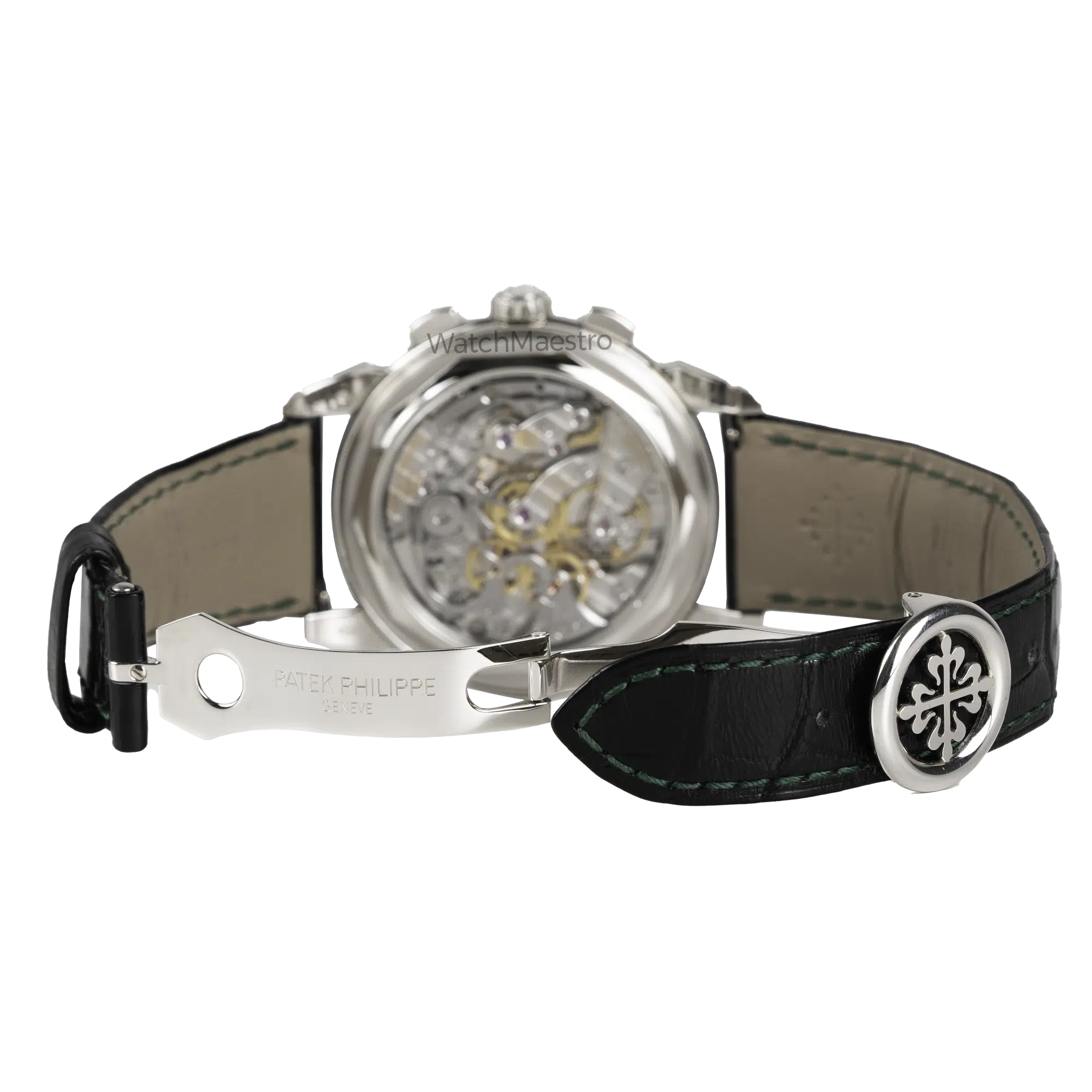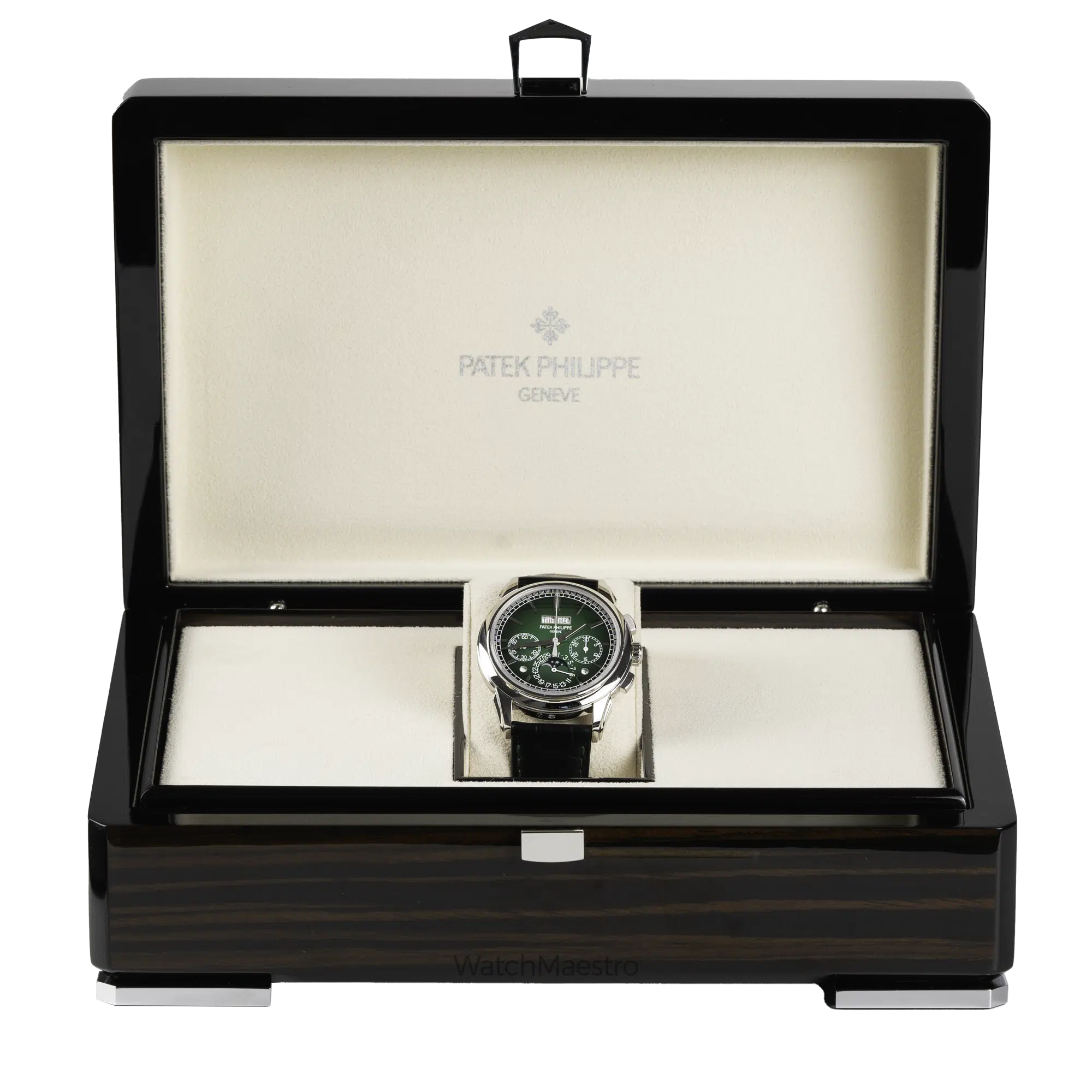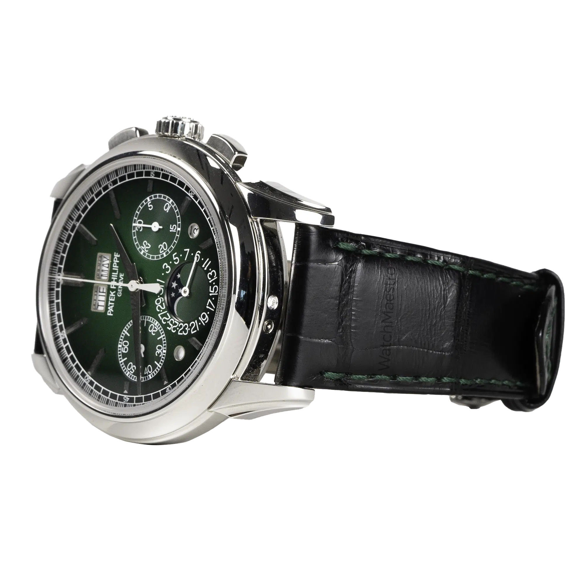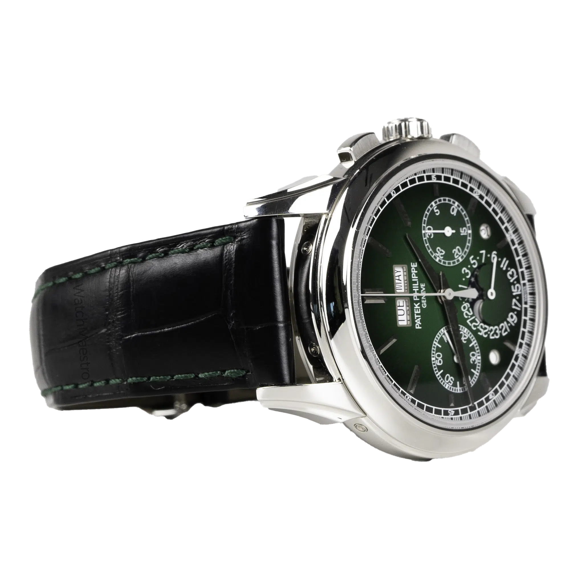 Indulge in the pinnacle of horology with the Patek Philippe Grand Complications reference 5270P. In a like-new condition, this 41mm masterpiece redefines luxury and precision. The lavish Lacquered Green Dial, encased within a Platinum Case, captivates with its rich color and intricate detailing. This exceptional watch sits on an Alligator leather strap, offering both comfort and a touch of style. Purchased in 2022, this Patek Philippe Grand Complications arrives with its original box and papers, ensuring authenticity. There is a lot going on with this watch as it offers a Chronograph function along with a Perpetual Calendar. On top of that, the watch also gets a Moonphase indicator, making it one of the most complicated and feature-rich mechanical watches out there.