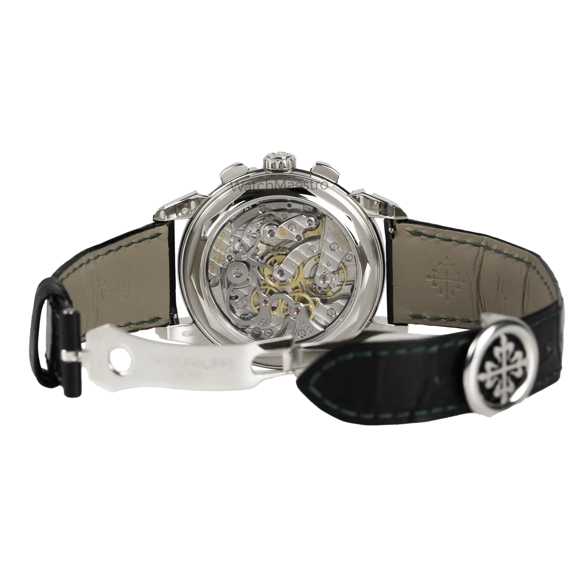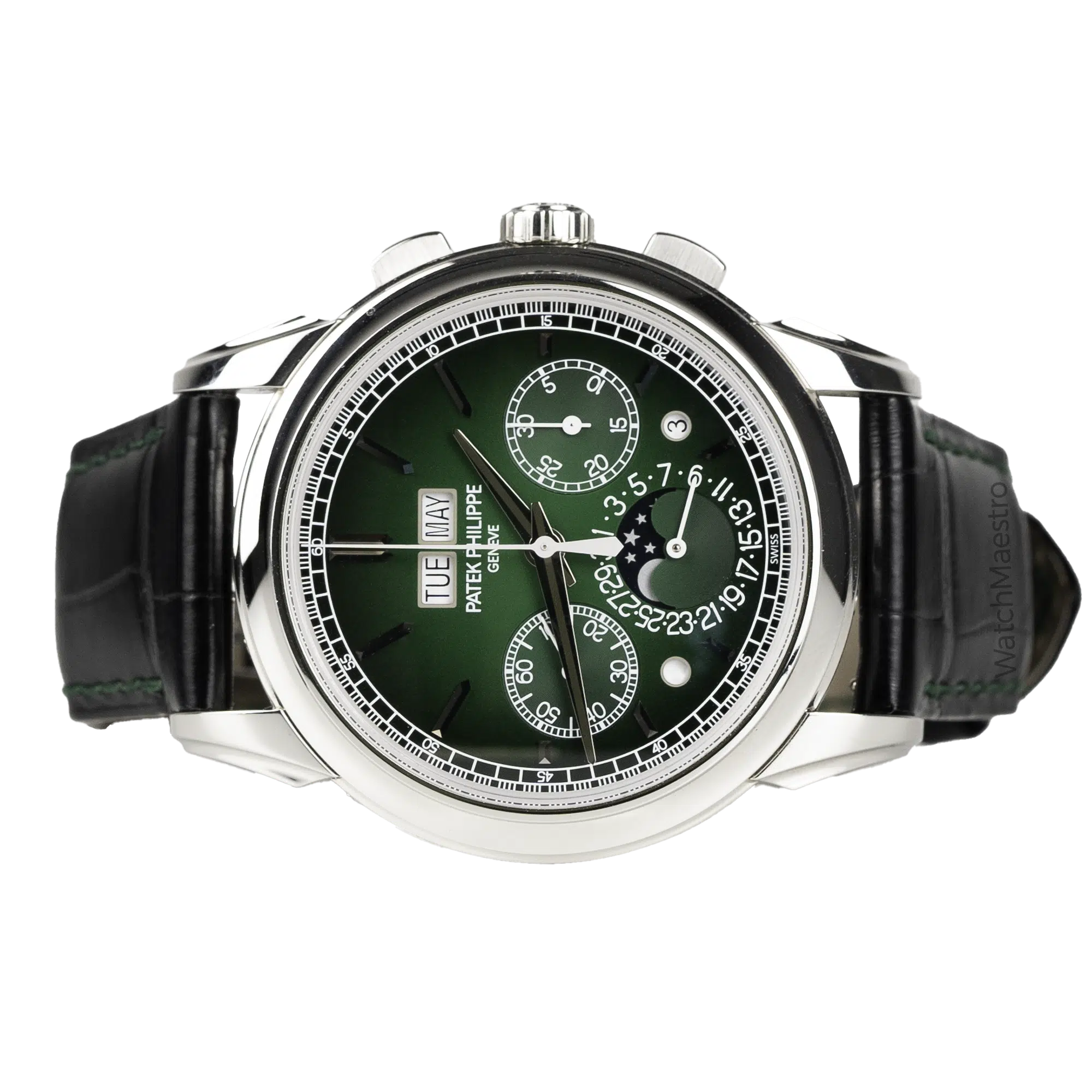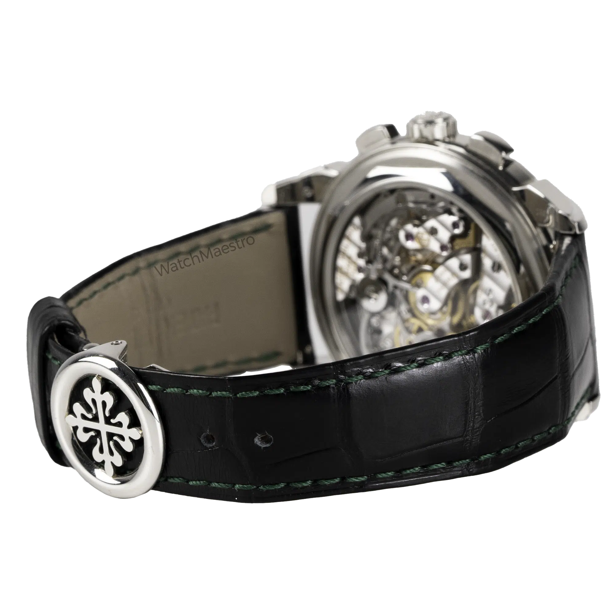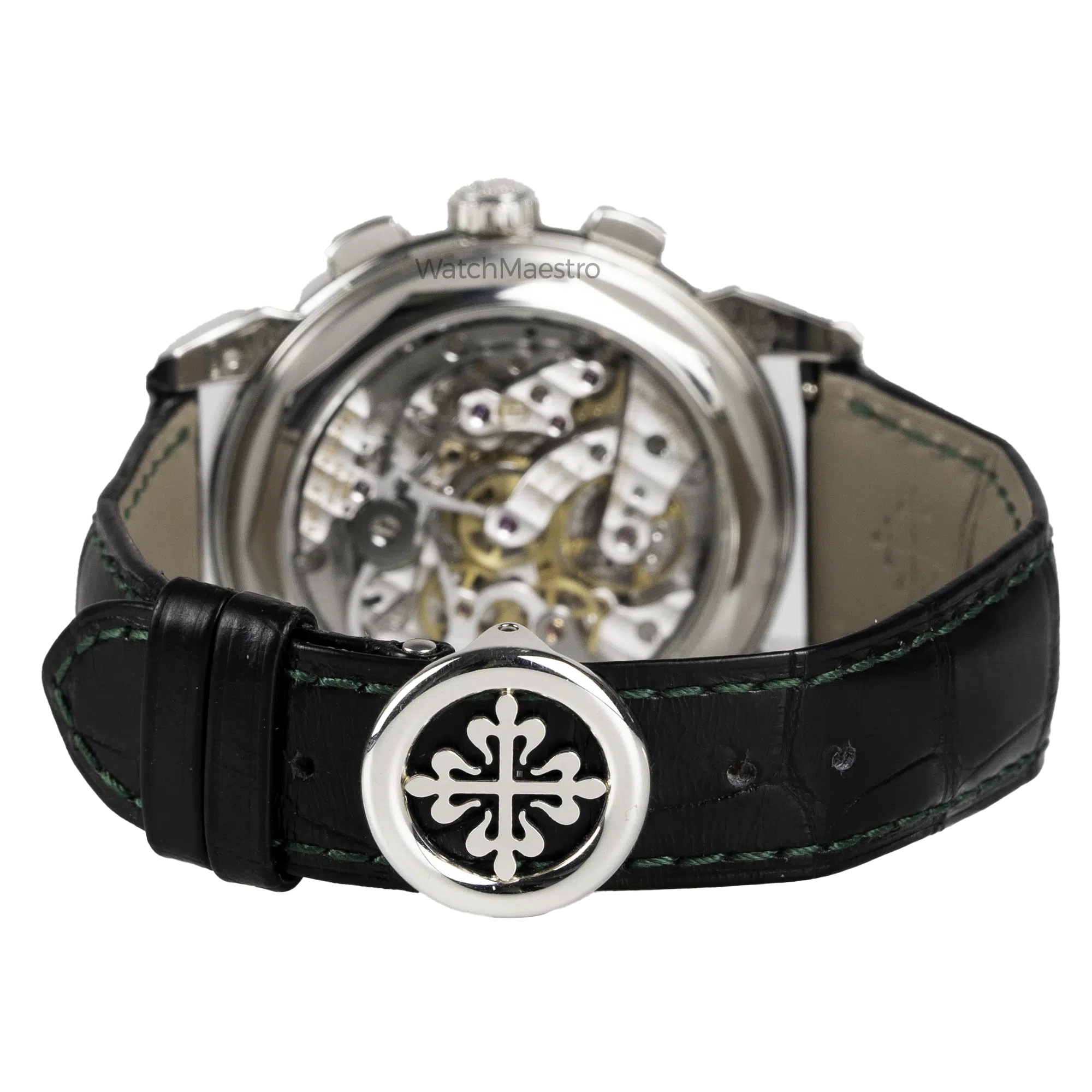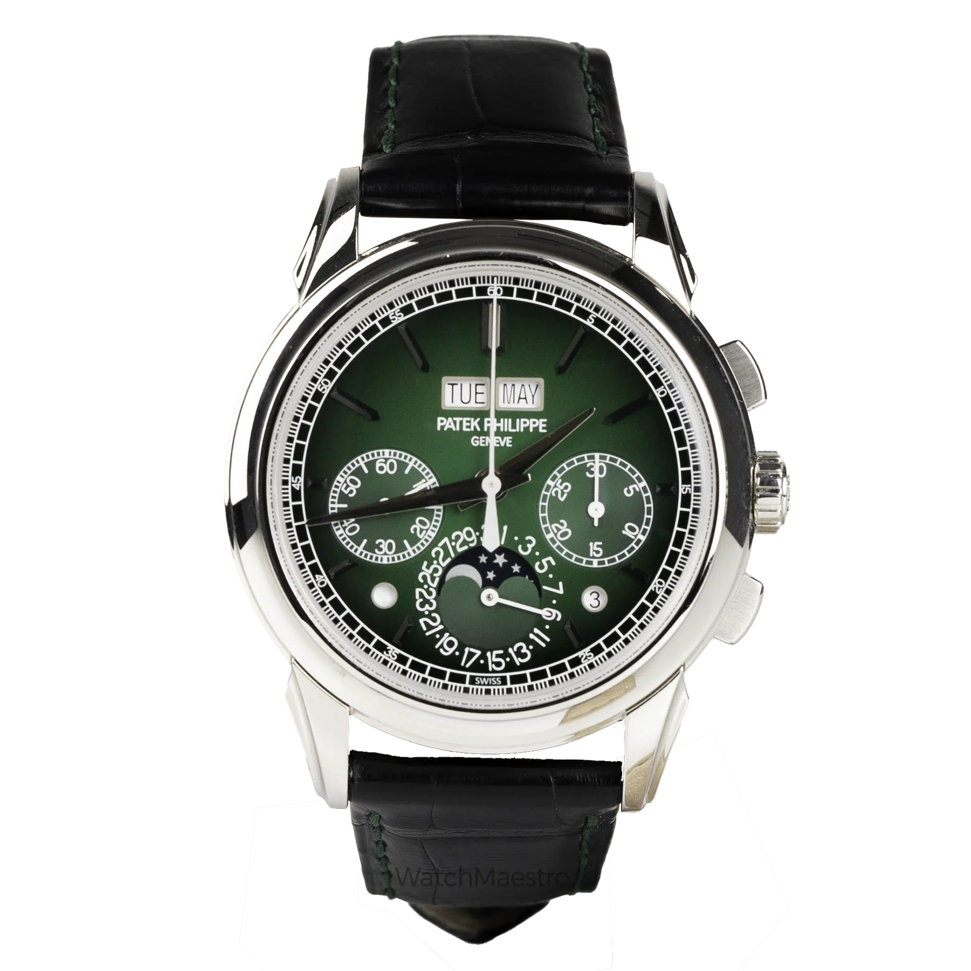 Indulge in the pinnacle of horology with the Patek Philippe Grand Complications reference 5270P. In a like-new condition, this 41mm masterpiece redefines luxury and precision. The lavish Lacquered Green Dial, encased within a Platinum Case, captivates with its rich color and intricate detailing. This exceptional watch sits on an Alligator leather strap, offering both comfort and a touch of style. Purchased in 2022, this Patek Philippe Grand Complications arrives with its original box and papers, ensuring authenticity. There is a lot going on with this watch as it offers a Chronograph function along with a Perpetual Calendar. On top of that, the watch also gets a Moonphase indicator, making it one of the most complicated and feature-rich mechanical watches out there.