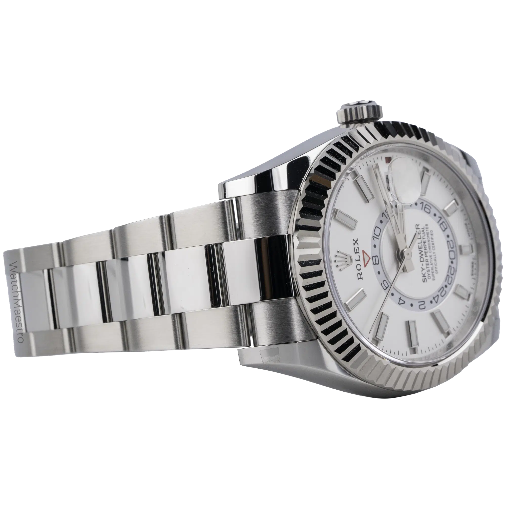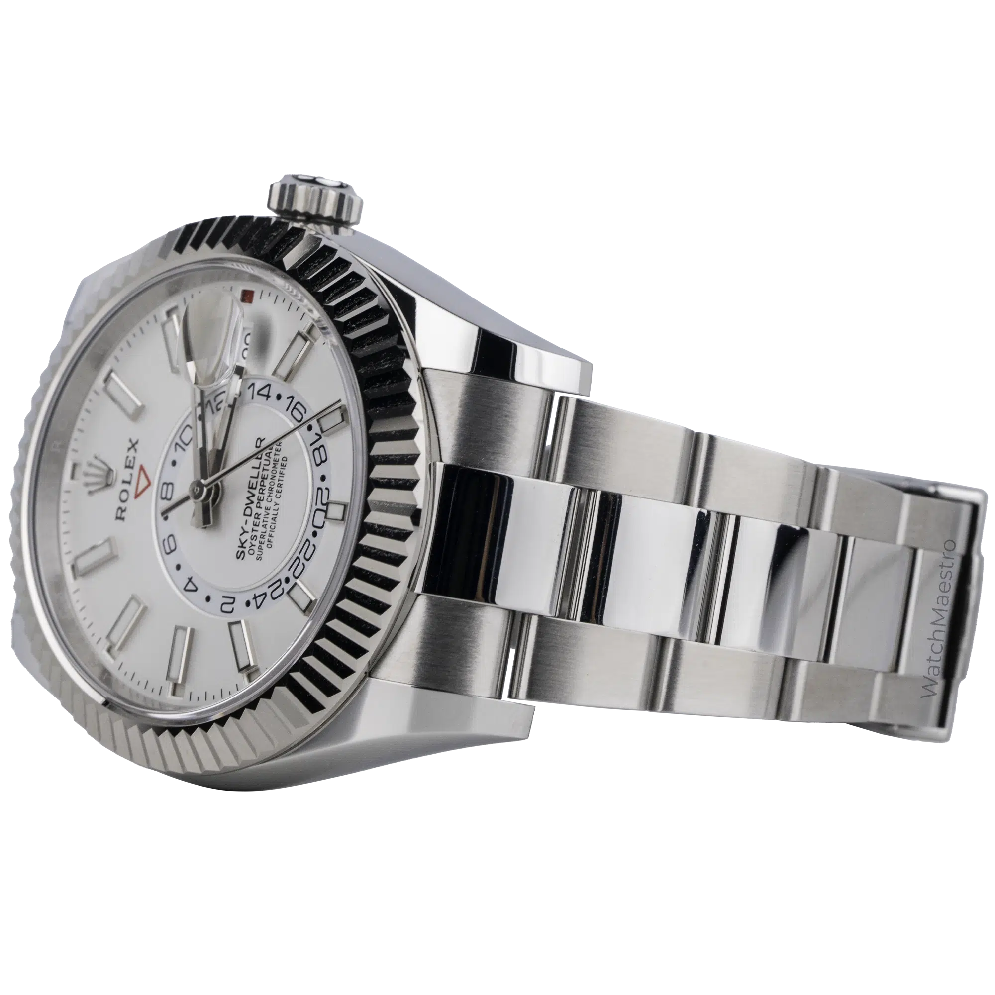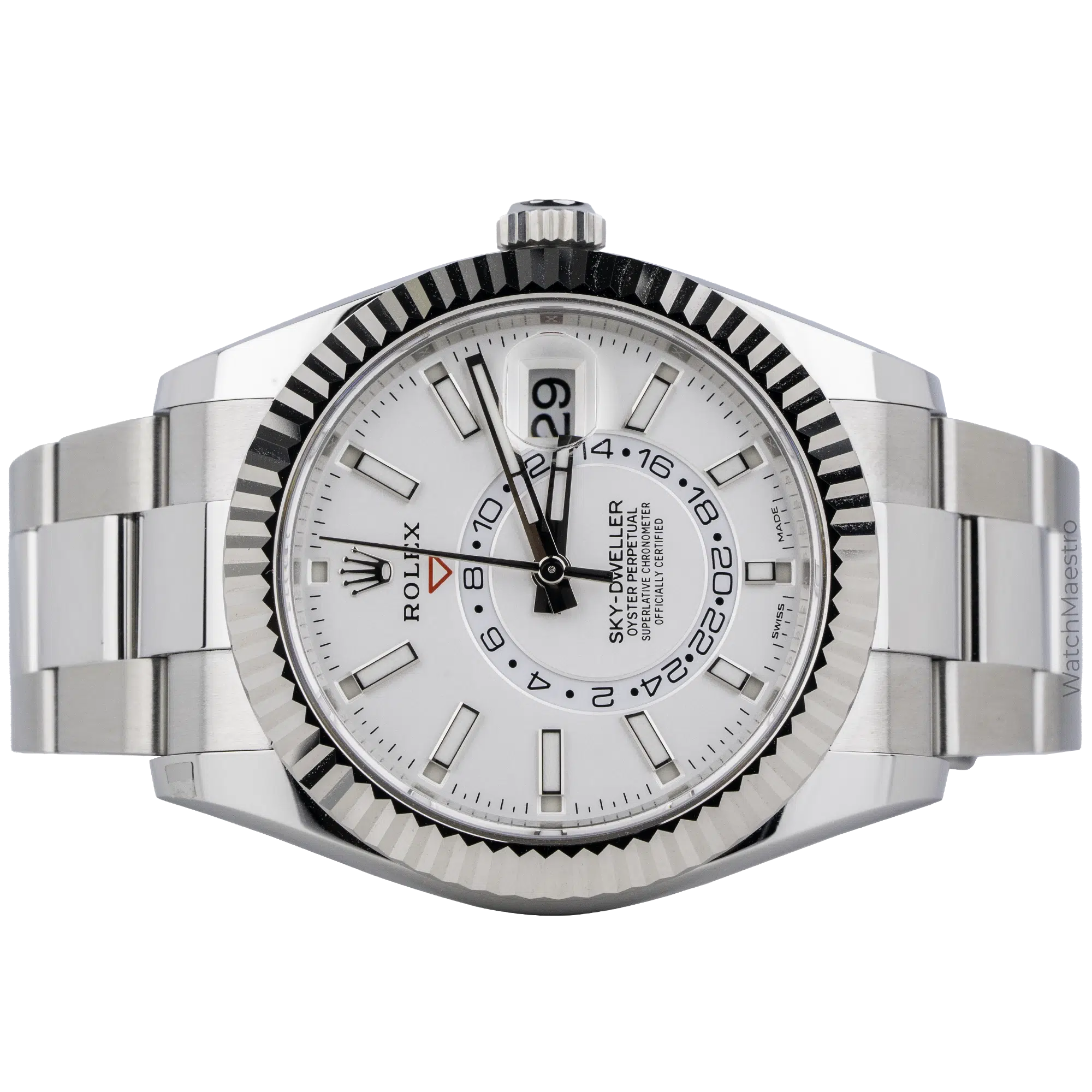 The most complicated Rolex ever produced – the Rolex Sky-Dweller is here in a mesmerizing White Dial. The 42mm Stainless Steel case of the watch sits on an Oyster bracelet. This Rolex reference 326934 also gets a White Gold Fluted bezel. Purchased in 2022, the watch has never been worn before, making it a brand-new piece. The watch comes complete with box and papers assuring its authenticity further.