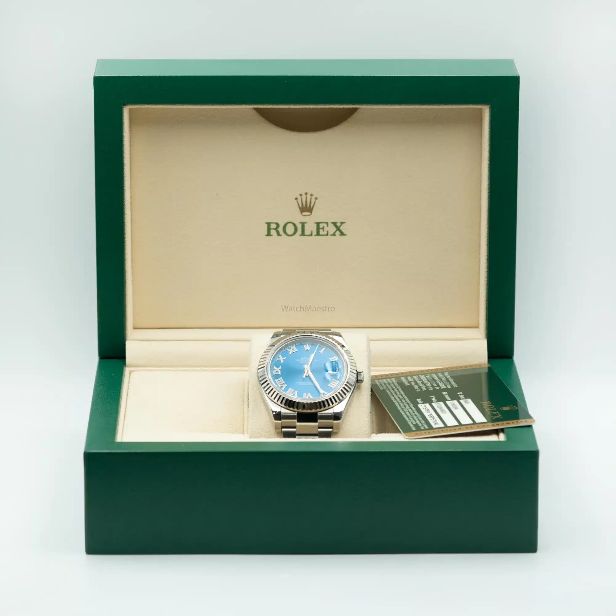 This is a pre-owned Rolex Datejust II 41mm sitting on an Oyster bracelet. Purchased in 2015, the watch features a stunning Blue dial with Roman numerals on it. The watch comes complete with box and papers, and it is still in great condition.