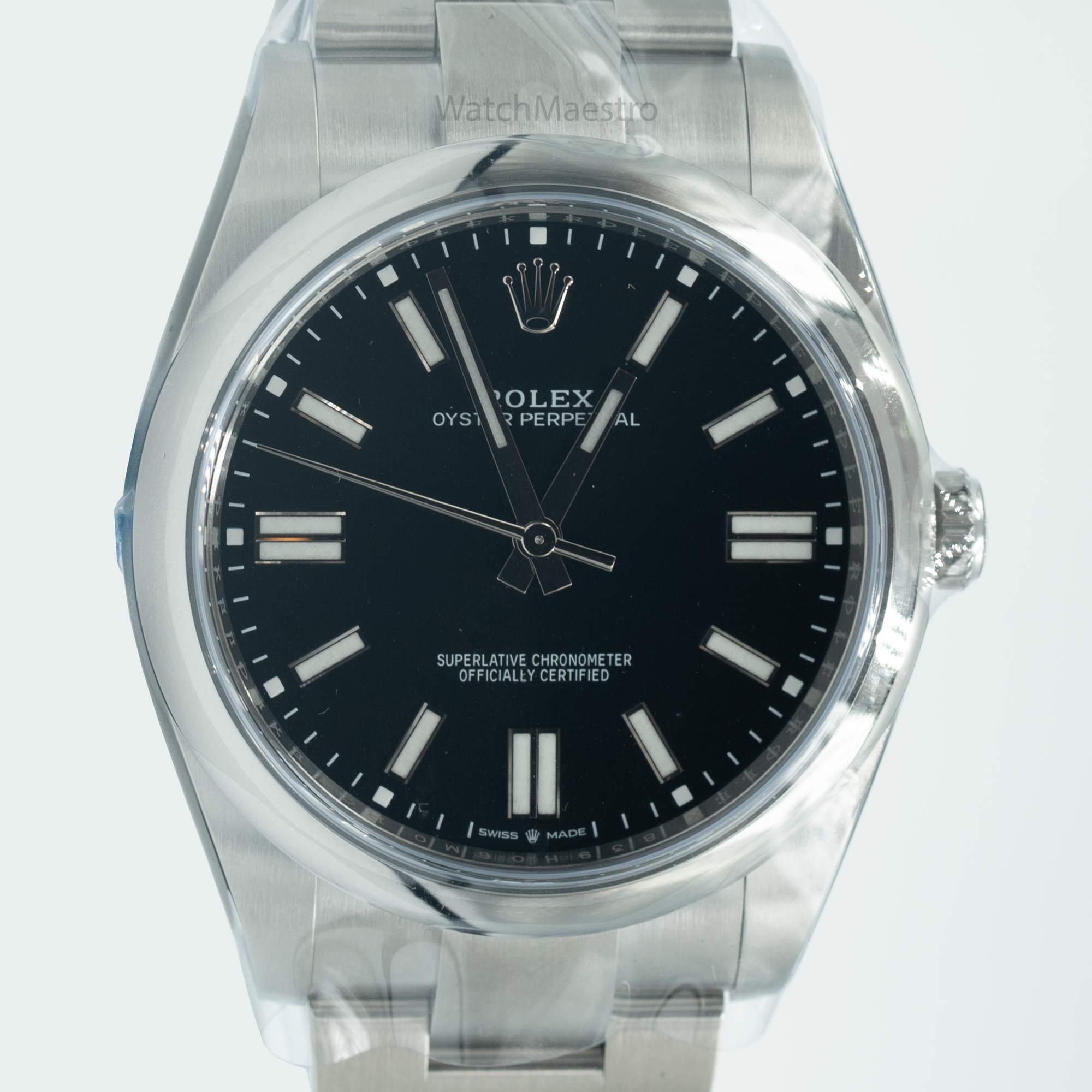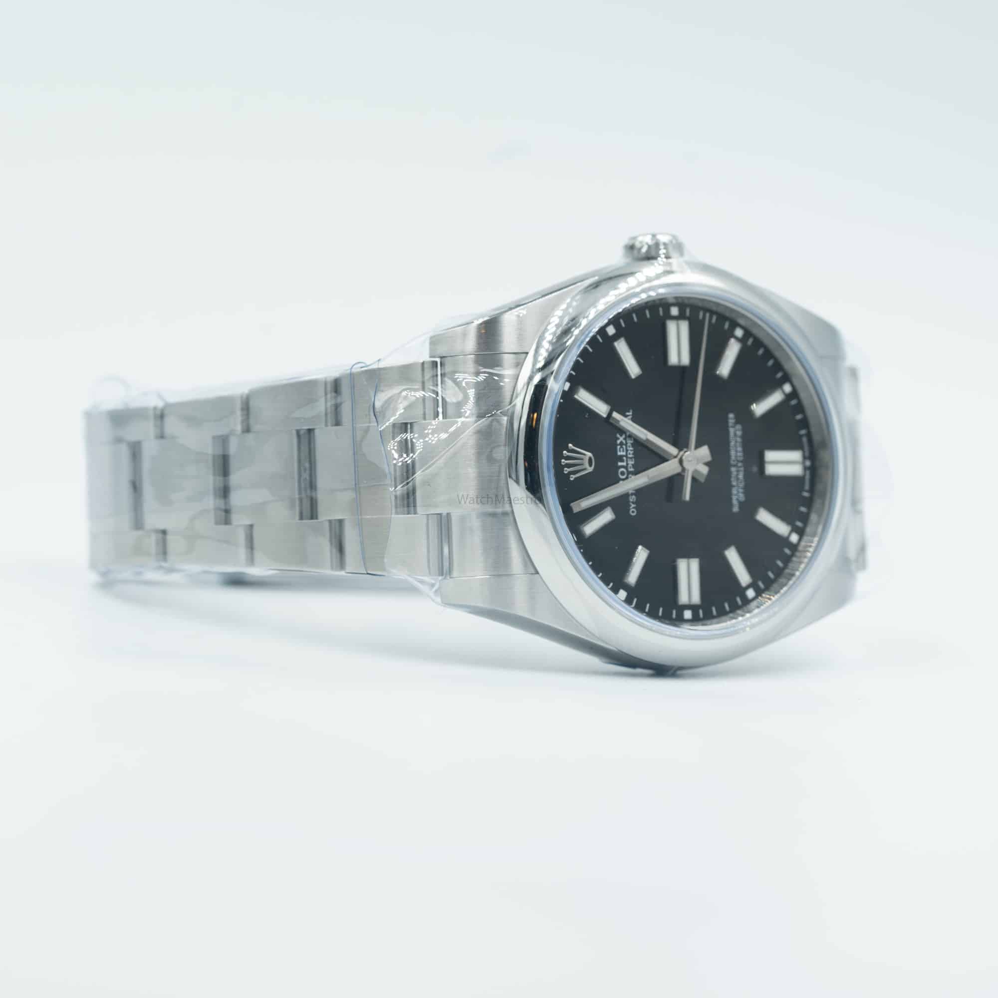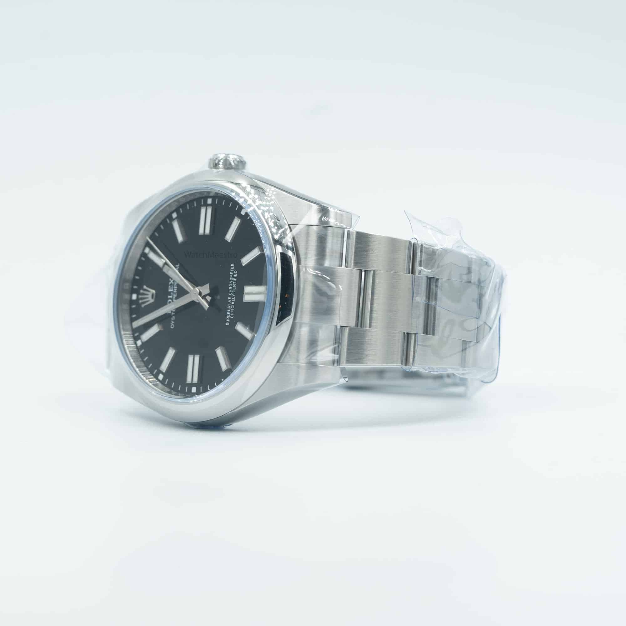 This is a brand-new Rolex Oyster Perpetual with a 41mm Black Dial. The combination looks stunning and is hard to find. The timepiece was purchased in 2022 and comes complete with box and papers. It features a domed bezel and a sporty-looking Oyster bracelet.
